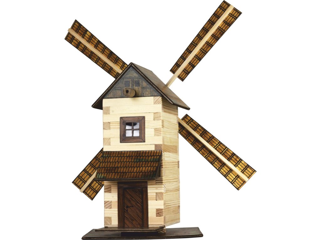 Dřevěná slepovací stavebnice Walachia - Větrný mlýn. Slepovací stavebnice Walachia jsou dřevěné modely domečků a staveb z Valašského kraje v měřítku 1:32. Základem jsou dřevěné hranolky 9x9 mm a k tomu jsou v sadě vždy všechny papírové doplňky - okna, dveře, střešní části atd. Pro lepení se používá lepidlo Herkules, není však součástí stavebnice. Přiložený je montážní návod a malé kapitoly z historie lidové architektury.Níže je označení obtížnosti číslem 1 - 5, přičemž 1 je nejlehčí. Rozměry: 14 x 10 x 32 cm Počet dílů stavebnice: 137 Obtížnost: 3
