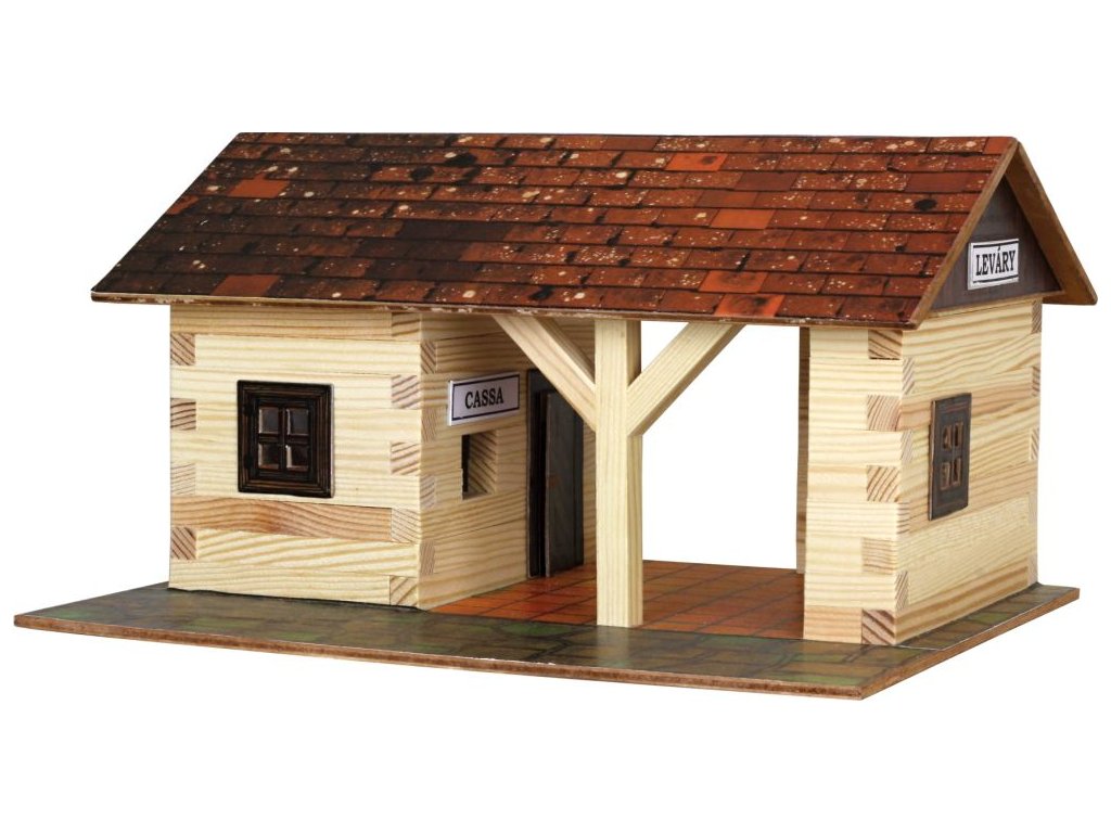 Dřevěná slepovací stavebnice Walachia - Železniční stanice. Slepovací stavebnice Walachia jsou dřevěné modely domečků a staveb z Valašského kraje v měřítku 1:32. Základem jsou dřevěné hranolky 9x9 mm a k tomu jsou v sadě vždy všechny papírové doplňky - okna, dveře, střešní části atd. Pro lepení se používá lepidlo Herkules, není však součástí stavebnice. Přiložený je montážní návod a malé kapitoly z historie lidové architektury. Níže je označení obtížnosti číslem 1 - 5, přičemž 1 je nejlehčí. Rozměry: 24 x 17 x 13 cm Počet dílů: 115 Obtížnost: 3