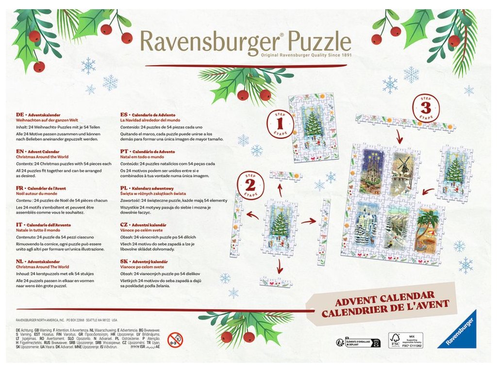 • 24 vánočních puzzle s 54 dílky, formát: 13,2 cm × 19,8 cm