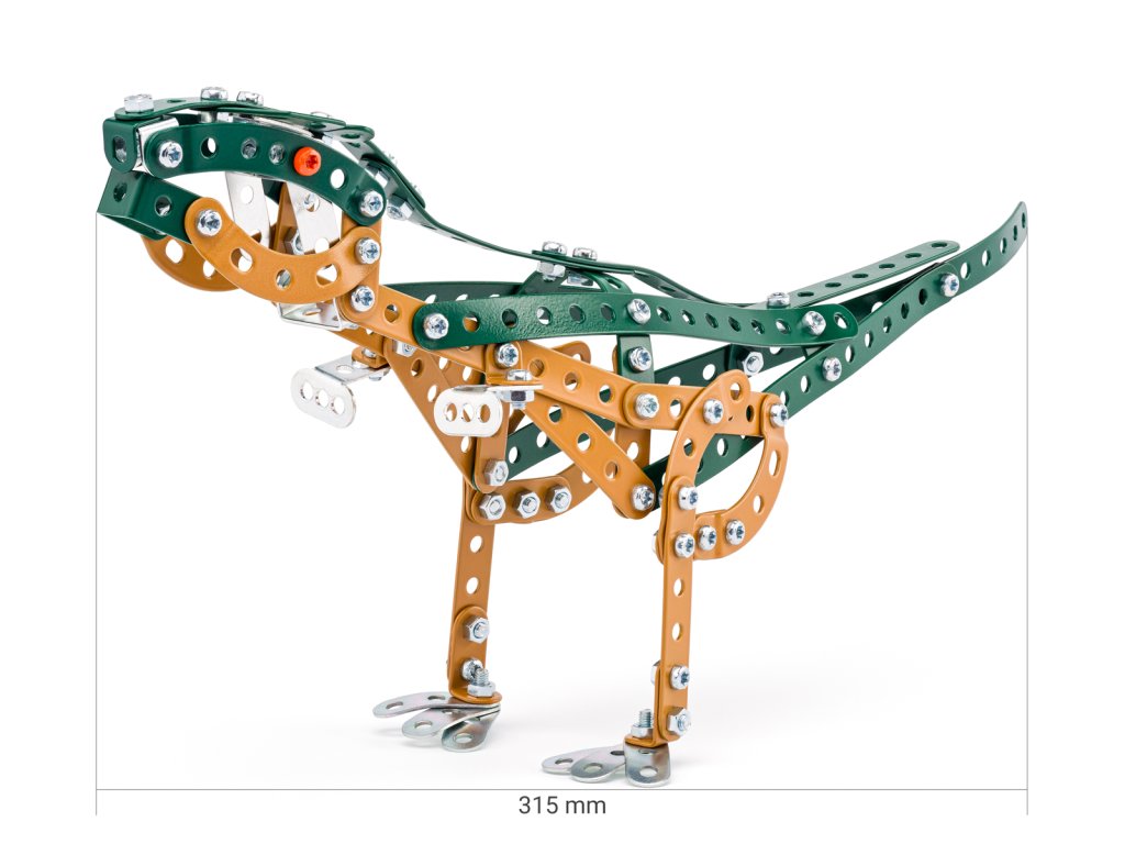 Dinosaurus Tyranosaurus Rex byl dvounohý masožravec s masivní lebkou vyváženou dlouhým, těžkým ocasem. Ve srovnání s velkými a silnými zadními končetinami byly přední končetiny tyranosaura krátké, ale extrémně silné a mely špičaté prsty. Byl to jeden z posledních dinosaurů, kteří existovali před vyhynutím v období křídy a paleogenu. Ponořte se do světa kreativity a zábavy se stavebnicí Tyranosaurus Rex od společnosti Merkur. Tato jedinečná sada je ideálním nástrojem pro rozvoj technických dovedností a představivosti dětí. Díky kovovým dílkům si malí stavitelé mohou postavit model dinosaura. Stavebnice obsahuje kvalitní kovové díly, které se snadno spojují šroubky, což podporuje rozvoj jemné motoriky, logického myšlení a soustředění. Sada obsahuje: 189 dílků. Úroveň Merkur obtížnosti: 3. Baleno v krabičce. Rozměry modelu: 9 x 31,5 x 6 cm. Rozměry balení: 18 x 13 x 5,5 cm. Nevhodné pro děti do 3 let. Věk: 5+