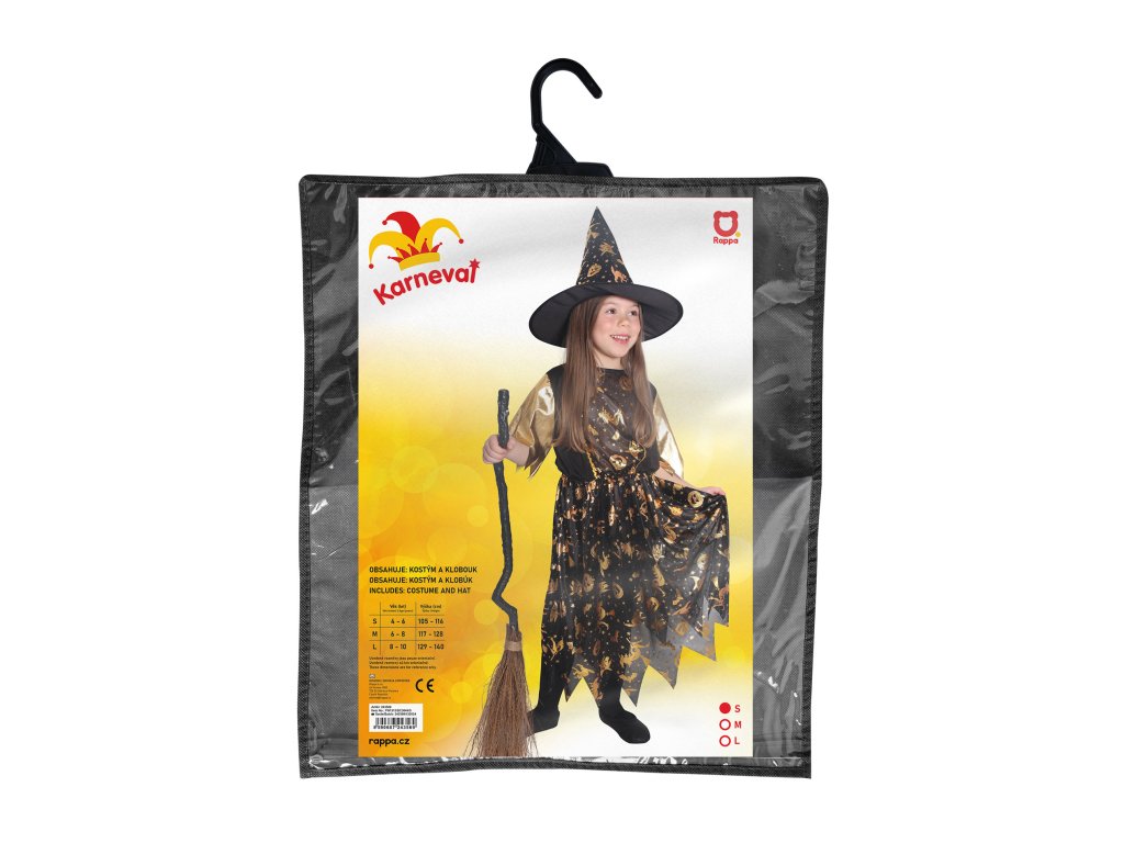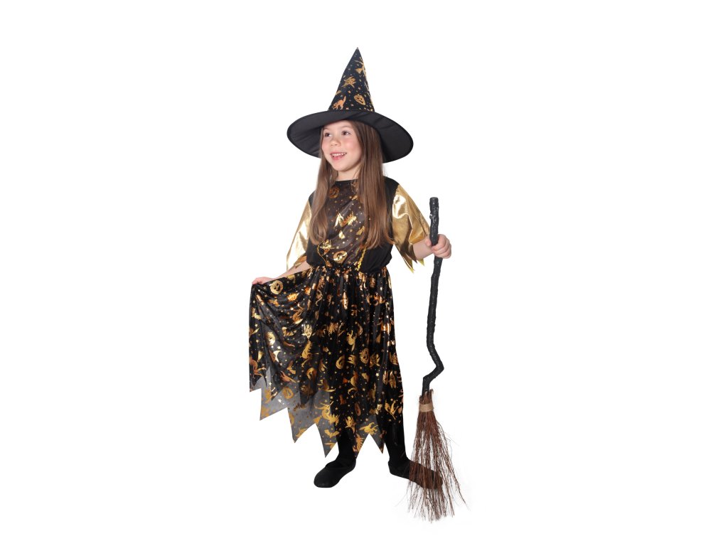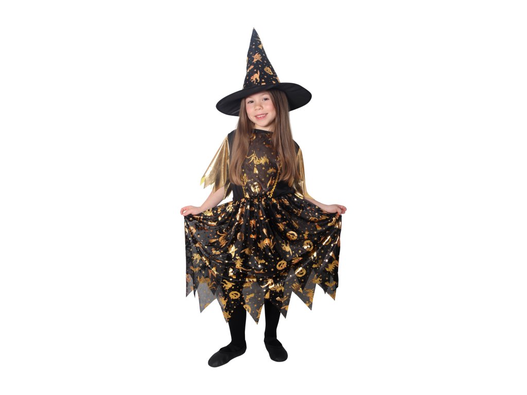Dětský kostým čarodějnice černo-zlatá s kloboukem (S)