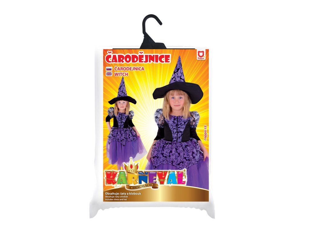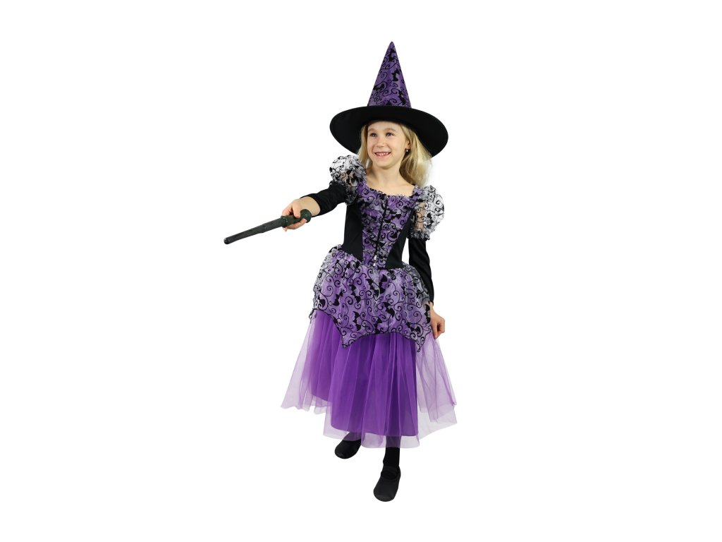 Nádherný kostým pro všechny malé čarodějnice! Kostýmek o velikosti M je určen pro holčičky ve věkovém rozmezí 6-8 let (117-128 cm). Fialové šaty s nadýchanou sukní a tříčtvrtečním rukávem jsou zdobeny černým netopýřím vzorem. Součástí balení je také perfektně sladěný, stejně zdobený klobouk. Skvěle se hodí i na oslavu Halloweenu!