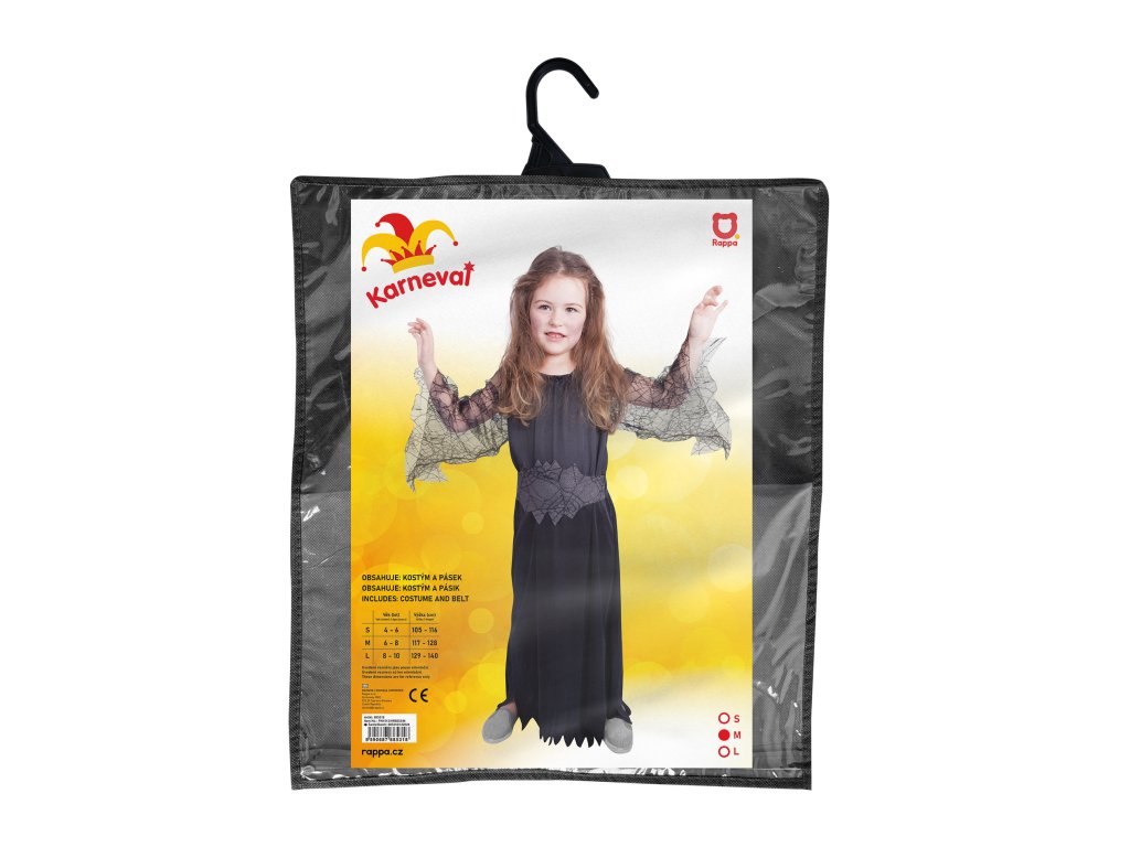 Kostým pro malé čarodějnice! Kostým černé barvy ve velikosti M je určen pro holčičky ve věkovém rozmezí 6-8 let (116-128 cm). Šaty jsou dekorovány průhlednými rukávy s motivem pavučin. S tímto úchvatným kostýmem budeš vypadat jako pravá čarodějka! Skvěle se hodí i na oslavu Halloweenu!
