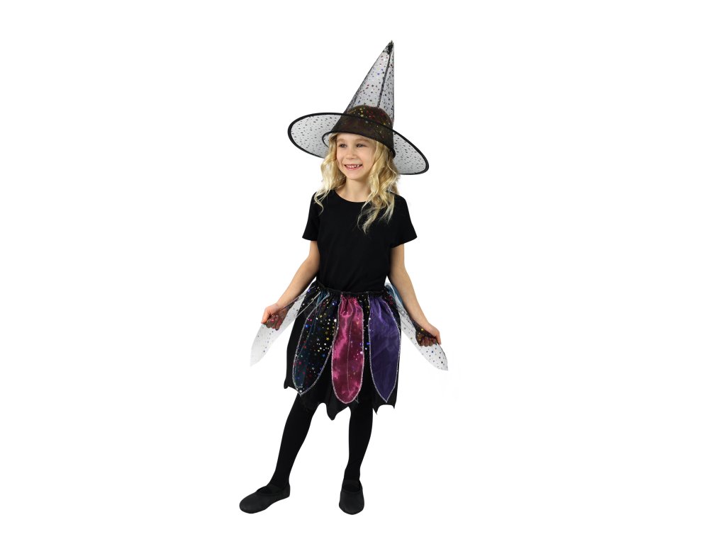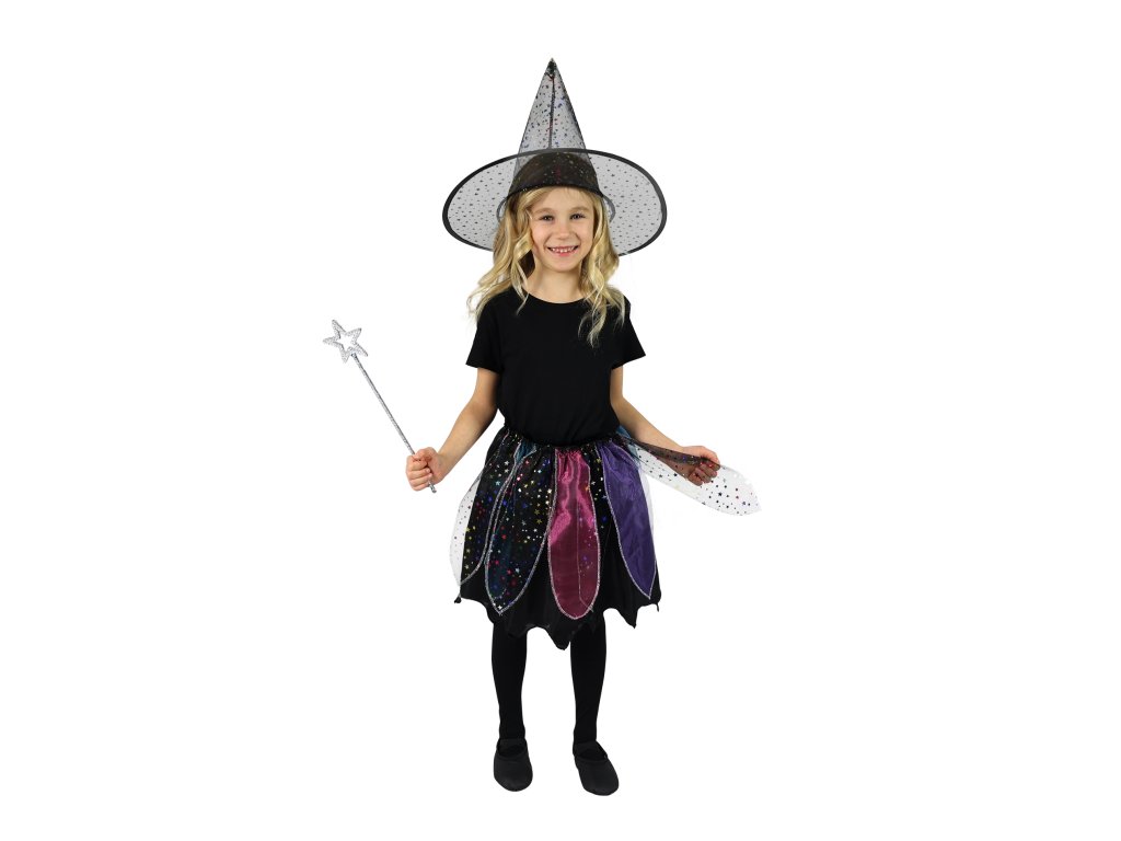 Magická sukýnka pro malé čarodějnice! Kostýmek černé barvy zdobený barevným dekorem je určen pro holčičky ve věkovém rozmezí 3-7 let. Balení obsahuje nadýchanou sukničku a k tomu perfektně sladěný klobouk. Sukně je v pase na gumičku a její délka je 35 cm. Vhodný i na oslavu Halloweenu.