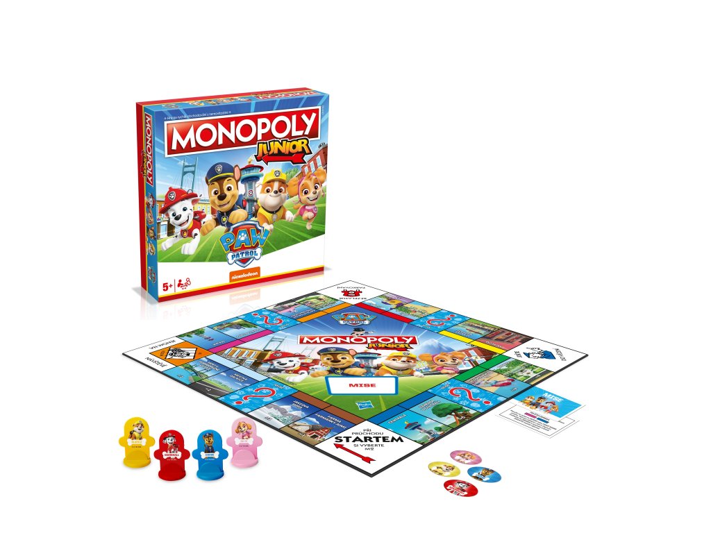 Monopoly Junior Paw Patrol CZ. Hrací deska, 4 exkluzivní figurky, 24 karet mise, 36 značek Prodáno, 70 ks bankovek MONOPOLY Junior, 1 hrací kostka a pravidla hry.
