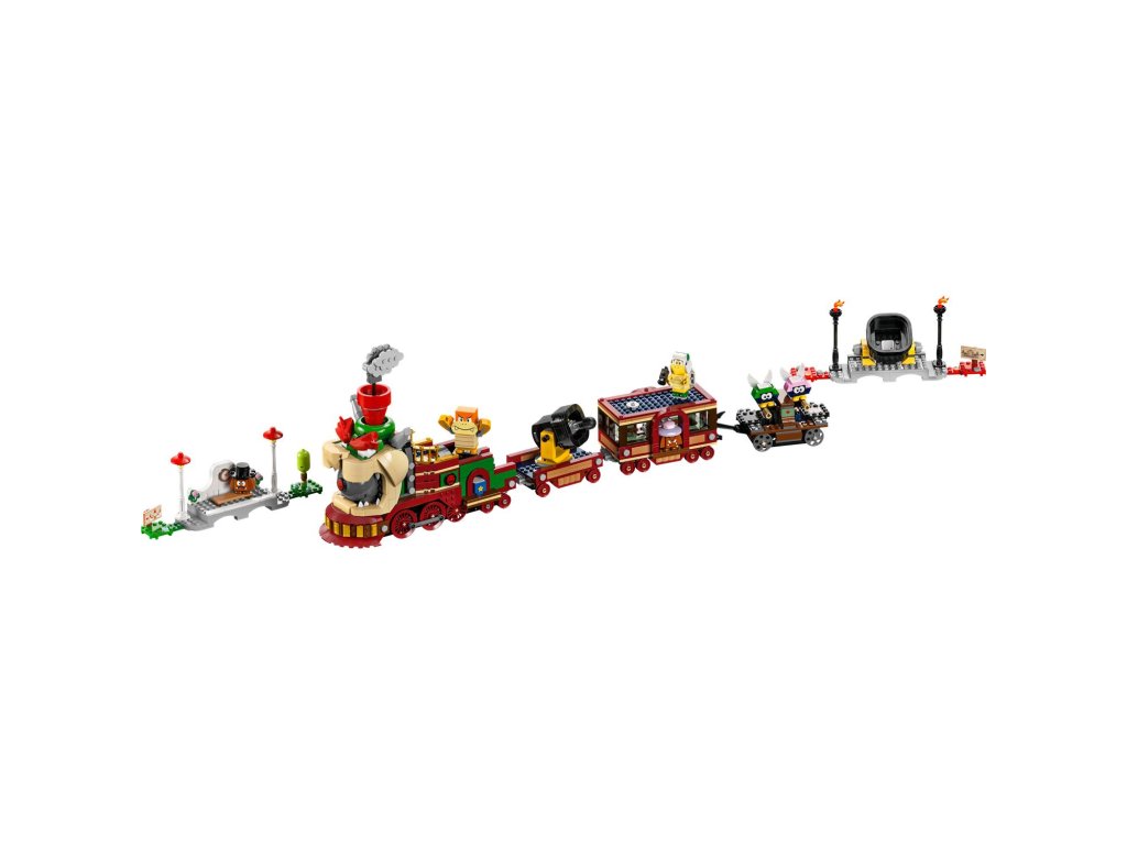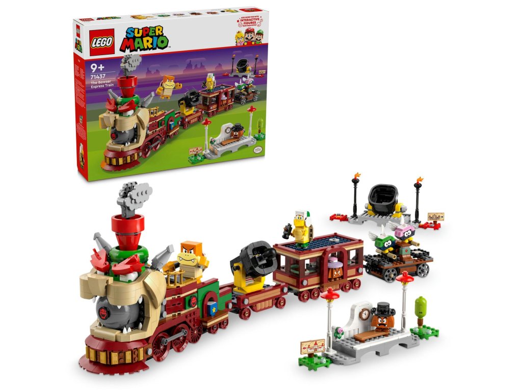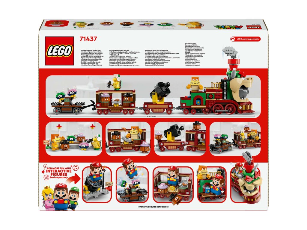 S modelem LEGO® Super Mario™ (71437) Bowserův rychlík se můžete pustit do akčních jízd! Tato dobrodružná dětská stavebnice Nintendo® představuje skvělý dárek pro kluky, holky a milovníky videoher od 9 let a součástí je propracovaný vláček, drezína, 2 stanice, akční kostka Super Star, akční kostka s otazníkem a 6 figurek LEGO Super Mario – Hammer Bro, Boom Boom, 2 Goombaové a 2 Para-Biddybudové. Přidejte figurku LEGO® Mario™, LEGO® Luigi™ nebo LEGO® Peach™ (nejsou součástí balení) a užijte si s nimi porci interaktivního hraní. Naskočte s nimi do drezíny a pronásledujte spolu vlak, ovládejte otáčecí plošinu na lokomotivě a aktivujte pružinový vystřelovač dělového vagónu. Až všechny nepřátele porazíte, uslyšíte zvuk klaksonu, když budete v Bowserově rychlíku přijíždět na stanici. Návod na stavění najdete v krabici nebo v doprovodné aplikaci LEGO Super Mario, ve které najdete také kreativní nápady na stavění a hraní s tímto Nintendo setem. Rozměry – Tento set Bowserova rychlíku se skládá z 1 392 dílků a měří přes 22 cm na výšku, 68 cm na šířku a 12 cm do hloubky a lze ho zkombinovat s dalšími sety LEGO® Super Mario™ (prodávají se samostatně)