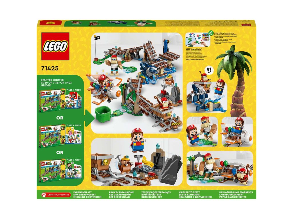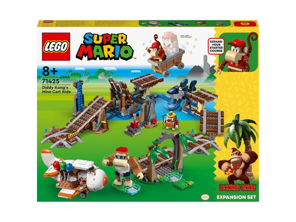 Postavte kultovní úroveň s Donkey Kongem ve světě LEGO® Super Mario™ z kostek s tímto rozšiřujícím setem Diddy Kongova jízda v důlním vozíku (71425). Posaďte figurku LEGO® Maria, LEGO® Luigiho nebo LEGO® Peach™ (nejsou součástí balení) do důlního vozíku a jezděte s ní po trati. Odstrčte Snaggles z cesty, opravte rozbitou část trasy, porazte Mole Minera a nechte „vybuchnout“ skálu, ve které se ukrývají banány k „snědku“ nebo jako dárek pro Funky Konga nebo Diddy Konga. Kupte si balónky z letadlového obchodu a „proleťte“ se letadlem, abyste získali více digitálních mincí. Poznámka: Pro interaktivní herní zážitek je zapotřebí některý ze startovacích setů 71360, 71387 nebo 71403.