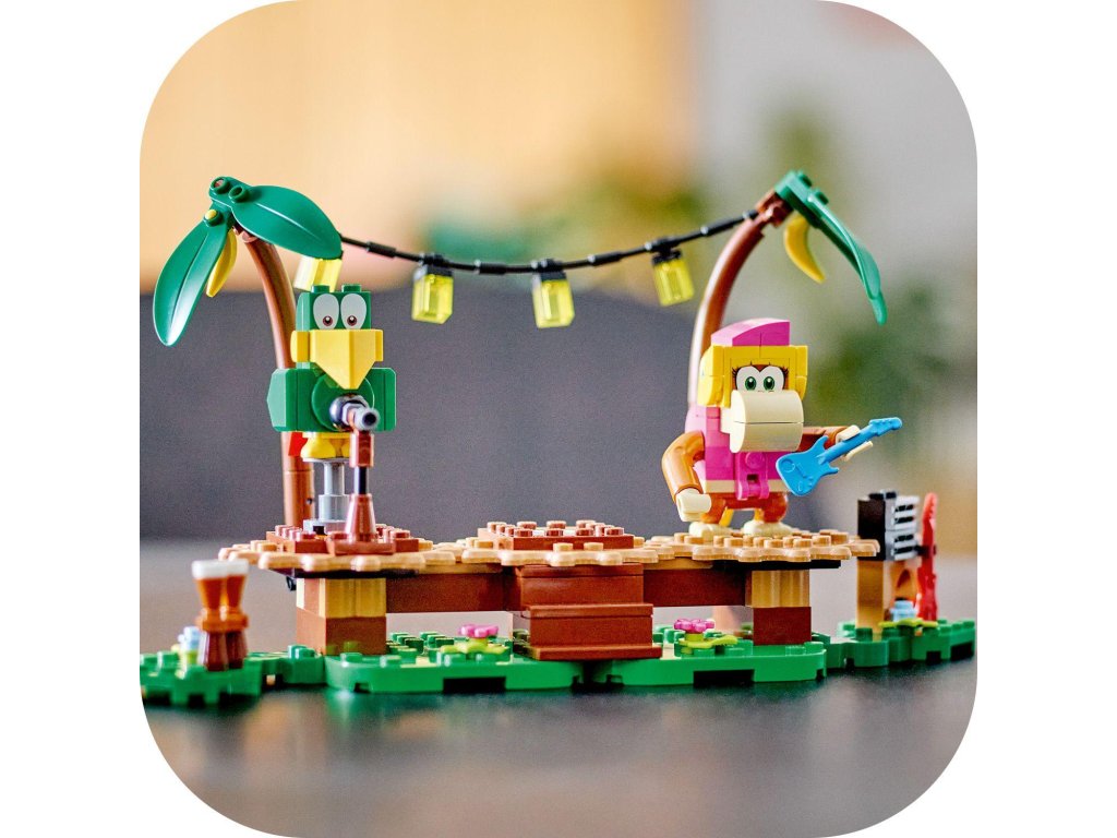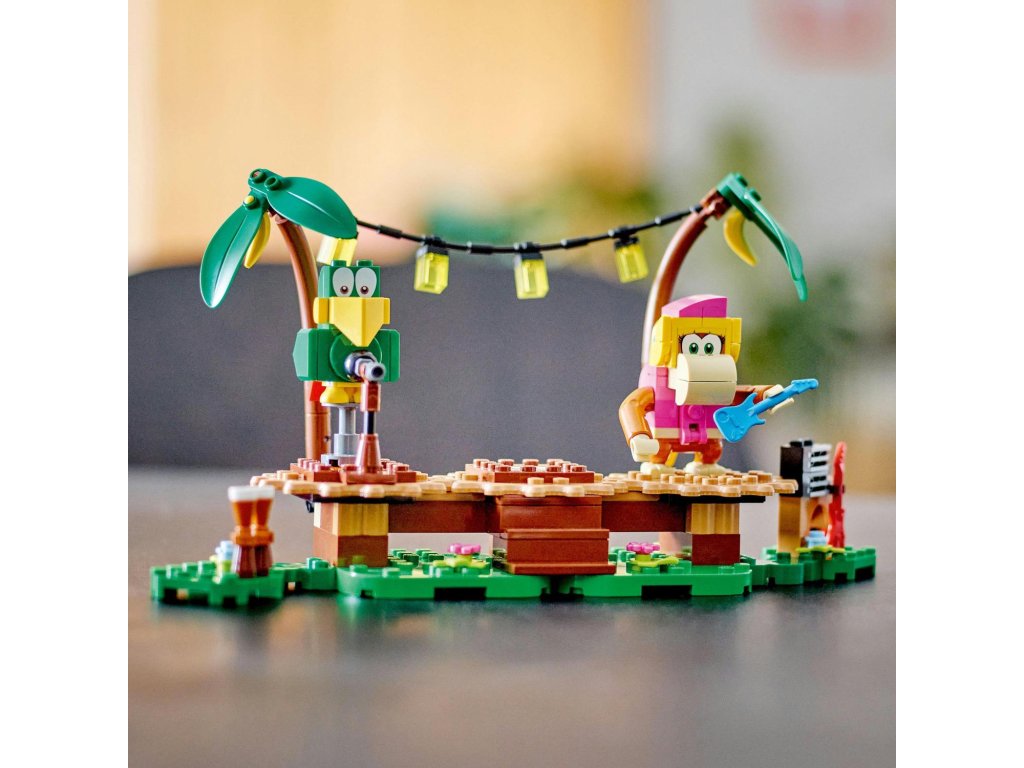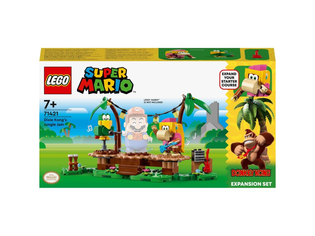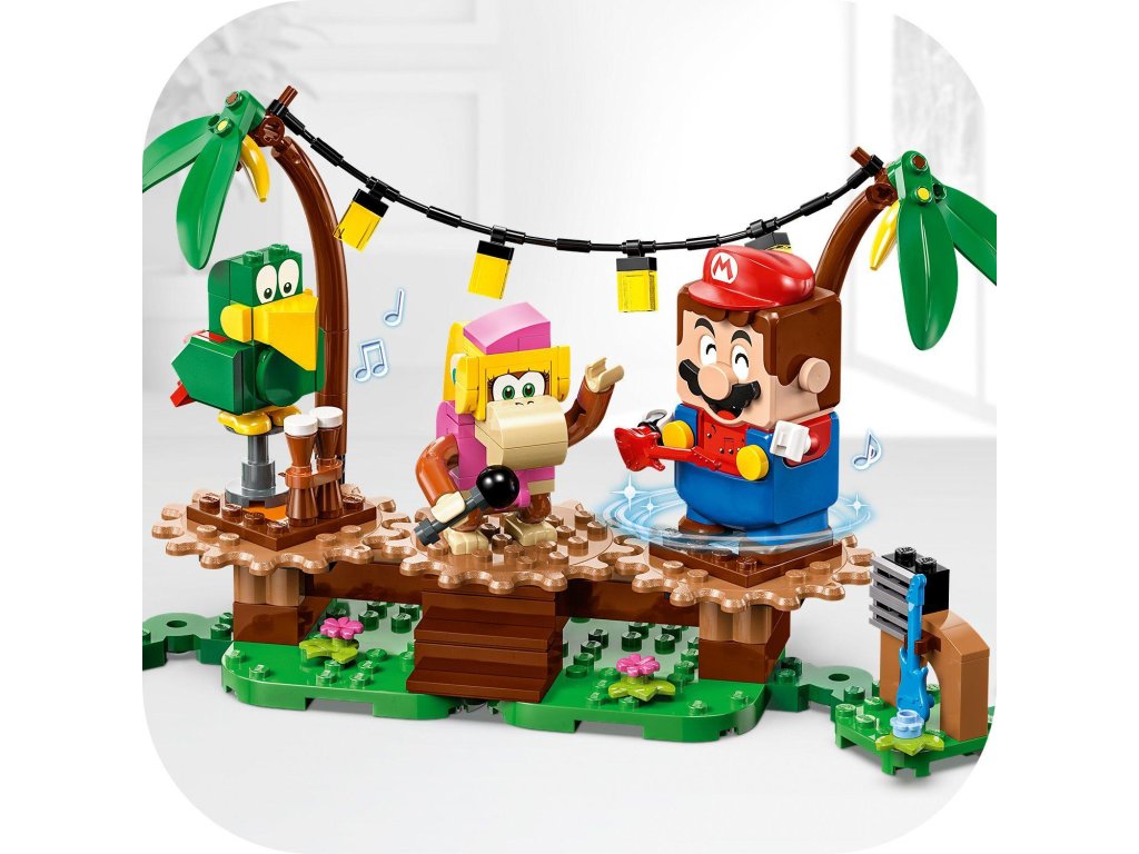 S tímto rozšiřujícím setem LEGO® Super Mario™ (71421) Dixie Kong a koncert v džungli se děti vydají za hudebním zážitkem do džungle, ve které žije Donkey Kong™. Součástí jsou figurky Dixie Kong a papouška Squawkse, sestavitelné pódium, scenérie džungle a hudební nástroje a vybavení. Umístěte doprostřed pódia figurky LEGO® Maria, LEGO® Luigiho a LEGO® Peach™ (figurky nejsou součástí balení), připojte je a propojená pódia se začnou otáčet a aktivují hudbu. Poznámka: Pro interaktivní herní zážitek je zapotřebí některý ze startovacích setů 71360, 71387 nebo 71403.