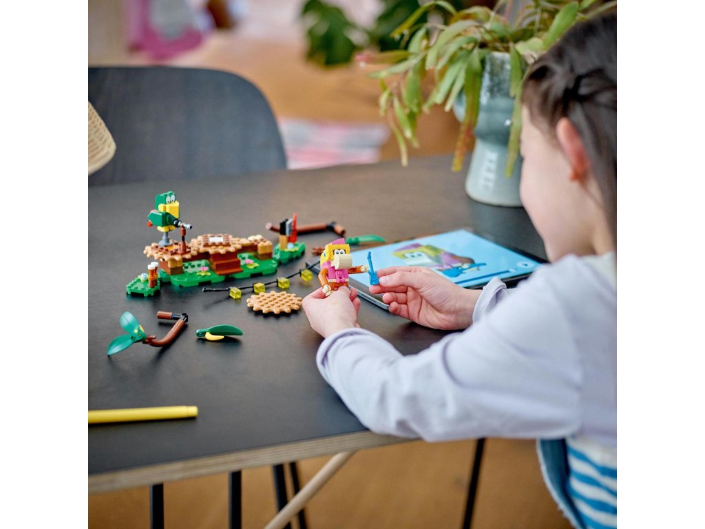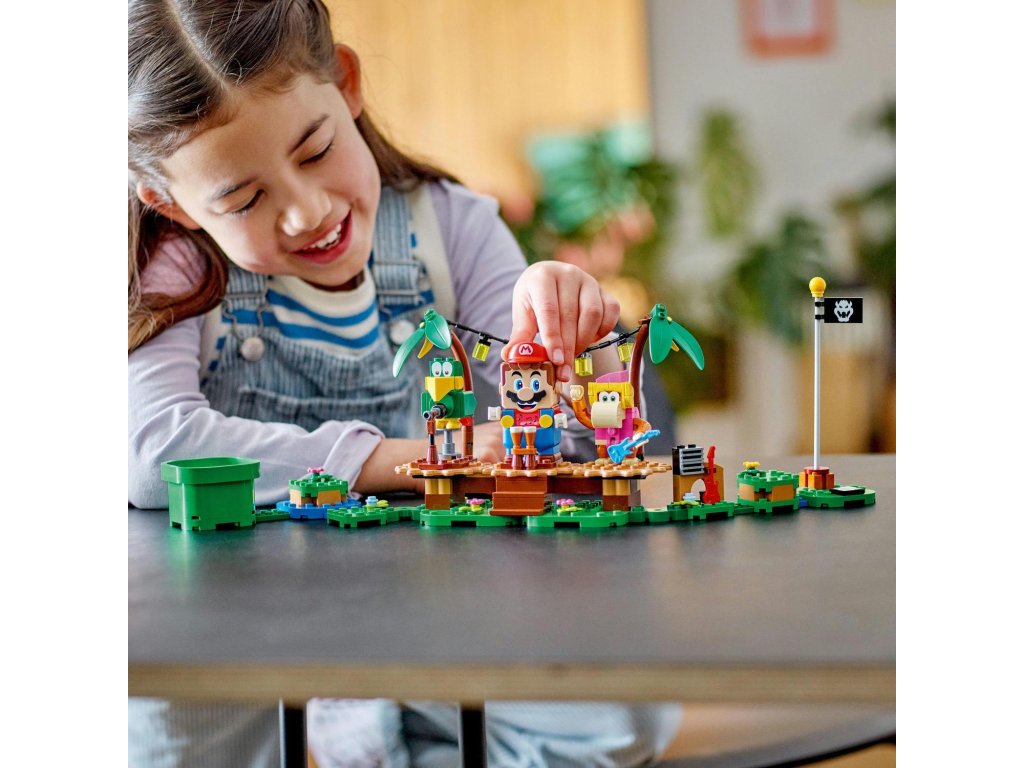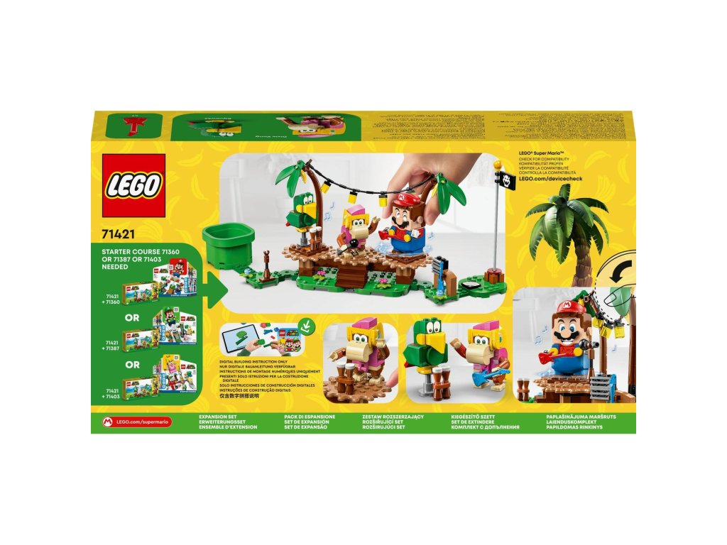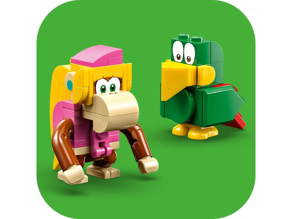 S tímto rozšiřujícím setem LEGO® Super Mario™ (71421) Dixie Kong a koncert v džungli se děti vydají za hudebním zážitkem do džungle, ve které žije Donkey Kong™. Součástí jsou figurky Dixie Kong a papouška Squawkse, sestavitelné pódium, scenérie džungle a hudební nástroje a vybavení. Umístěte doprostřed pódia figurky LEGO® Maria, LEGO® Luigiho a LEGO® Peach™ (figurky nejsou součástí balení), připojte je a propojená pódia se začnou otáčet a aktivují hudbu. Poznámka: Pro interaktivní herní zážitek je zapotřebí některý ze startovacích setů 71360, 71387 nebo 71403.