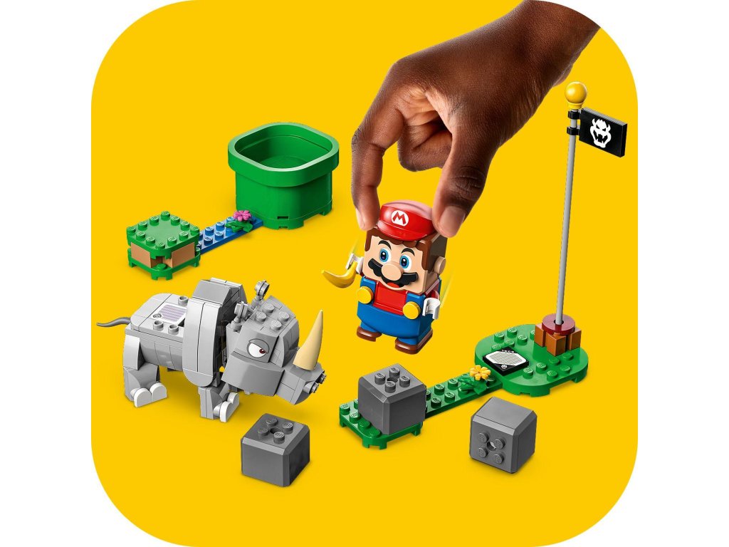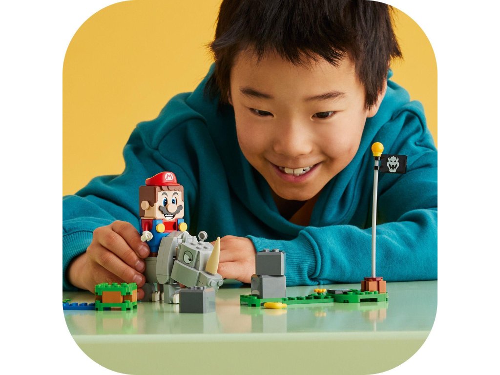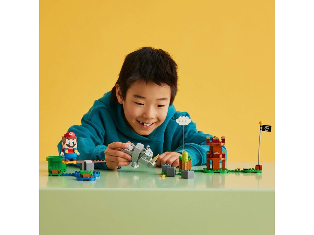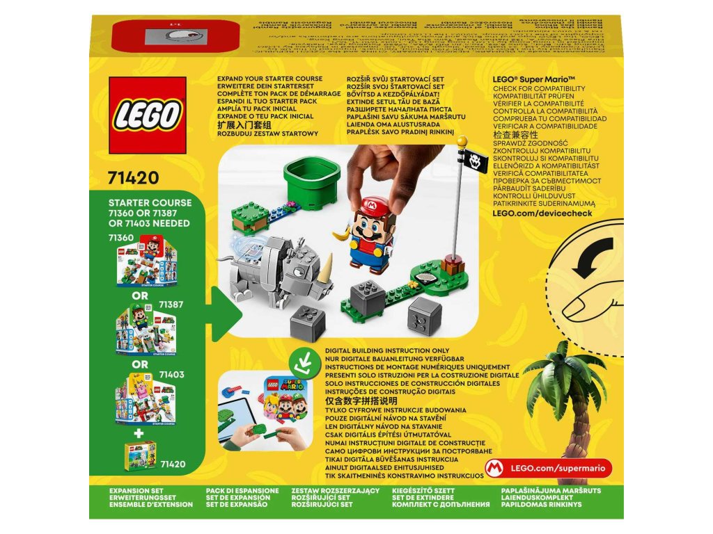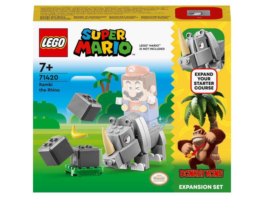 Připravte se na dobrodružství s rozšiřujícím setem LEGO® Super Mario™ (71420) Nosorožec Rambi – rozšiřující set pro děti od 7 let. Obsahuje figurku Rambiho z kostek LEGO®, na které mohou jezdit interaktivní figurky LEGO® Mario™, LEGO® Luigi™ nebo LEGO® Peach™ (nejsou součástí balení). Když Rambi chodí, běží proti vrstvitelným prvkům kamenů a jinak se hýbe, aktivují se zvukové efekty interaktivní figurky. Poznámka: Pro interaktivní herní zážitek je zapotřebí některý ze startovacích setů 71360, 71387 nebo 71403.