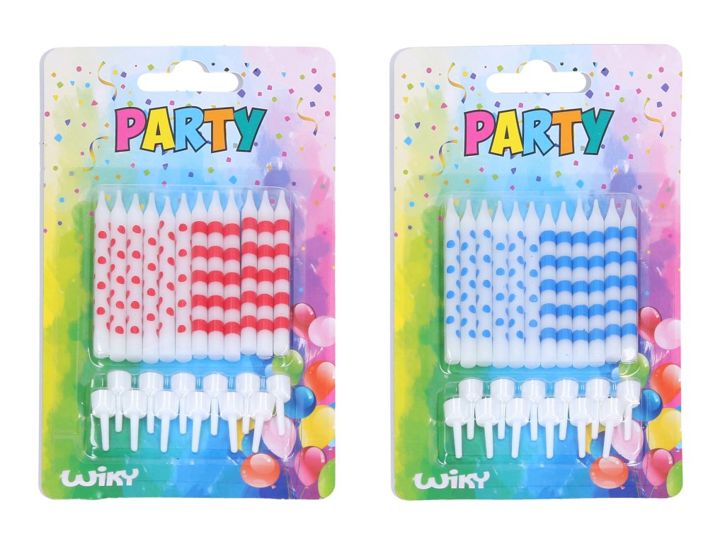 Balení 12 ks svíček s puntíky a proužky + stojánků Barevné varianty - červená, modrá