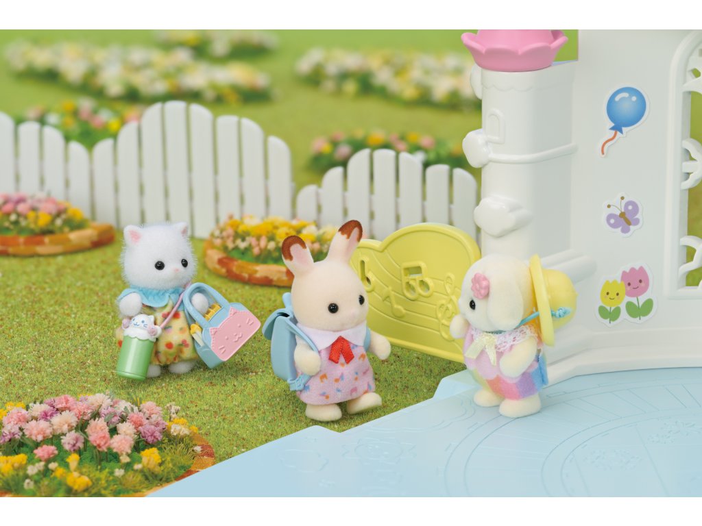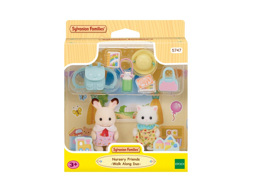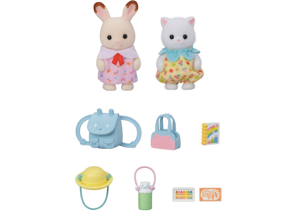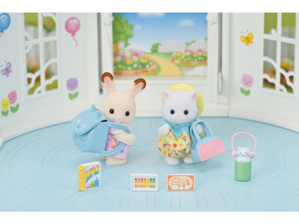 Tato sada obsahuje doplňky, jako je batoh, čepice a láhev na vodu – vše, co miminka potřebují na procházku do školky. Miminka mají na sobě roztomilé, barevné oblečení. Miminka mohou nosit a držet batoh, tašku, láhev s vodou a čepici. Pastelky a skicák lze vložit do batohu nebo tašky. Dítě čokoládového králíka Creme a dítě perské kočky Ryan. Věk: 3+