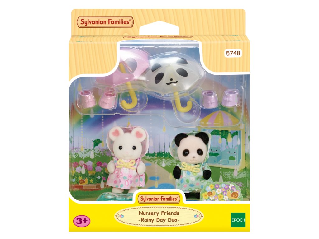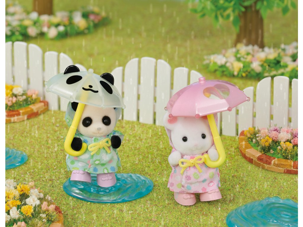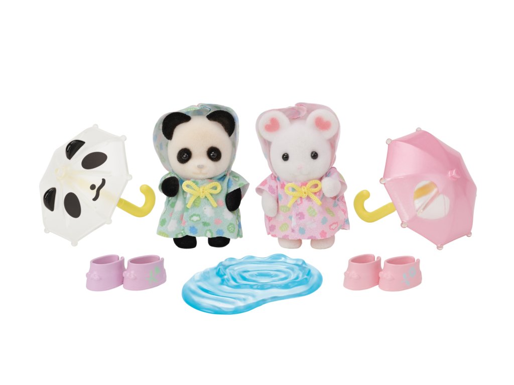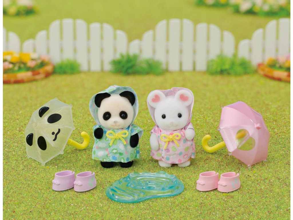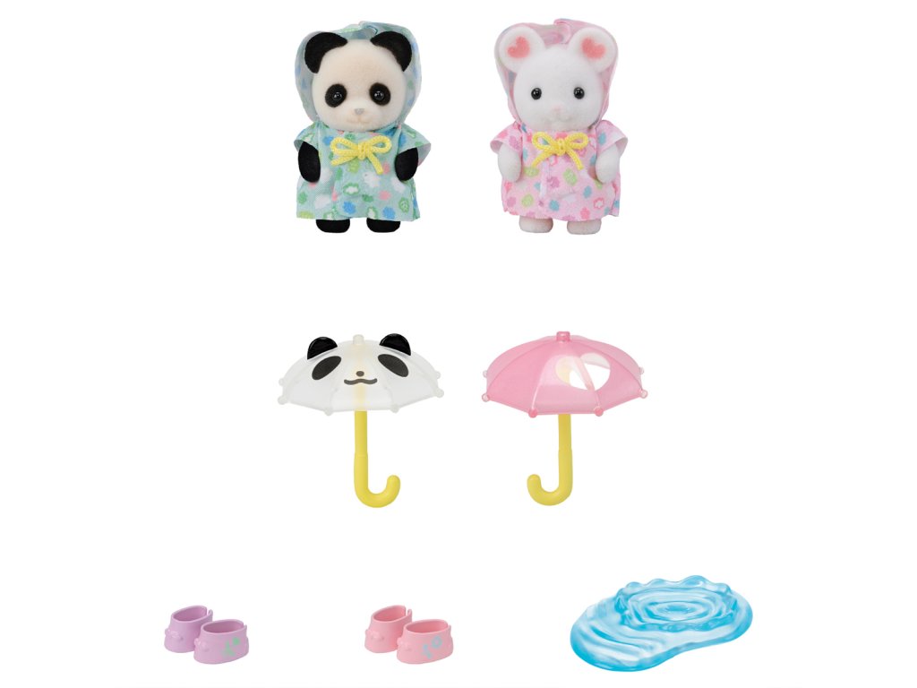 Tato dvě rozkošná miminka Sylvanian Families jsou perfektní duo pro deštivý den a rádi se cákají v kalužích! Procházky v deštivý den jsou pro přátele, miminko Pookie pandu Angelu a miminko Marshmallow myšku Alberta, oblečené do svých nových rozkošných pláštěnek s kapucí. Sada také obsahuje dva roztomilé malé deštníky, které perfektně padnou do tlapek dětí, dva páry gumových holínek a dokonce i loužičku na skákání! Věk: 3+