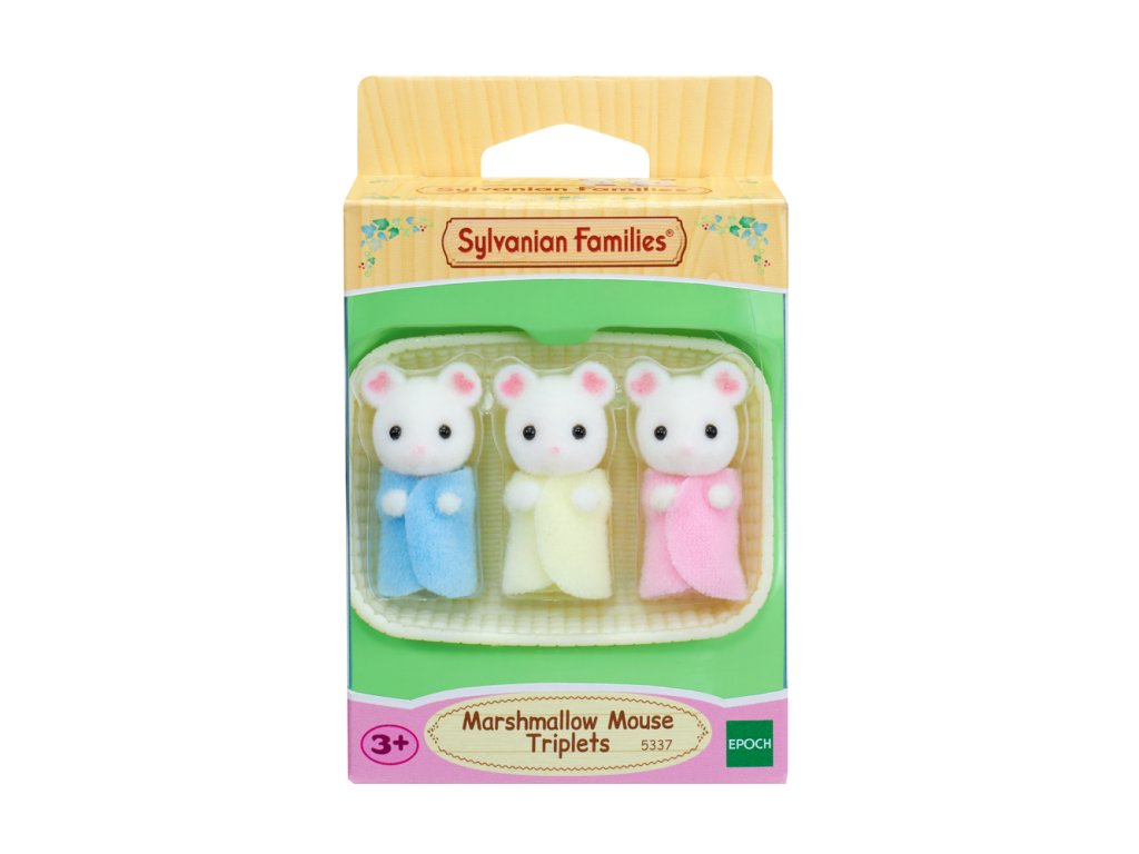 Baby Marshmallow myšky trojčata jsou neuvěřitelně roztomilá miminka. Sada obsahuje trojčátka a kolébku. Figurky jsou vyrobeny z plastu, který je potažený jemňoučkým sametem. Očička jsou z černých korálků. Všechny končetiny jsou pohyblivé a hlavička otáčecí. Oblečení je vyrobeno tak, aby se dalo opakovaně svlékat a oblékat. Rozkošné Marshmallow trojčátka jsou charakteristická svými okvětními plátky v uších. Jedná se o první trojčátka z rodin Sylvanian. Všechny tři děťátka můžete uložit ke spinkání do nádherné kolébky. Užijte si ještě více zábavy s rodinkou Marshmallow myšek (5308, prodejné samostatně) a Baby Marshmallow myškou (5336, prodejná samostatně). Kombinujte s domečky, nábytkem a hra se stane ještě zábavnější (prodejné samostatně). Produkt obsahuje: 3x Baby Marshmallow myšky (modrou, žlutou a růžovou), kolébku. Věk: 3+.