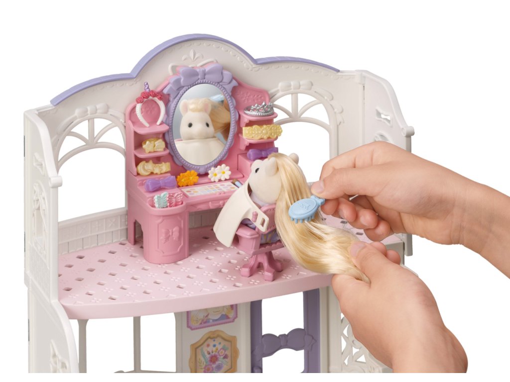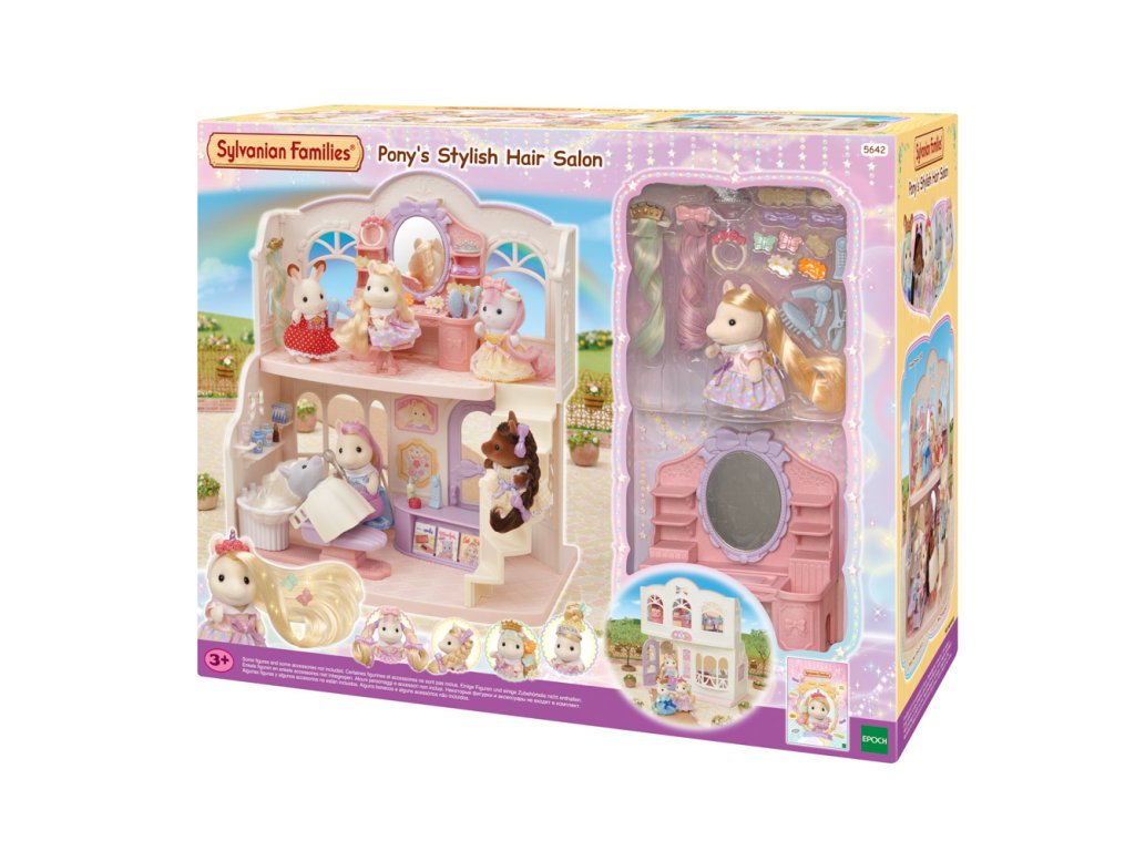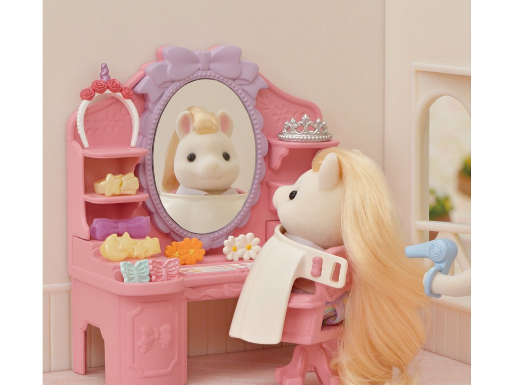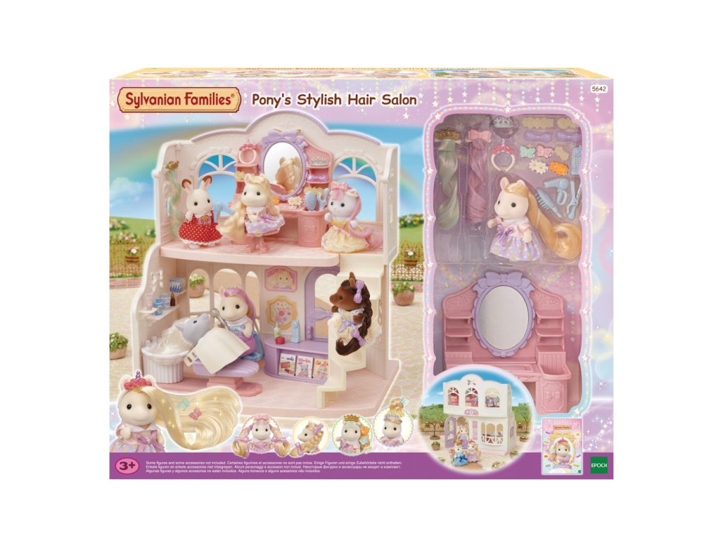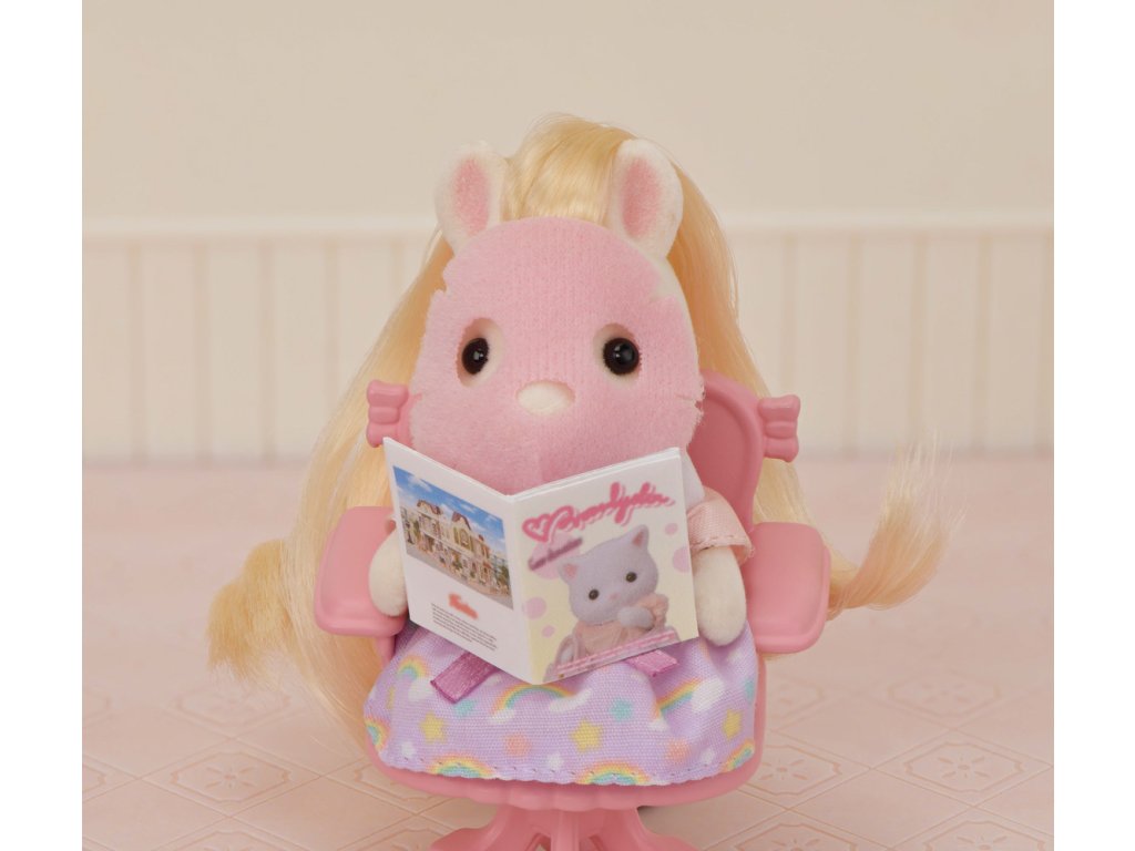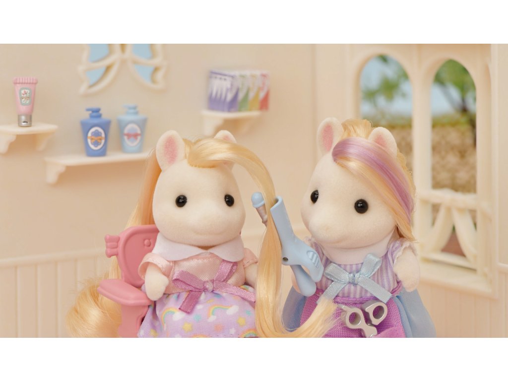 Sada Kadeřnický salón pro poníky obsahuje nádherný kadeřnický salon a hedvábnou poníkovou dívku Sally. Zahrnuje doplňky pro hru na vlasy a make-up. Za pomoci vlasových doplňků a knihy o vlasovém stylingu upravte vlasy dívky Sally různými způsoby. Tato sada obsahuje budovu, nábytek, figurku a doplňky a lze ji užívat samostatně. Součástí je krásná komoda s velkým zrcadlem. Dvoupatrový salon otevírá tolik zábavných způsobů, jak hrát! Učešte vlasy kartáčem nebo použijte kulmu pro zábavnou hru se stylingem vlasů! Figurky mohou držet vysoušeč vlasů. Kombinujte různé vlasové doplňky, jako je pásek Alice a sponky do vlasů, abyste vytvořili různé účesy! Na toaletním stolku vystavte vlasové doplňky, kartáč a fén. Figurku lze připevnit k židli při zaplétání vlasů nebo vytváření jiných účesů. Umyvadlo a židli ve tvaru mušle použijte ke hře na mytí vlasů. Sprchovou hlavici lze připevnit na boční stranu umyvadla. Zkombinujte se sadou Poník s vlasy v kadeřnictví (prodává se samostatně) pro ještě více zábavy se salonem! Nebo zkombinujte se sadou Šaty a ozdoby pro princezny s kotětem (prodává se samostatně) a proměňte horní patro kadeřnictví v obchod s šaty. Přiložené prodloužení vlasů lze také připevnit k dalším figurkám (prodávají se samostatně). Stimuluje nápadité hraní rolí u dětí. Věk: 3+