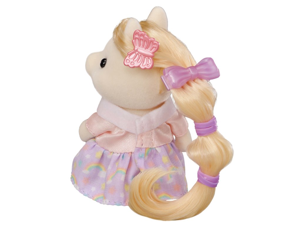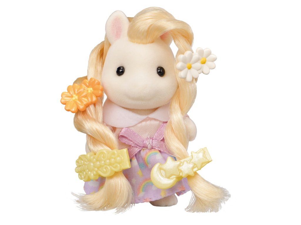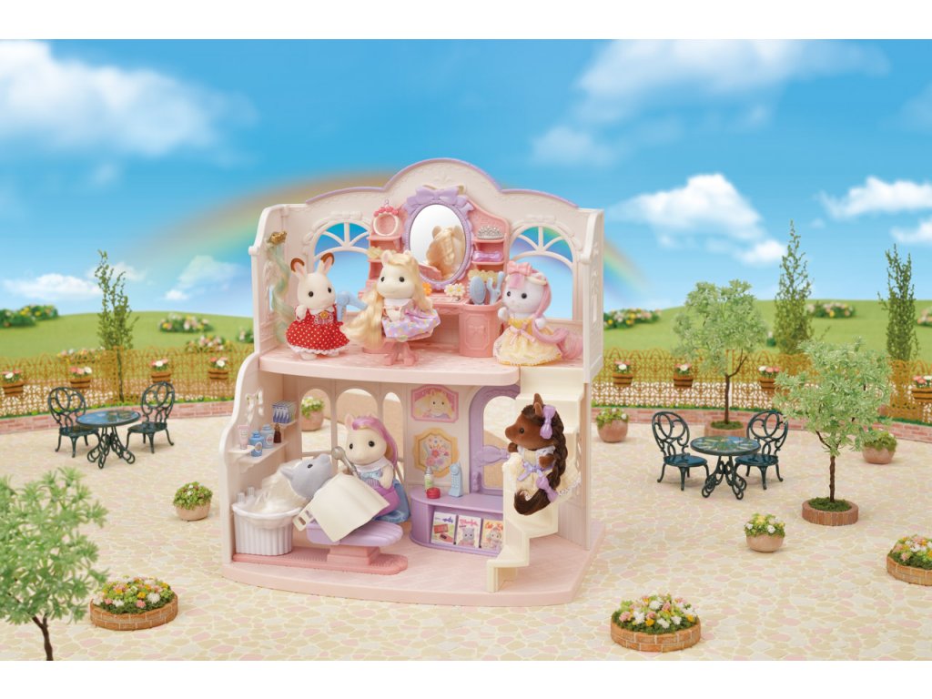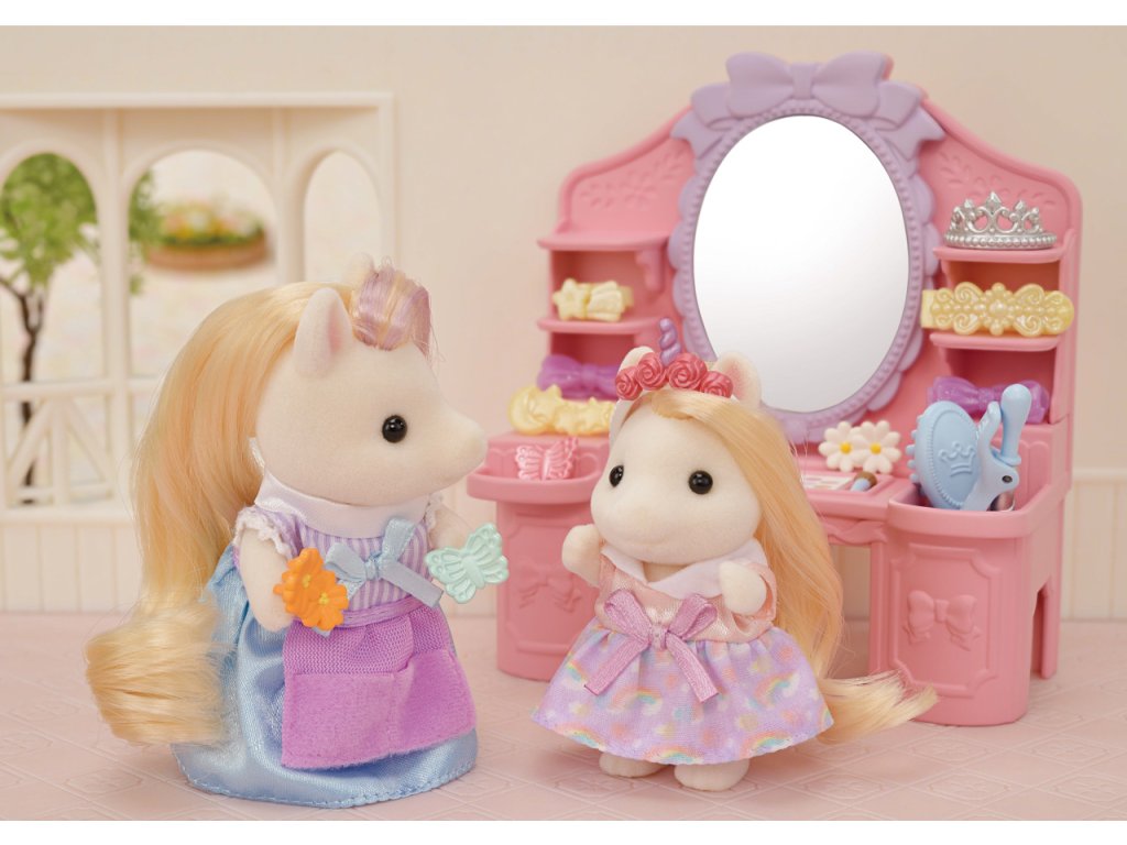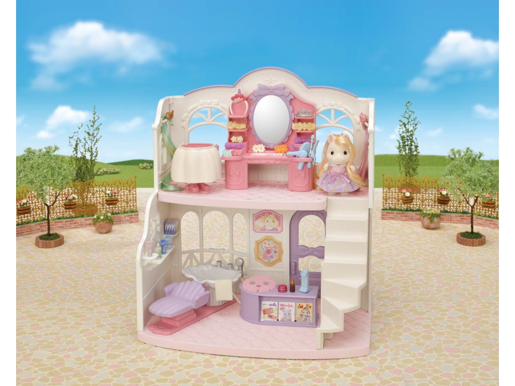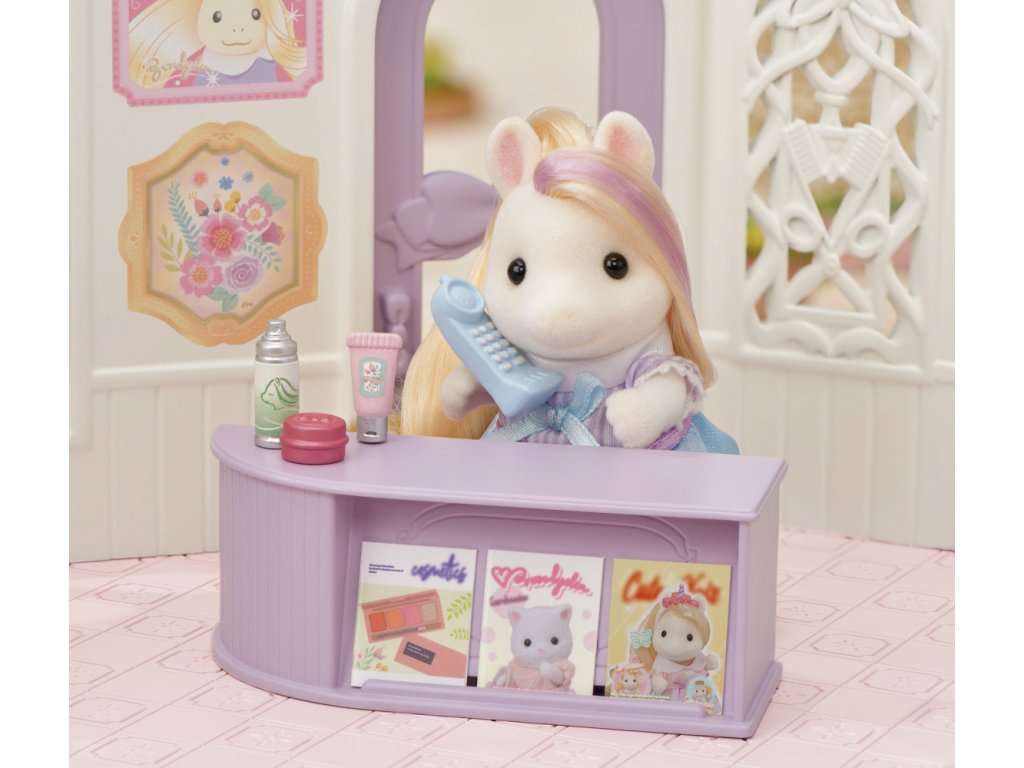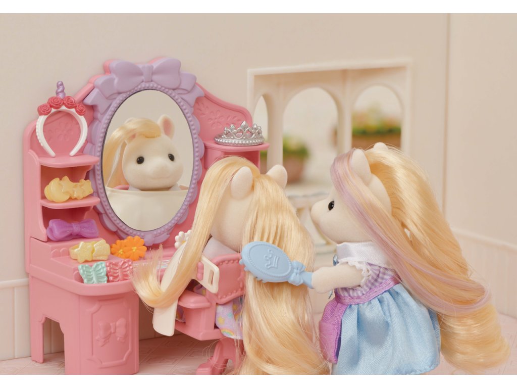 Sada Kadeřnický salón pro poníky obsahuje nádherný kadeřnický salon a hedvábnou poníkovou dívku Sally. Zahrnuje doplňky pro hru na vlasy a make-up. Za pomoci vlasových doplňků a knihy o vlasovém stylingu upravte vlasy dívky Sally různými způsoby. Tato sada obsahuje budovu, nábytek, figurku a doplňky a lze ji užívat samostatně. Součástí je krásná komoda s velkým zrcadlem. Dvoupatrový salon otevírá tolik zábavných způsobů, jak hrát! Učešte vlasy kartáčem nebo použijte kulmu pro zábavnou hru se stylingem vlasů! Figurky mohou držet vysoušeč vlasů. Kombinujte různé vlasové doplňky, jako je pásek Alice a sponky do vlasů, abyste vytvořili různé účesy! Na toaletním stolku vystavte vlasové doplňky, kartáč a fén. Figurku lze připevnit k židli při zaplétání vlasů nebo vytváření jiných účesů. Umyvadlo a židli ve tvaru mušle použijte ke hře na mytí vlasů. Sprchovou hlavici lze připevnit na boční stranu umyvadla. Zkombinujte se sadou Poník s vlasy v kadeřnictví (prodává se samostatně) pro ještě více zábavy se salonem! Nebo zkombinujte se sadou Šaty a ozdoby pro princezny s kotětem (prodává se samostatně) a proměňte horní patro kadeřnictví v obchod s šaty. Přiložené prodloužení vlasů lze také připevnit k dalším figurkám (prodávají se samostatně). Stimuluje nápadité hraní rolí u dětí. Věk: 3+