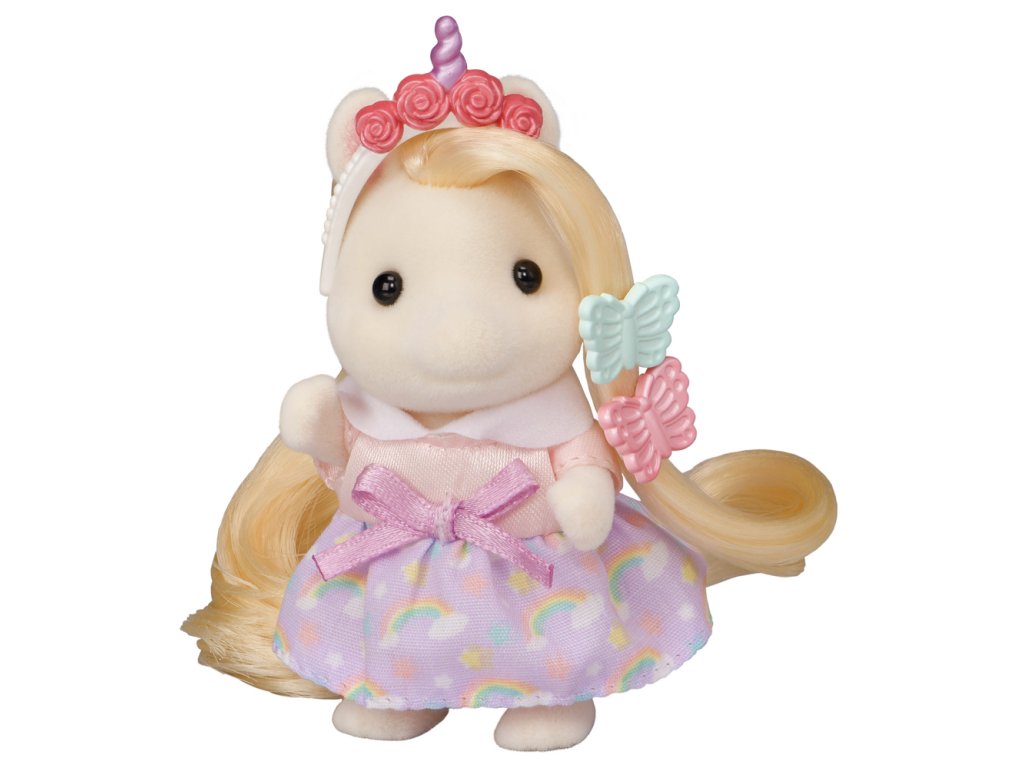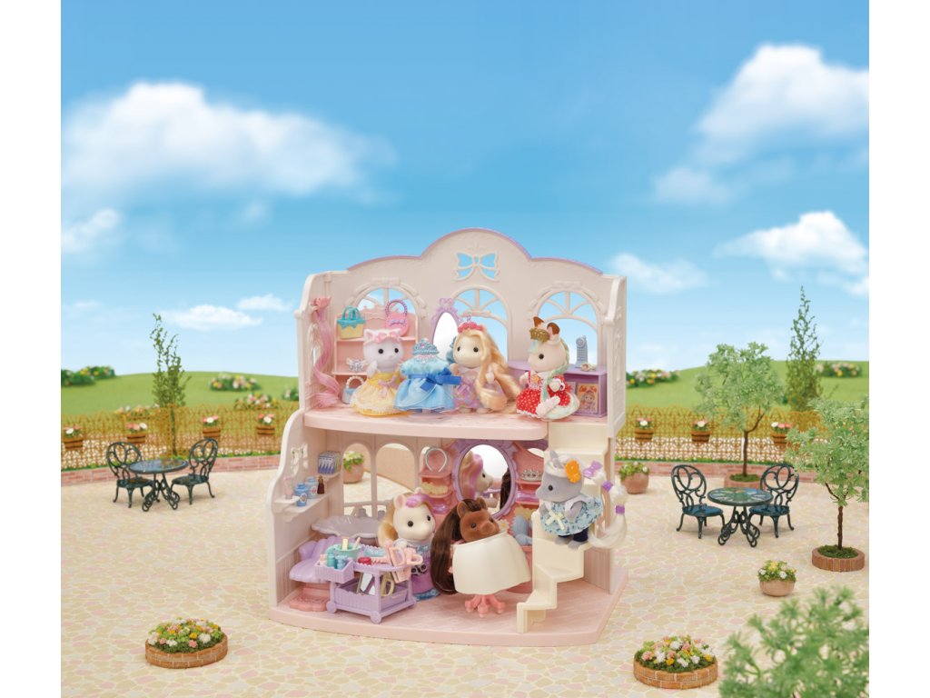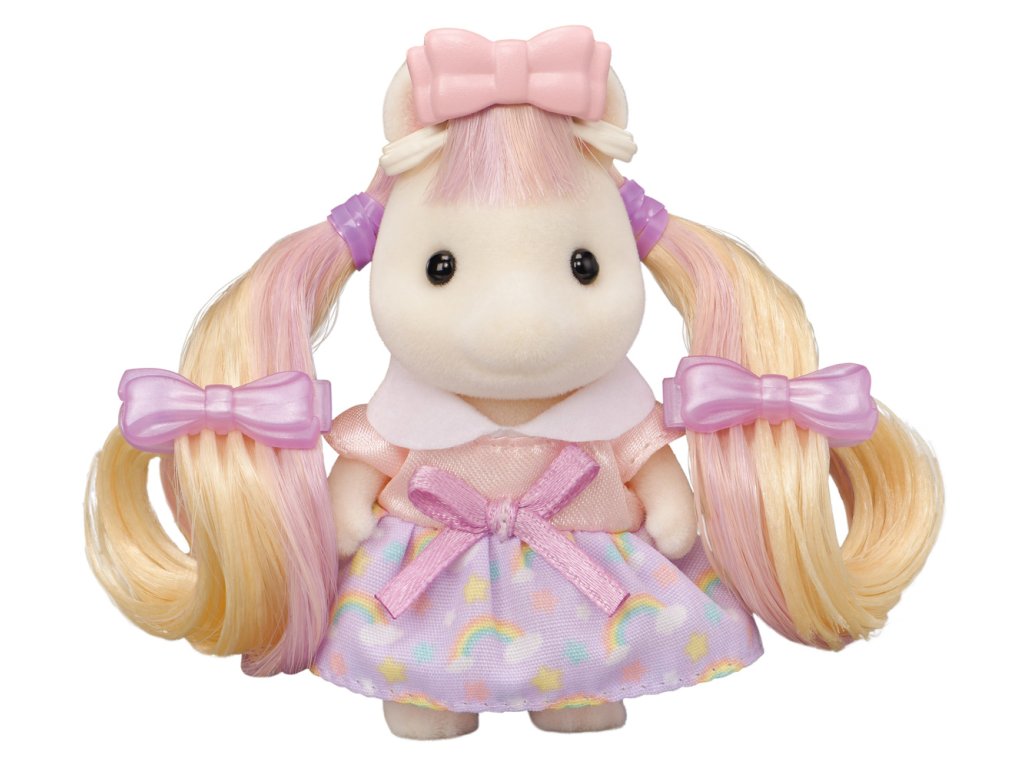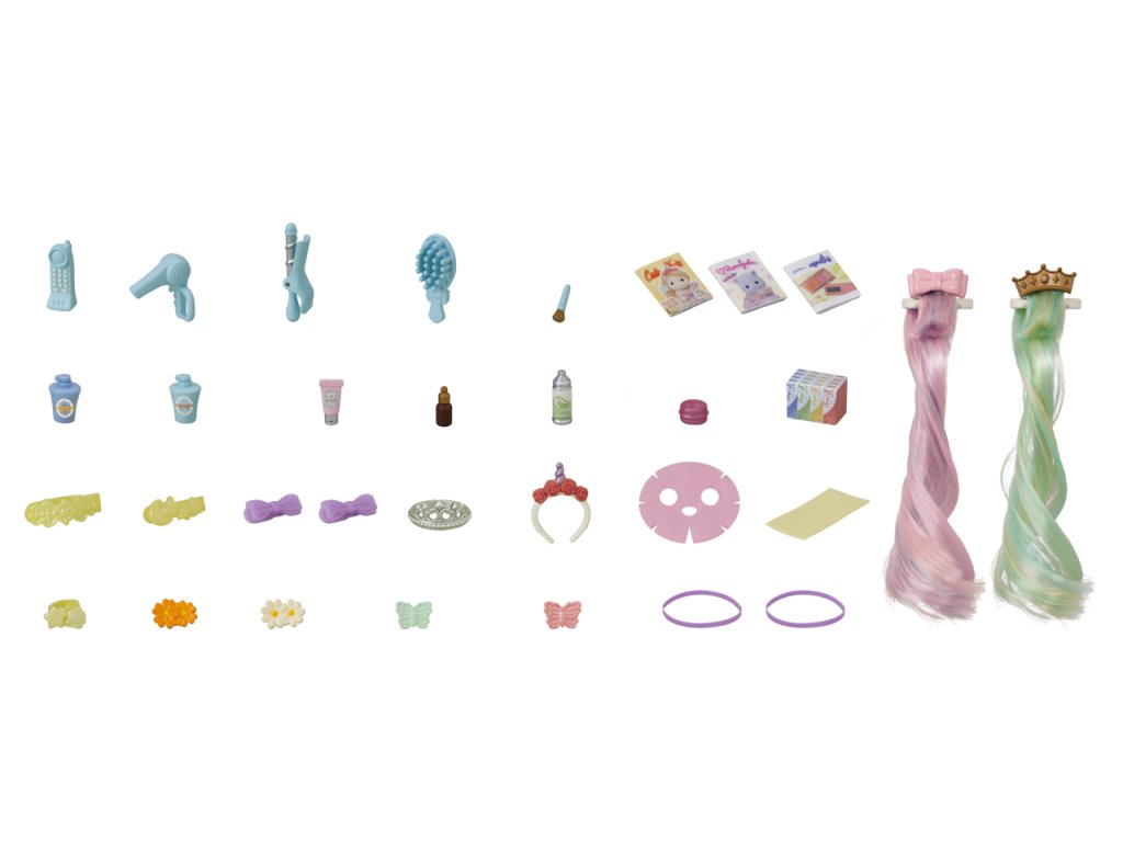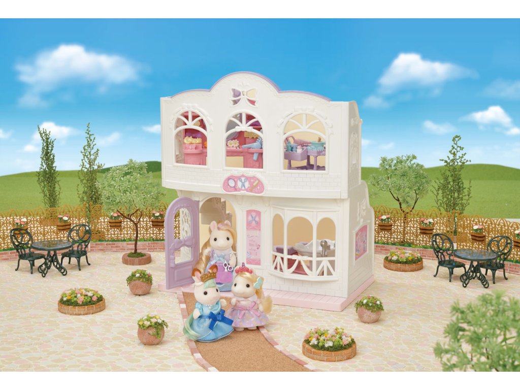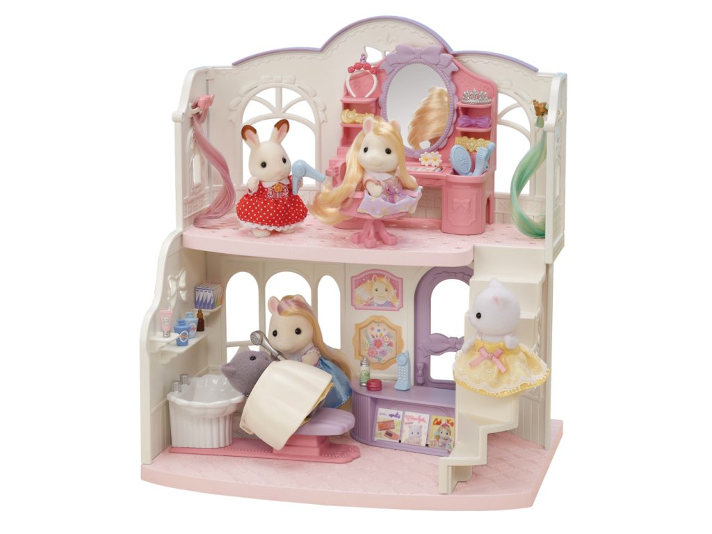 Sada Kadeřnický salón pro poníky obsahuje nádherný kadeřnický salon a hedvábnou poníkovou dívku Sally. Zahrnuje doplňky pro hru na vlasy a make-up. Za pomoci vlasových doplňků a knihy o vlasovém stylingu upravte vlasy dívky Sally různými způsoby. Tato sada obsahuje budovu, nábytek, figurku a doplňky a lze ji užívat samostatně. Součástí je krásná komoda s velkým zrcadlem. Dvoupatrový salon otevírá tolik zábavných způsobů, jak hrát! Učešte vlasy kartáčem nebo použijte kulmu pro zábavnou hru se stylingem vlasů! Figurky mohou držet vysoušeč vlasů. Kombinujte různé vlasové doplňky, jako je pásek Alice a sponky do vlasů, abyste vytvořili různé účesy! Na toaletním stolku vystavte vlasové doplňky, kartáč a fén. Figurku lze připevnit k židli při zaplétání vlasů nebo vytváření jiných účesů. Umyvadlo a židli ve tvaru mušle použijte ke hře na mytí vlasů. Sprchovou hlavici lze připevnit na boční stranu umyvadla. Zkombinujte se sadou Poník s vlasy v kadeřnictví (prodává se samostatně) pro ještě více zábavy se salonem! Nebo zkombinujte se sadou Šaty a ozdoby pro princezny s kotětem (prodává se samostatně) a proměňte horní patro kadeřnictví v obchod s šaty. Přiložené prodloužení vlasů lze také připevnit k dalším figurkám (prodávají se samostatně). Stimuluje nápadité hraní rolí u dětí. Věk: 3+