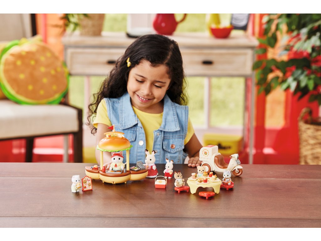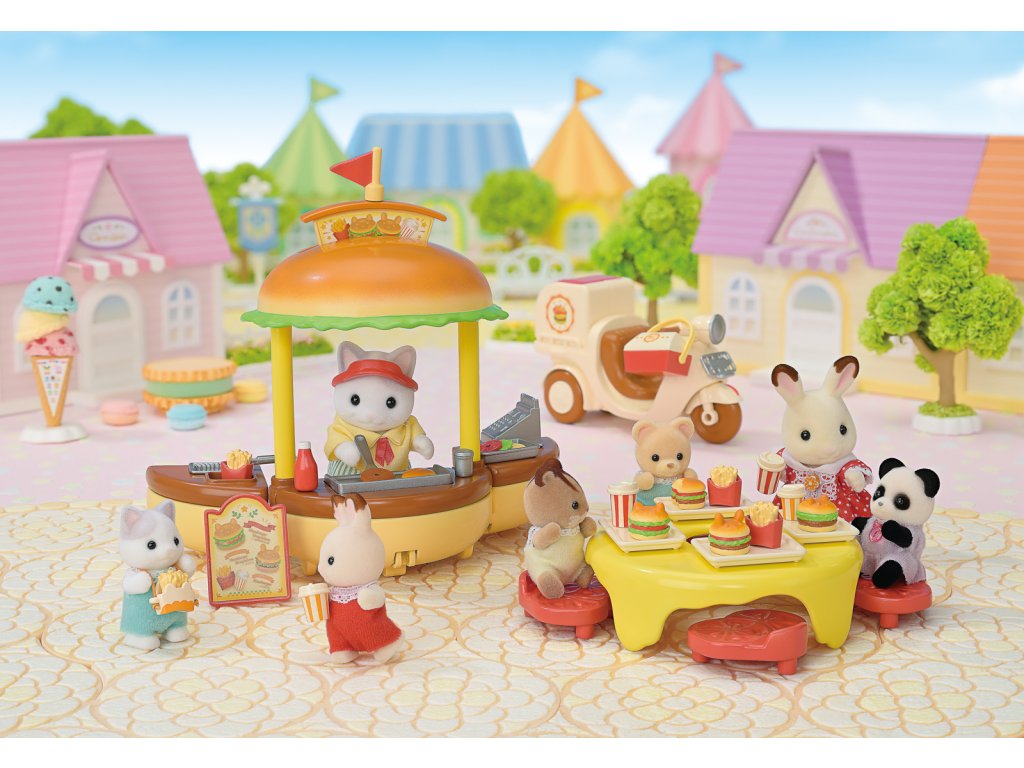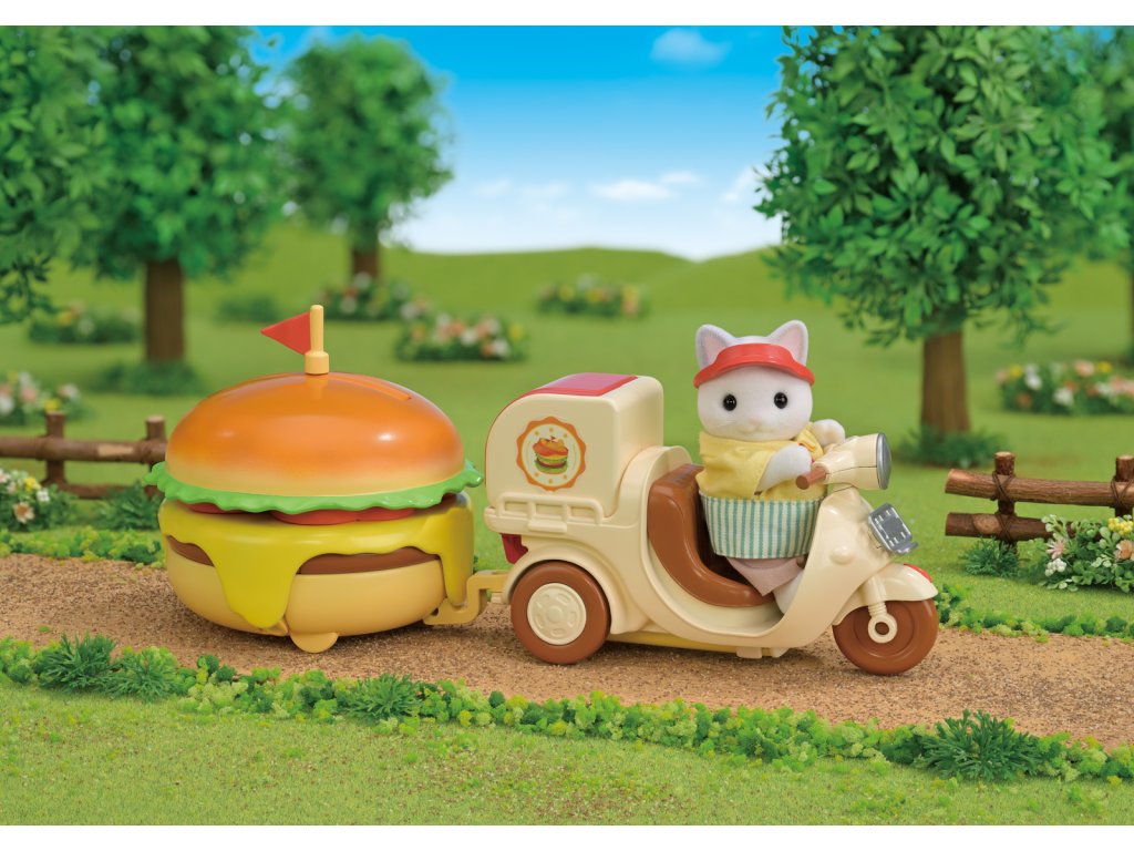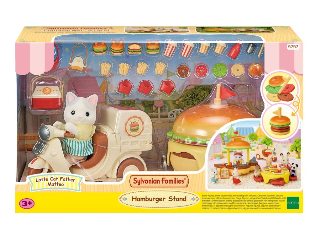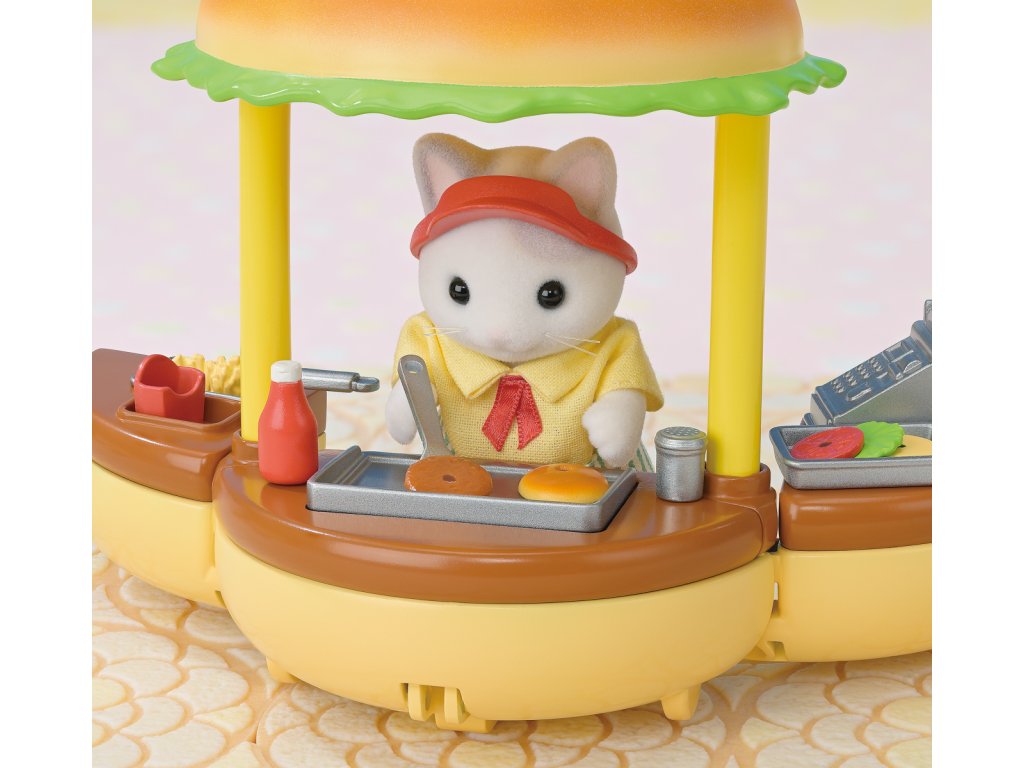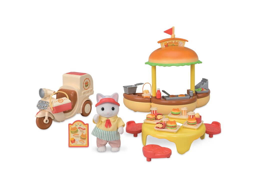 Sada Pojízdný stánek s hamburgery obsahuje figurku tatínka z rodiny Latte Cat Familly, restauraci ve tvaru obřího hamburgeru, rozvážkový skútr a spoustu doplňků. Hamburger se promění v restauraci se stolem a židlemi. Sada obsahuje více než 30 dílů, včetně lahodných hamburgerů v houskách ve tvaru kočičích uší a nápojů. Můžete si pochutnat na grilovaných karbanátcích a horkých bramborách. Pojízdný stánek s hamburgery lze složit do tvaru velkého hamburgeru a pro snadnou přepravu ho připevnit na skútr tatínka Latte Cat. Tatínek Latte Cat je majitelem hamburgerové restaurace a dodává všem obyvatelům země Sylvanian Families vynikající hamburgery. Tatínek si do restaurace s hamburgery oblékl speciální oblečení. Figurka s tímto oblečením je k dispozici pouze v této sadě. Hračky Sylvanian Families vyrábí japonská společnost Epoch již více než 35 let. Vyznačují se výjimečnou kvalitou a smyslem pro detail. Doporučujeme od 3 let věku.