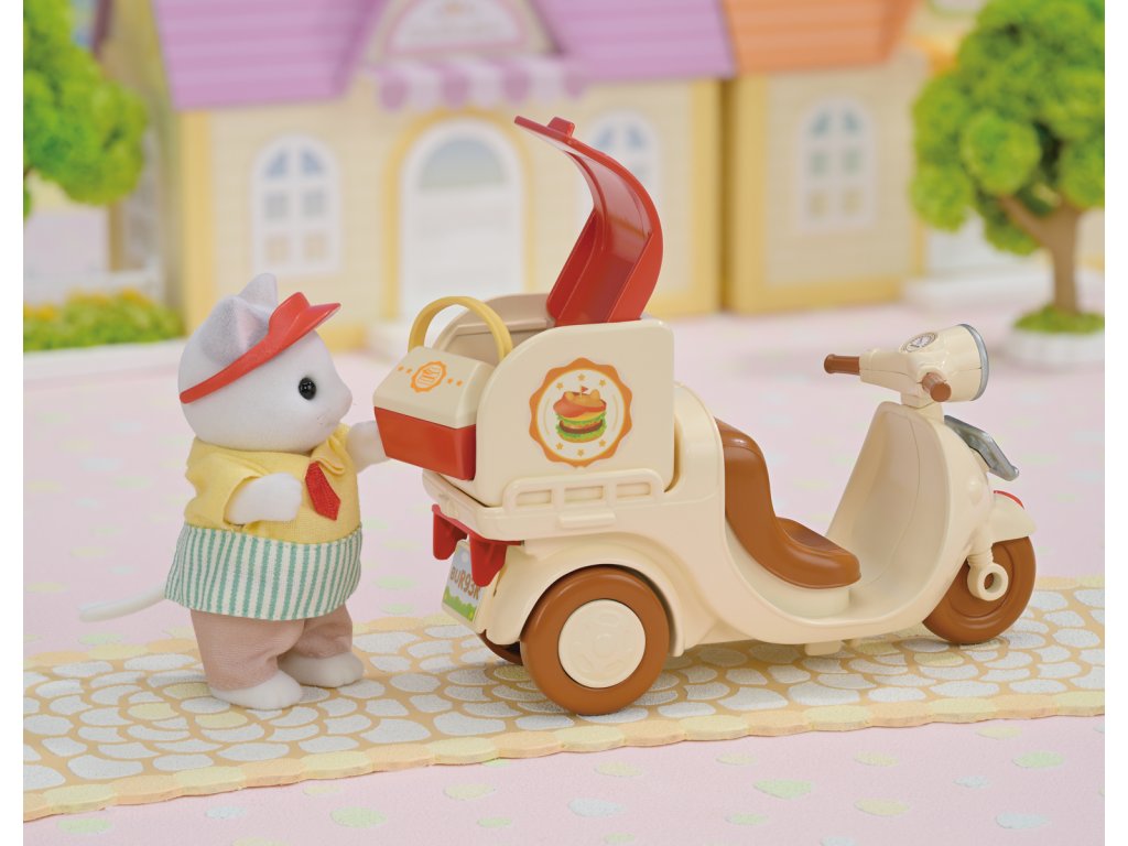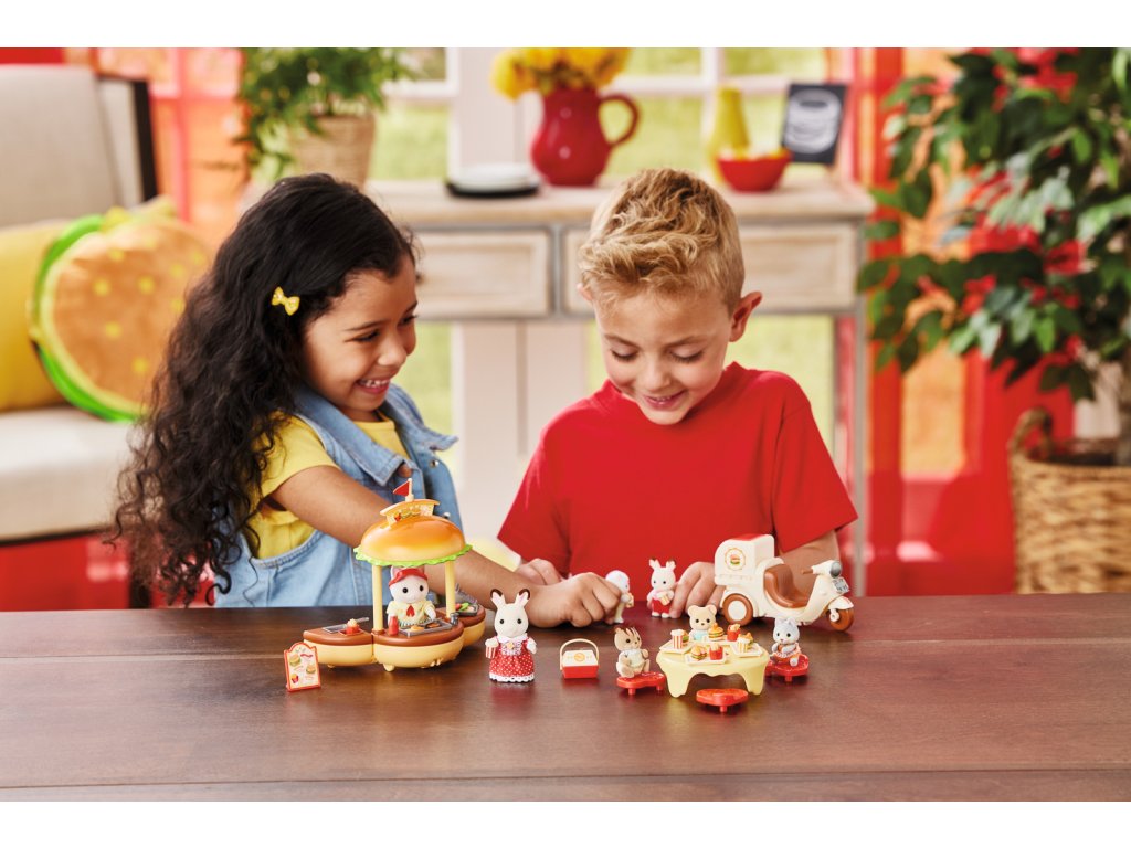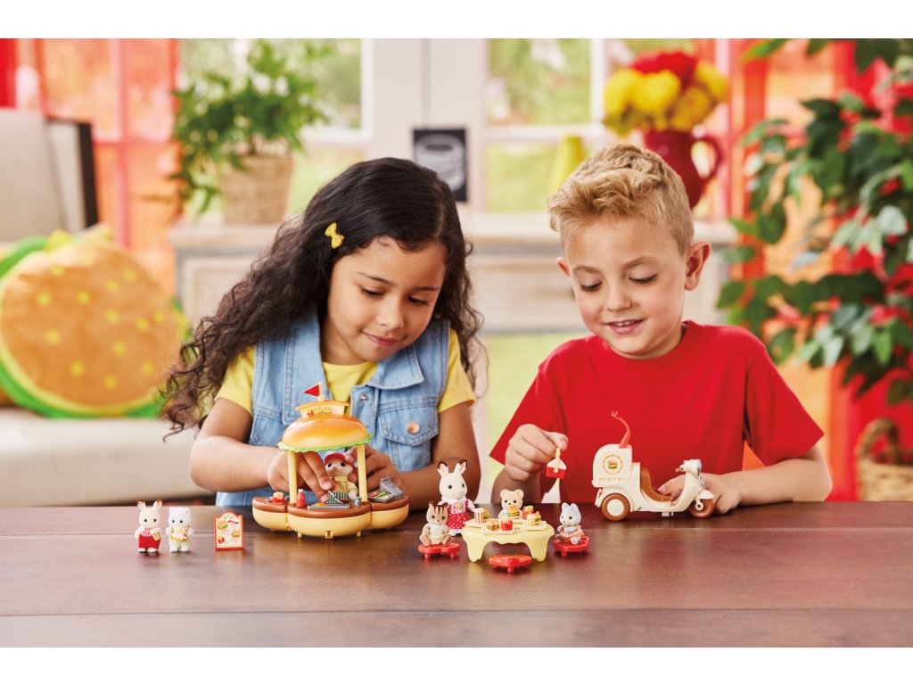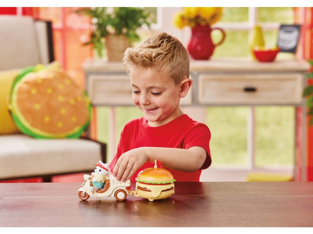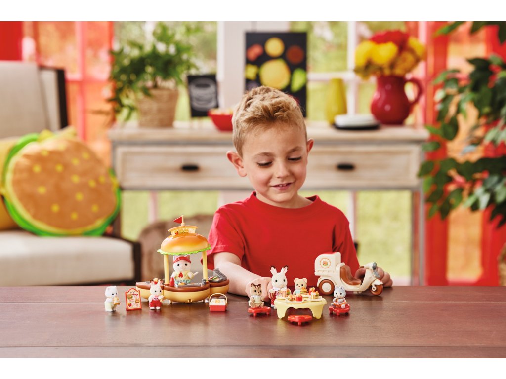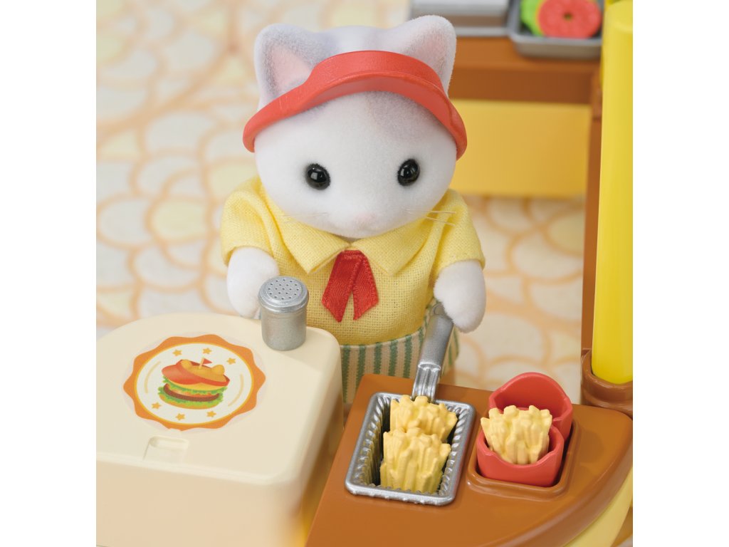 Sada Pojízdný stánek s hamburgery obsahuje figurku tatínka z rodiny Latte Cat Familly, restauraci ve tvaru obřího hamburgeru, rozvážkový skútr a spoustu doplňků. Hamburger se promění v restauraci se stolem a židlemi. Sada obsahuje více než 30 dílů, včetně lahodných hamburgerů v houskách ve tvaru kočičích uší a nápojů. Můžete si pochutnat na grilovaných karbanátcích a horkých bramborách. Pojízdný stánek s hamburgery lze složit do tvaru velkého hamburgeru a pro snadnou přepravu ho připevnit na skútr tatínka Latte Cat. Tatínek Latte Cat je majitelem hamburgerové restaurace a dodává všem obyvatelům země Sylvanian Families vynikající hamburgery. Tatínek si do restaurace s hamburgery oblékl speciální oblečení. Figurka s tímto oblečením je k dispozici pouze v této sadě. Hračky Sylvanian Families vyrábí japonská společnost Epoch již více než 35 let. Vyznačují se výjimečnou kvalitou a smyslem pro detail. Doporučujeme od 3 let věku.
