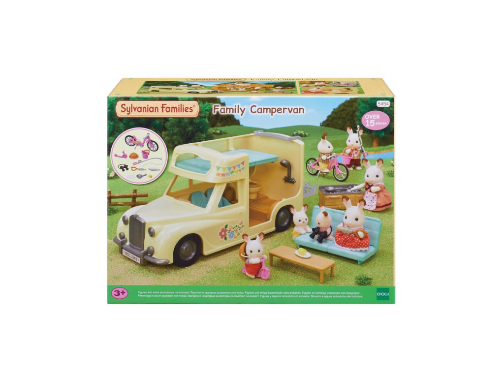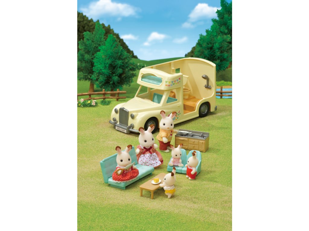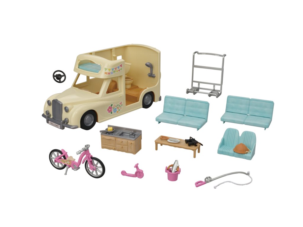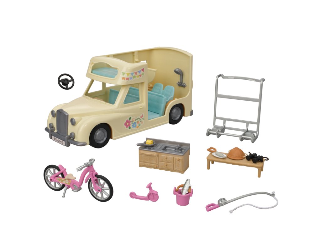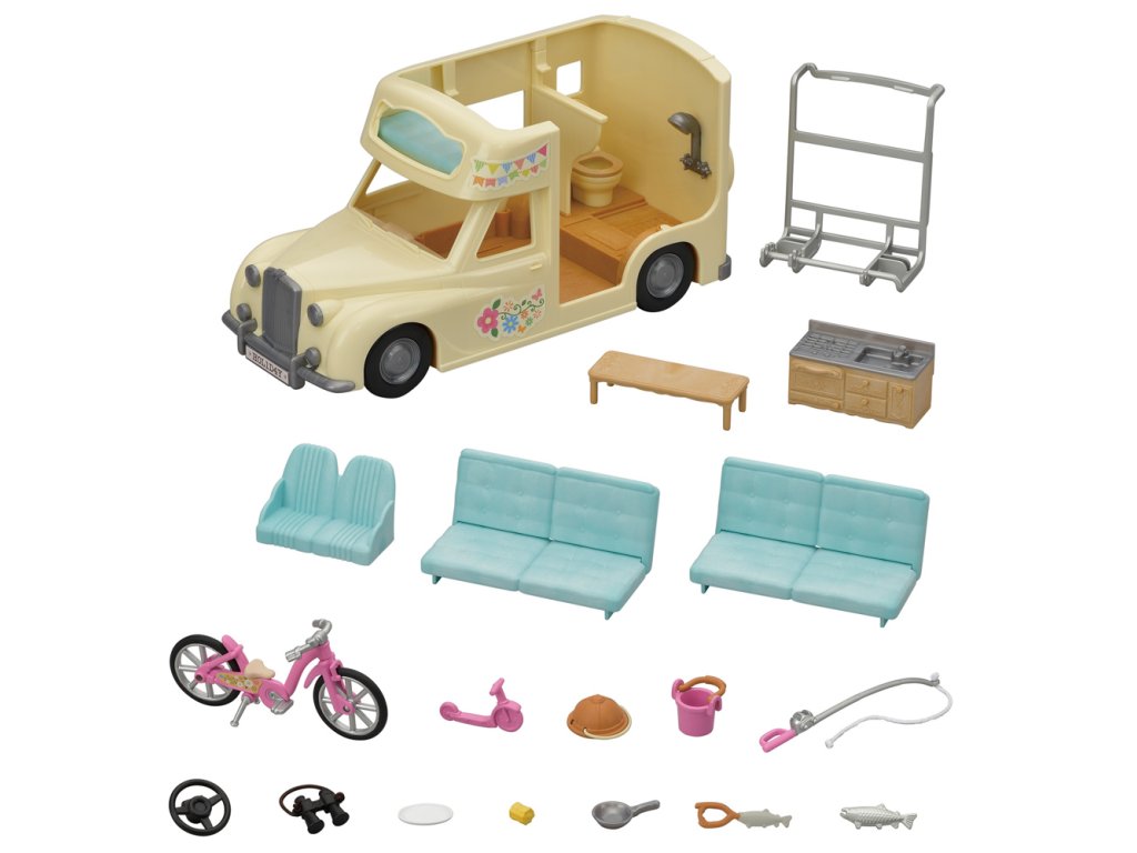 Užijte si vaření, grilování, jízdu na kole, rybaření a další zábavné aktivity v kempu s Rodinným obytným vozem se sedmi sedadly. V obytném voze mohou spát dvě dospělé figurky, dvě baby figurky, dvojčata a miminko. Sedadla lze sklopením přeměnit na postel. Kuchyň schovaná pod palubní dekou obsahuje pánev, kukuřici a grilovanou rybu. Ulovte čerstvé ryby s rybářským prutem a přineste je v kbelíku. Dětské horské kolo, dětské kolo a rybářský prut lze uložit do zadního nosiče. Užijte si více zábavy s dalšími figurkami a doplňky Sylvanian Families (prodává se samostatně). Obytný vůz je kompatibilní s Karavanem (5045, prodejné samostatně). Herní sady a figurky Sylvanian Families jsou nadčasové a vysoce kvalitní hračky. Hra podněcuje představivost dítěte. Obsahuje: 1x Obytný vůz, 2x sedačka/postel, 1x dětská sedačka, 1x kuchyňský kout, 1x stůl, 1x pánev, 1x kukuřice, 1x grilovaná ryba, 1x dětské horské kolo, 1x dětské kolo, 1x helma, 1x rybářský prut, 1x kbelík, 1x ryba, 1x dalekohled, 1x zadní nosič. Věk: 3+. Video: https://www.youtube.com/watch?v=6i5MNsj7MQg