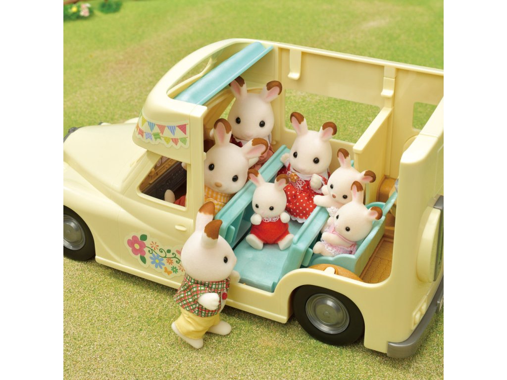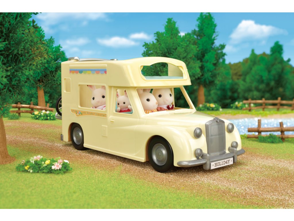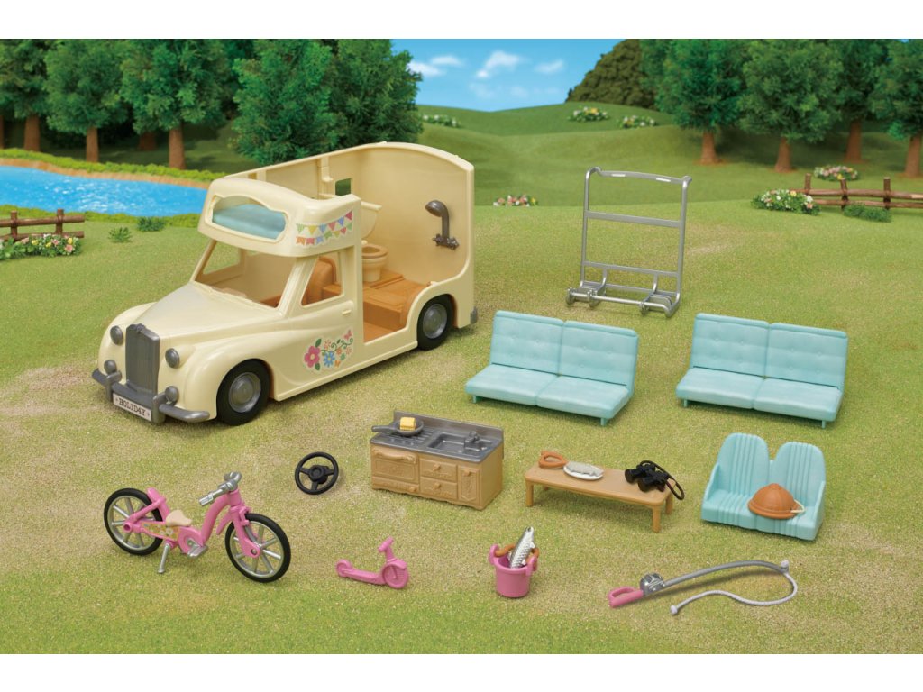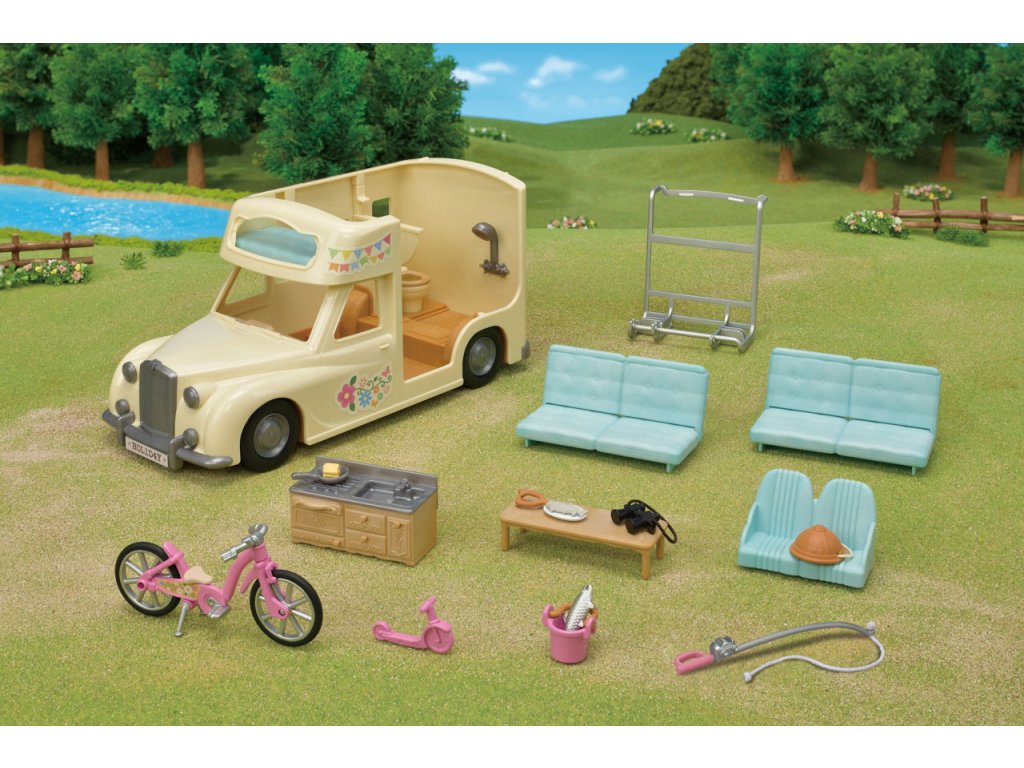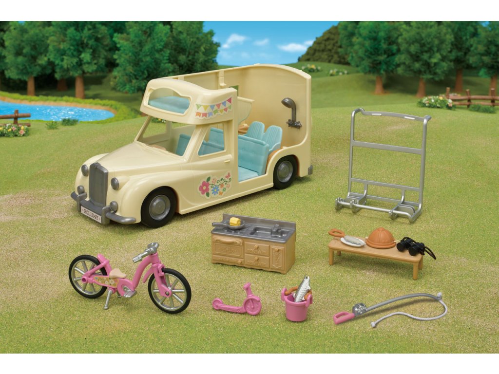 Užijte si vaření, grilování, jízdu na kole, rybaření a další zábavné aktivity v kempu s Rodinným obytným vozem se sedmi sedadly. V obytném voze mohou spát dvě dospělé figurky, dvě baby figurky, dvojčata a miminko. Sedadla lze sklopením přeměnit na postel. Kuchyň schovaná pod palubní dekou obsahuje pánev, kukuřici a grilovanou rybu. Ulovte čerstvé ryby s rybářským prutem a přineste je v kbelíku. Dětské horské kolo, dětské kolo a rybářský prut lze uložit do zadního nosiče. Užijte si více zábavy s dalšími figurkami a doplňky Sylvanian Families (prodává se samostatně). Obytný vůz je kompatibilní s Karavanem (5045, prodejné samostatně). Herní sady a figurky Sylvanian Families jsou nadčasové a vysoce kvalitní hračky. Hra podněcuje představivost dítěte. Obsahuje: 1x Obytný vůz, 2x sedačka/postel, 1x dětská sedačka, 1x kuchyňský kout, 1x stůl, 1x pánev, 1x kukuřice, 1x grilovaná ryba, 1x dětské horské kolo, 1x dětské kolo, 1x helma, 1x rybářský prut, 1x kbelík, 1x ryba, 1x dalekohled, 1x zadní nosič. Věk: 3+. Video: https://www.youtube.com/watch?v=6i5MNsj7MQg