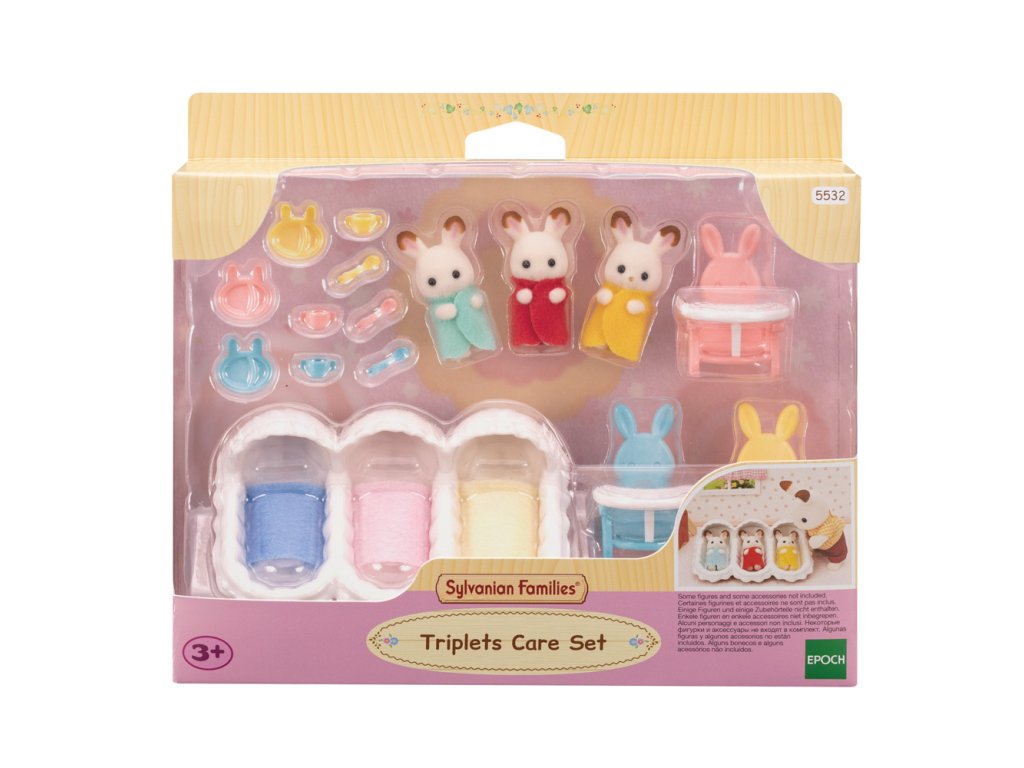Sada malých roztomilých Chocolate králíčků. Trojčátka Flora, Fauna a Philip Chocolate jsou nejnovějšími přírůstky v rodině Chocolate králíků. Miminka můžete položit do kolébky a přikrýt dekou nebo posadit do dětských jídelních židliček a nakrmit je. Trojčátka mají milující rodiče, prarodiče, bratry a sestry, kteří se o ně starají a hrají s nimi (figurky nejsou součástí balení). Figurky jsou vyrobeny z plastu, který je potažený jemňounkým sametem. Očička jsou z černých korálků. Všechny končetiny jsou pohyblivé a hlavička otáčecí. Oblečení je vyrobeno tak, aby se dalo opakovaně svlékat a oblékat. Užijte si více zábavy s dalšími figurkami a doplňky Sylvanian Families (prodává se samostatně). Herní sady a figurky Sylvanian Families jsou nadčasové a vysoce kvalitní hračky. Hra podněcuje představivost dítěte. Sada obsahuje: 3x figurka miminek, 3x oblečení, 3x jídelní židlička, 3x talíř, 3x hrneček, 3x lžička, 3x deka, 3x kolébka. Věk: 3+. Video: https://www.youtube.com/watch?v=_2L_IHM_tPE