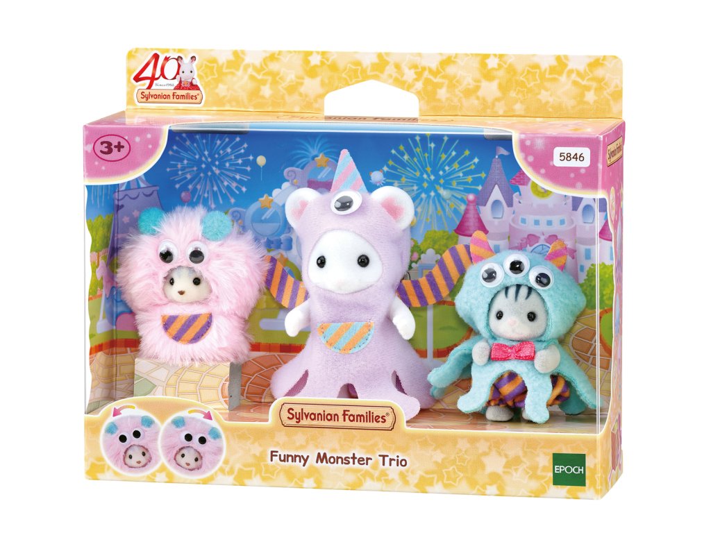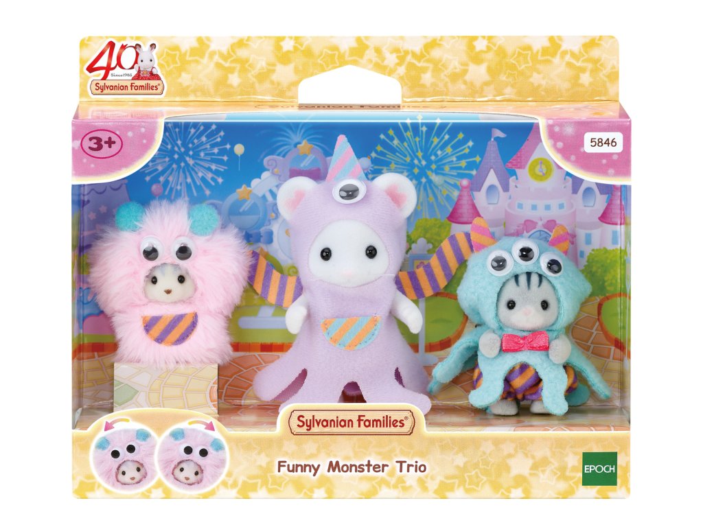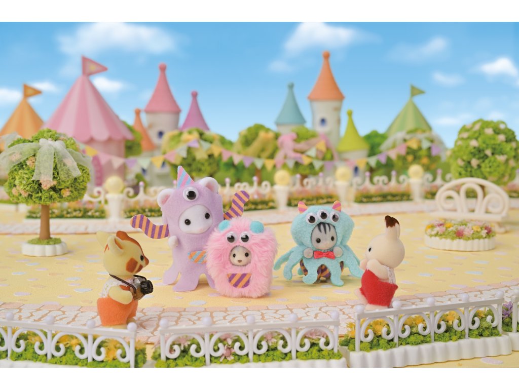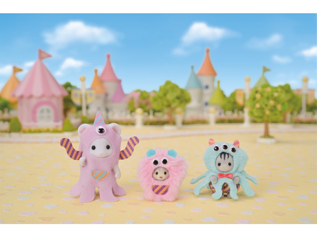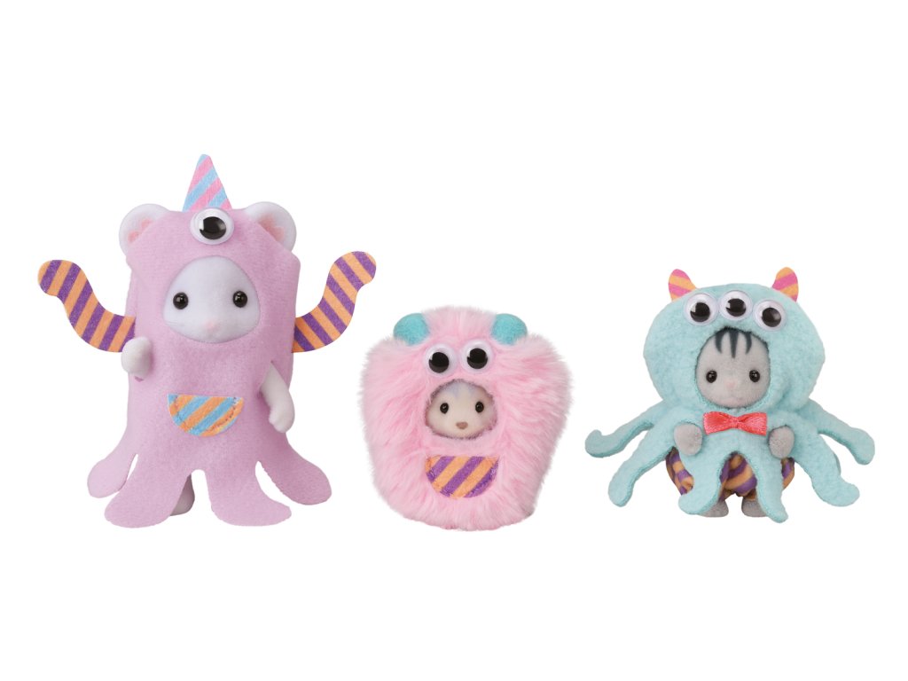 Vydejte se do zábavního parku Sylvanian na přehlídku kostýmů. Oblečeni do vtipných kostýmů speciálně pro tuto příležitost, baby Marshmallow myška Katherine, má na sobě fialový kostým mimozemšťana, baby šedý kocourek Ashton Harvey, je tříoká chobotnice a baby husky Linnea, je chlupaté růžové monstrum. Každý kostým má zábavné pohyblivé oči. Hračky Sylvanian Families rozvíjejí představivost a povzbuzují děti k hraní rolí. Hra s figurkami rozvíjí kreativitu a učí emocím vytvářením a vyprávěním příběhů založených na každodenních zážitcích a pozorování světa. Vyznačují se nejvyšší kvalitou a výjimečným důrazem na detaily. Figurky Sylvanian Families jsou pokryté měkkým semišem, mají pohyblivé končetiny a hlavu. Oblečení lze z figurek sundat a vyměnit za jiný outfit. Baleno v krabičce. Rozměry balení: 13 x 16 x 4,5 cm. Věk: 3+