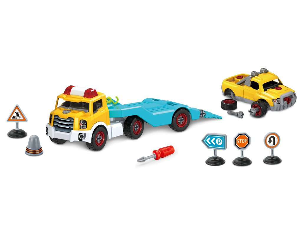 Odtahovka šroubovací. Velikost 37cm. obsahuje: šroubovací odtahovku a šroubovací auto s navijákem, šroubovák, dopravní značky.