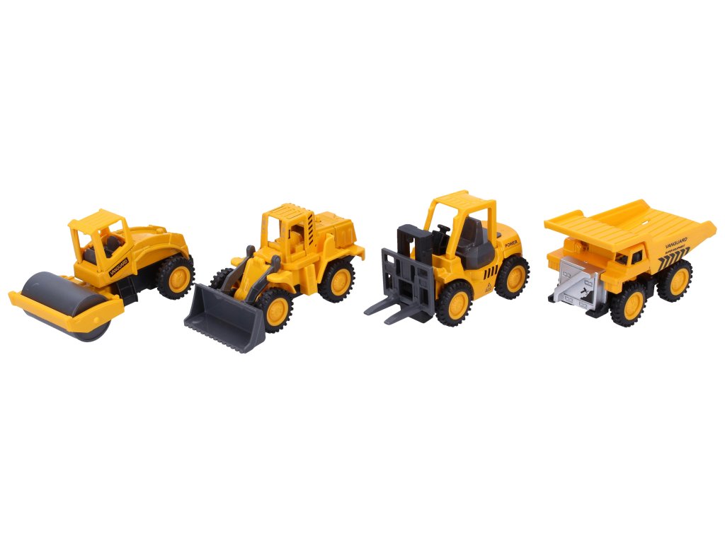 Stavební stroj na zpětné natažení. Velikost 8 cm. Vyrobeno z kovu. Display box 12 ks. 4 varianty - nakladač, sklápěč, válec, vozík.