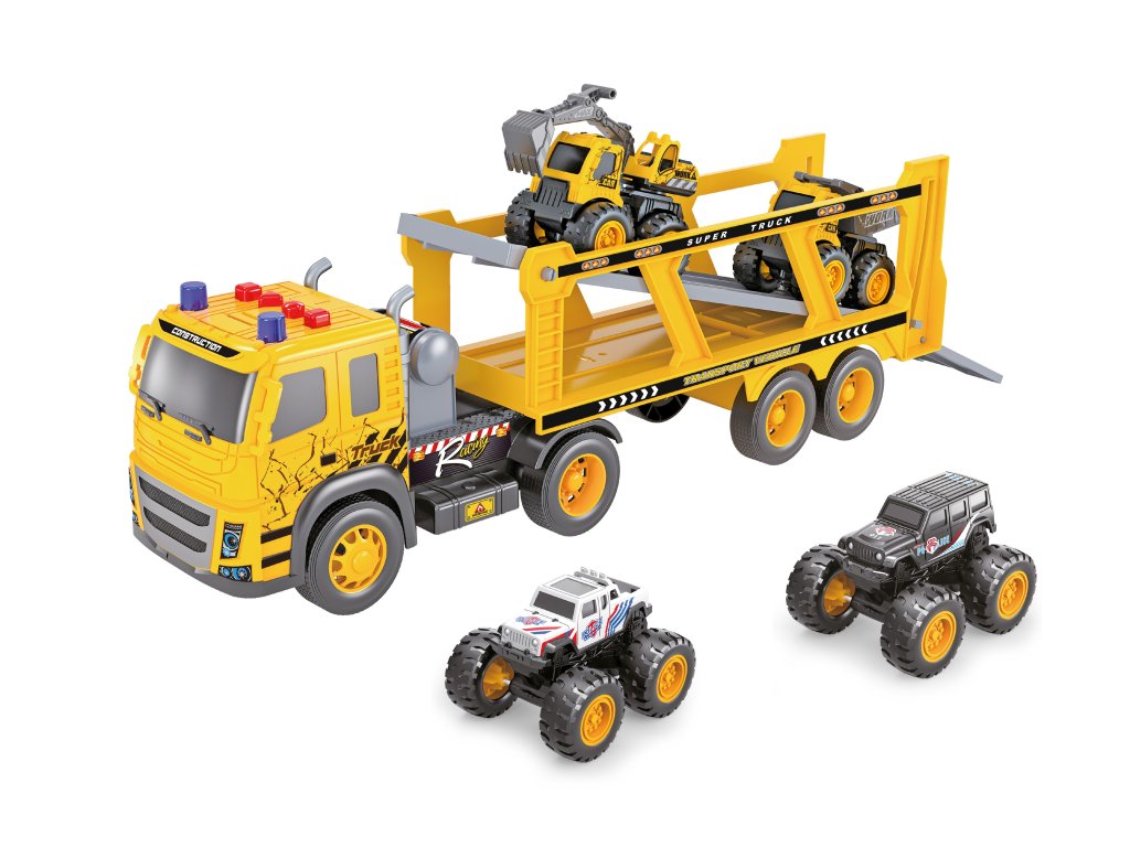 Tahač se 4 auty a efekty. Velikost tahače 45 cm, malých aut 8-10 cm. Na setrvačník. Světelné a zvukové (couvání, troubení, zvuk plošiny, motor) efekty na kabině tahače. 3xAG13 baterie do tahače součástí.