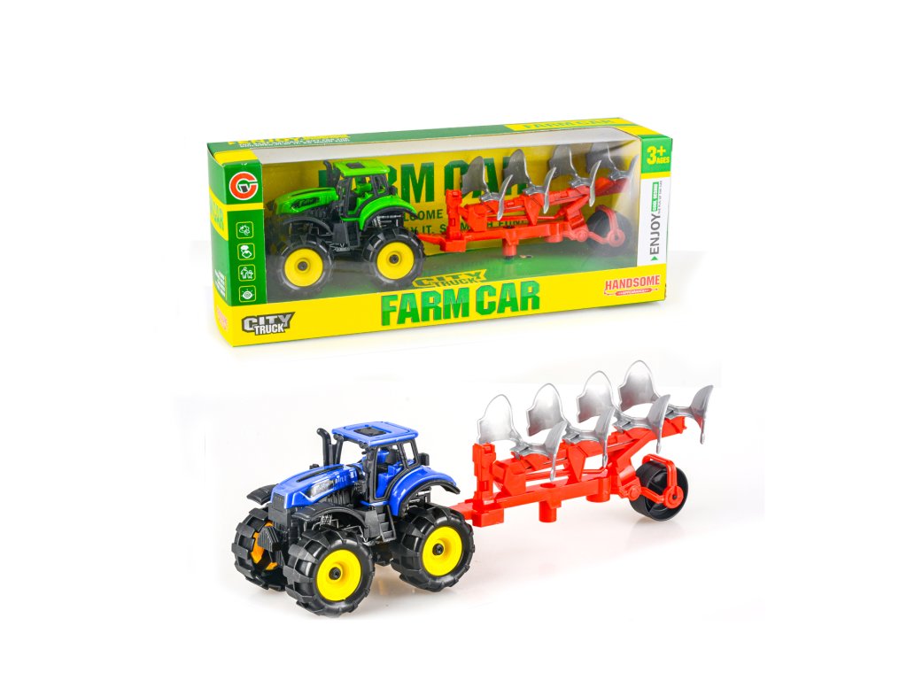 Traktor na setrvačník s pluhem. Rozměry traktoru 25x7x7,5 cm. 2 varianty - modrá, zelená.