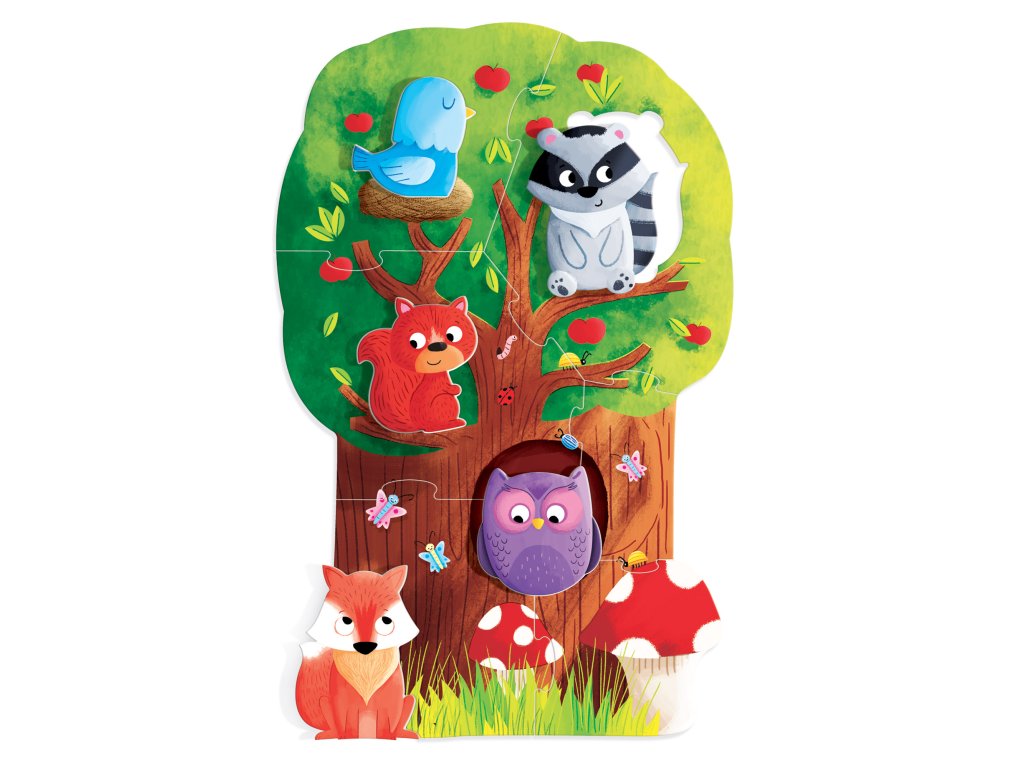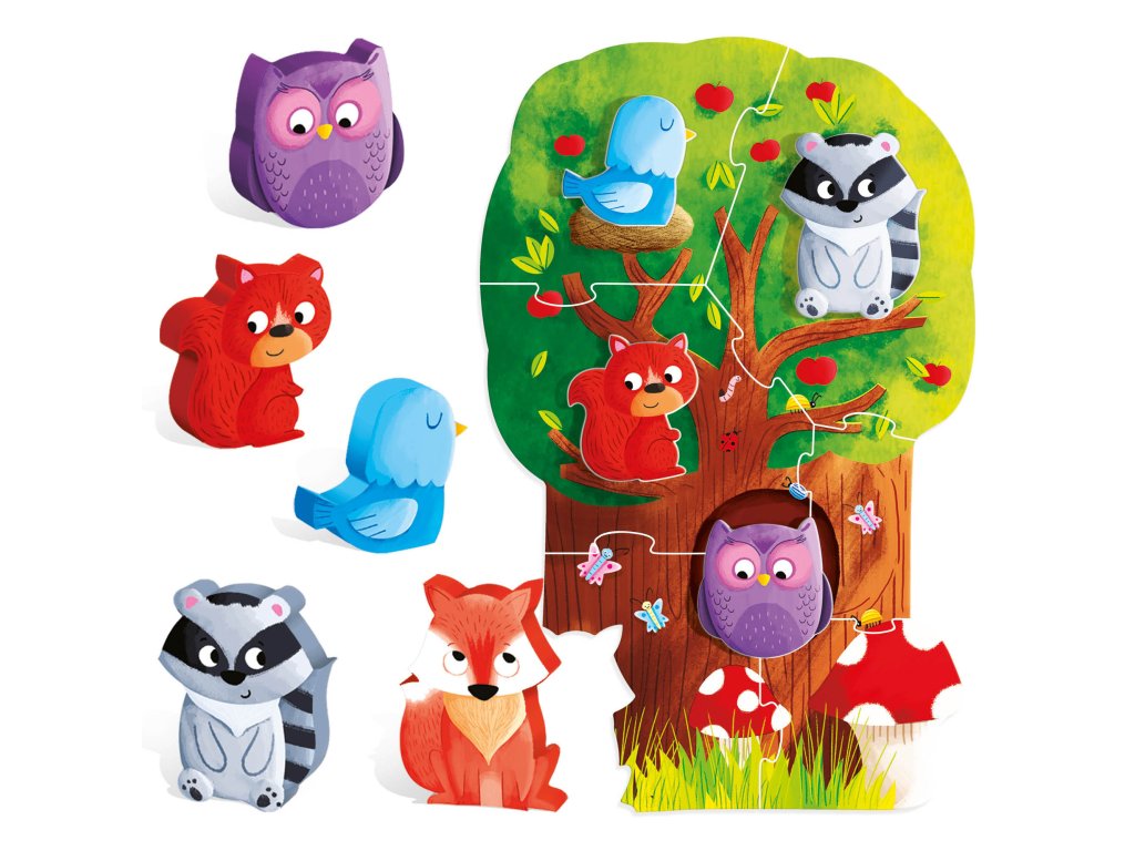 Děti si mohou sestavit puzzle ve tvaru velkého stromu obývaného pěti zvířátky a bavit se vkládáním těchto dřevěných zvířátek na správné místo. Puzzle obsahuje kvalitní dílky vhodné i pro malé děti.