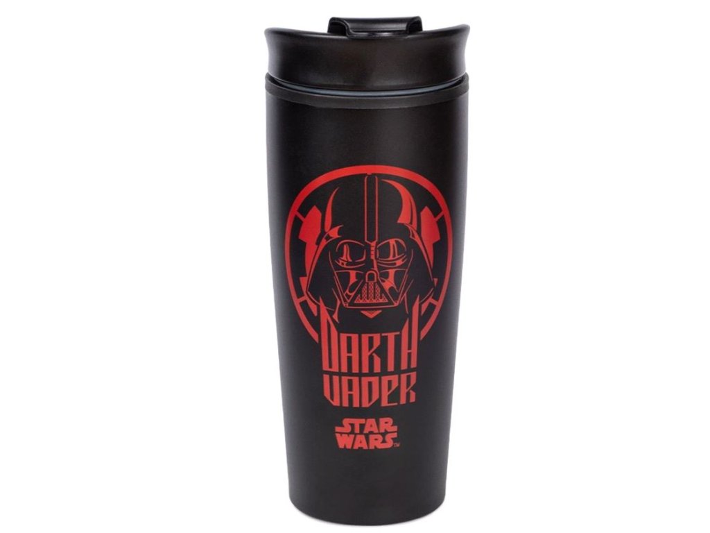 Cestovní hrnek s plastovým víčkem v černé barvě a grafikou sci-fi ságy Star Wars. Na hnku se objevuje červeně znázorněná fiktivní postava Darth Vadera a nápis StarWars.