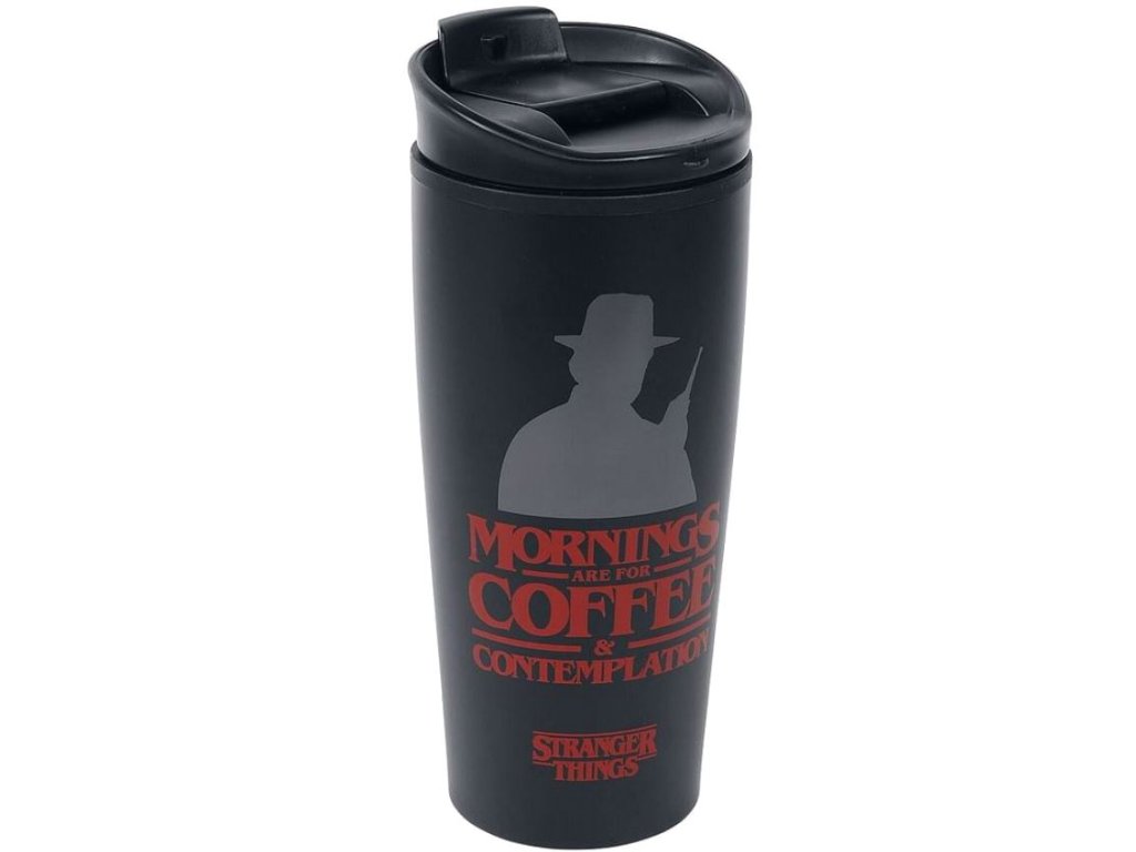 Cestovní hrnek s plastovým víčkem v černé barvě s grafikou seriálu Stranger Things. Hrnek z nerezové oceli a s červeným nápisem Morning are for coffee.