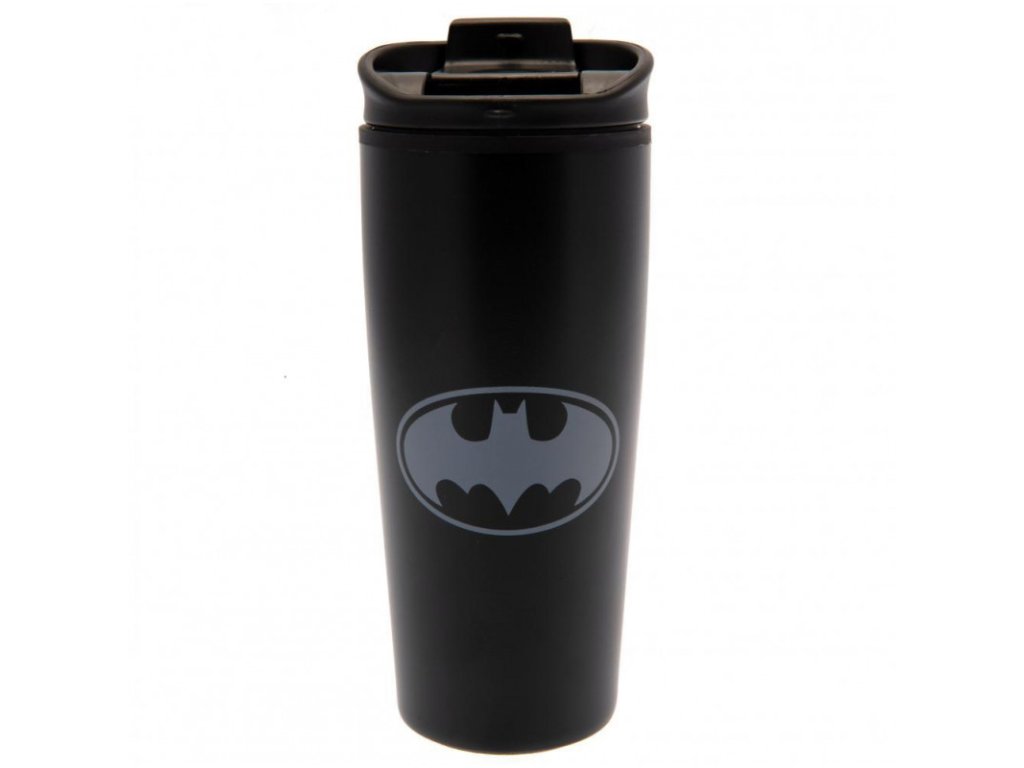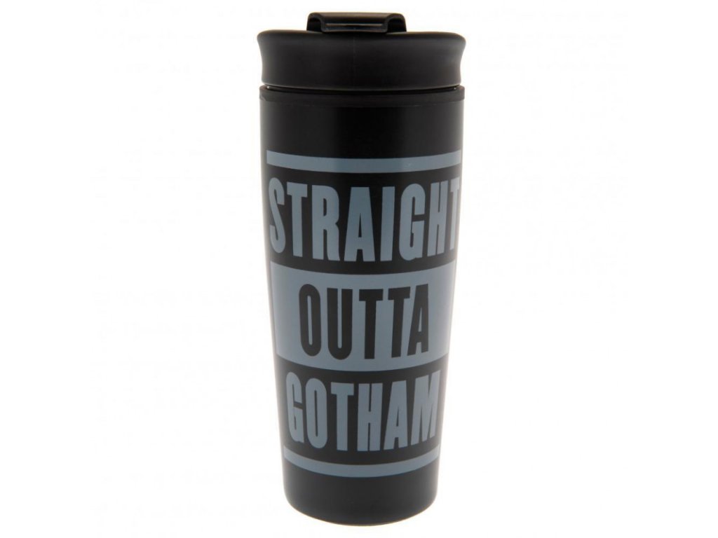 Cestovní hrnek s plastovým víčkem v černé barvě s grafikou superhrdiny Batmana a s logem ve tvaru netopýra. Hrnek obsahuje slova "Straight Outta Gotham".