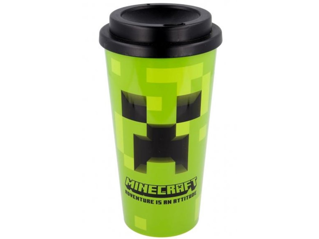 Zelený cestovní hrnek s černým otevíracím víčkem a motivem Creepera s nápisem Minecraft.