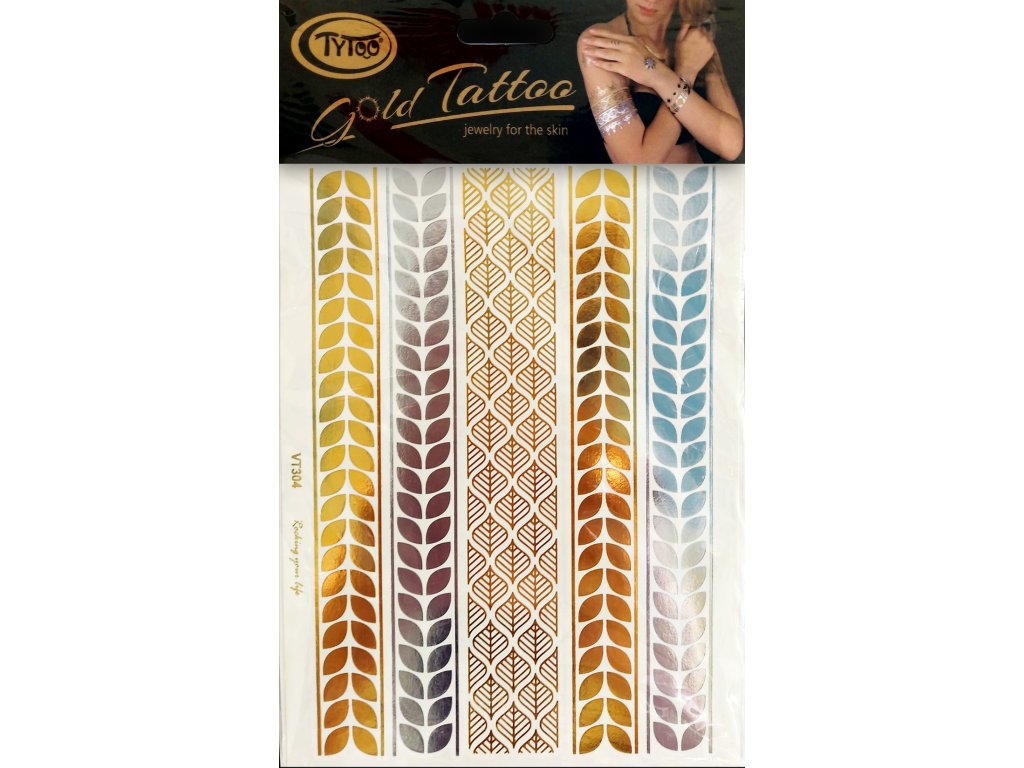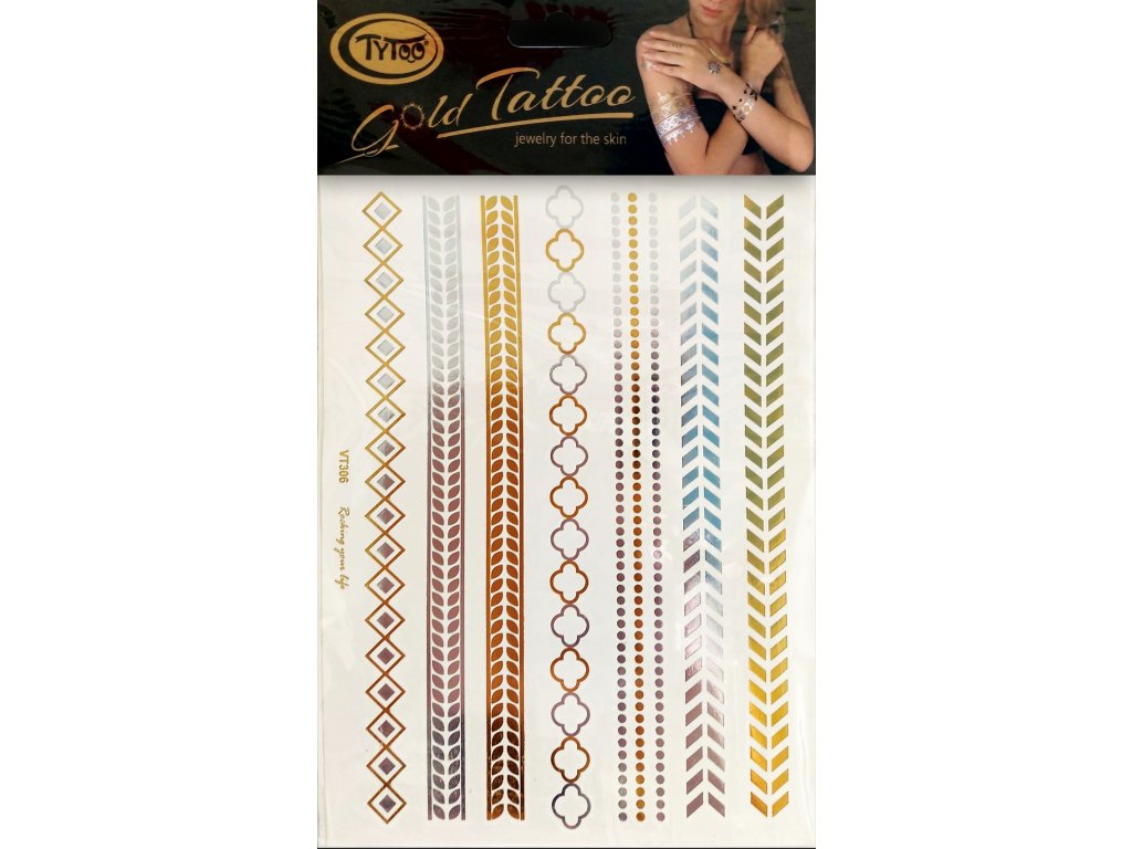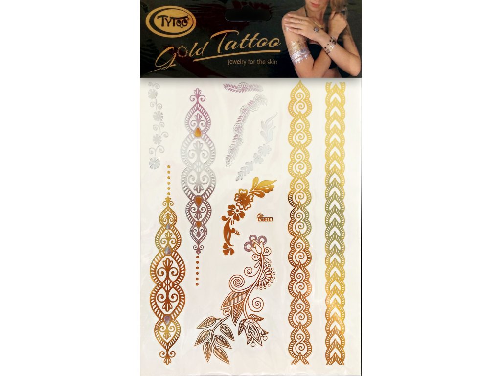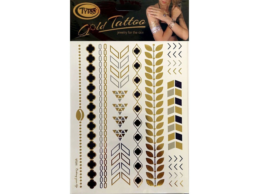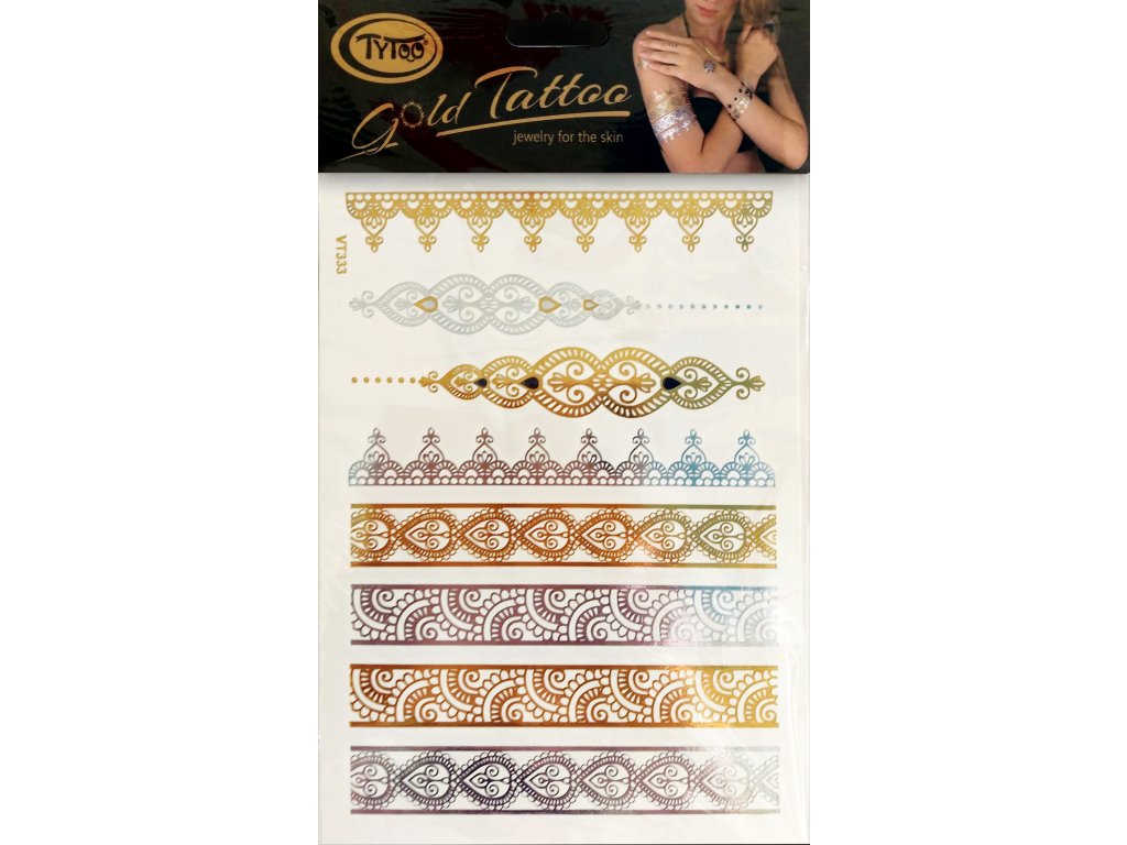 Zlaté tetování je klenot vaší pokožky. Tetovací náramky můžete použít na zápěstí, paži či okolo kotníku. Vytvořte speciální zlaté tetování během několika sekund! Trvanlivost: 2-7 dní v závislosti na typu pleti a použití! Tetování je odolné vůči vodě, dá se však lehce odstranit alkoholem nebo dětským olejíčkem. Velikost archu je 21x15 cm. Vhodné od 3 let.