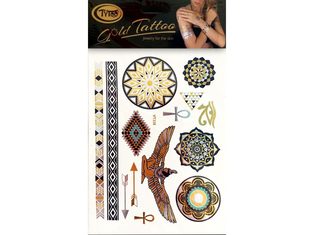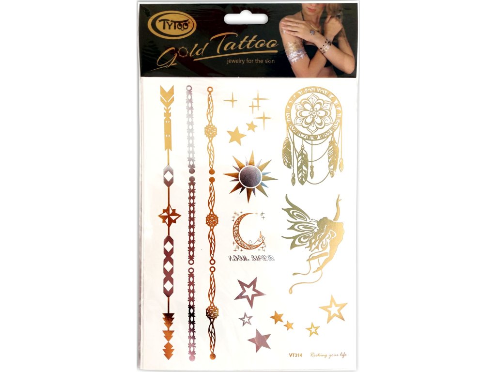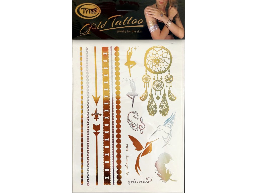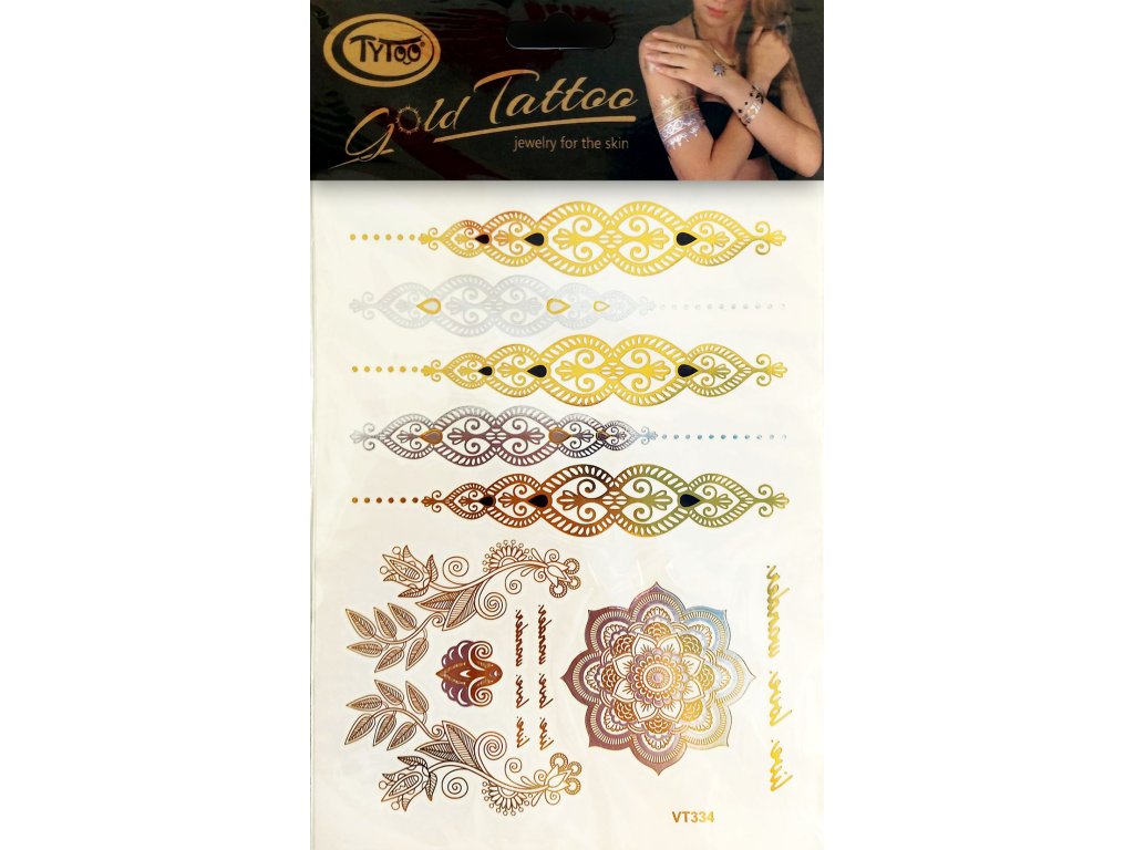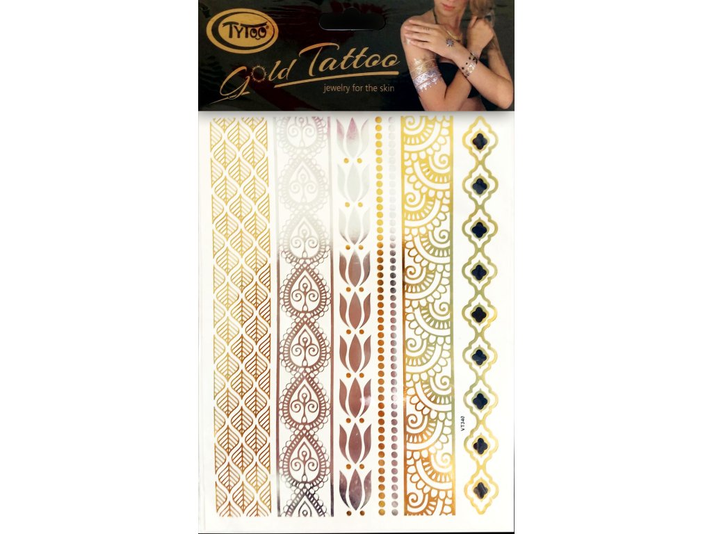 Zlaté tetování je klenot vaší pokožky. Tetovací náramky můžete použít na zápěstí, paži či okolo kotníku. Vytvořte speciální zlaté tetování během několika sekund! Trvanlivost: 2-7 dní v závislosti na typu pleti a použití! Tetování je odolné vůči vodě, dá se však lehce odstranit alkoholem nebo dětským olejíčkem. Velikost archu je 21x15 cm. Vhodné od 3 let.