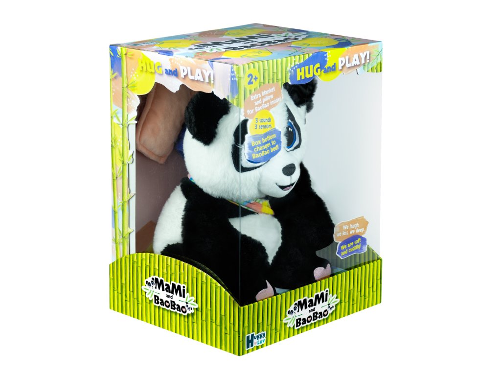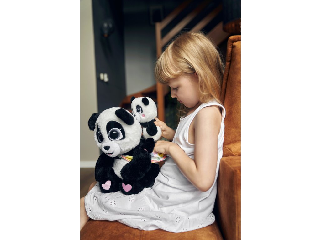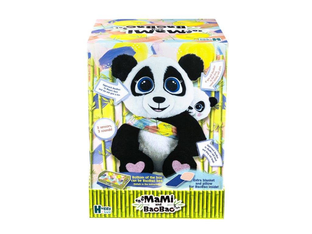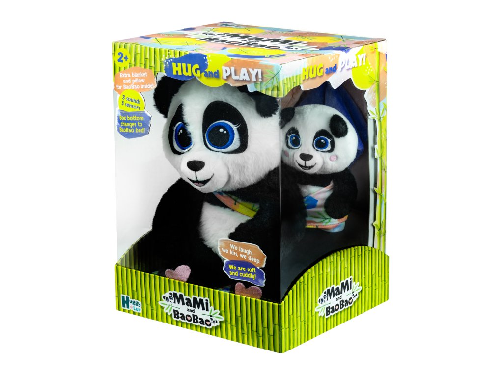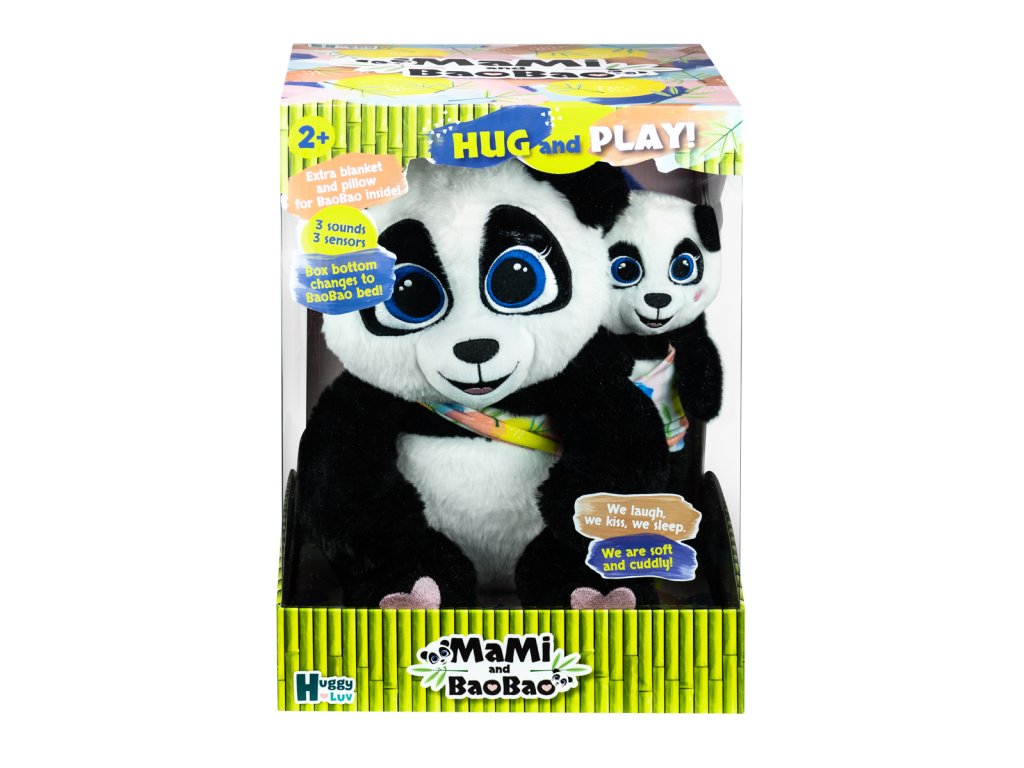 Roztomilé interaktivní pandy Mami a BaoBao. 2 plyšové hračky (maminka a miminko)se zvuky a senzory (bez pohybu) Pandy vydávají 3 různé zvuky:Když je miminko položeno na záda maminky, začne hrát ukolébavkaKdyž se miminko přiblíží k obličeji maminky – ozve se zvuk polibku Když se miminko přiblíží k jedné z rukou maminky (lechtání) - ozve se smíchSpodní část obalu je určena ke hraní - představuje postel. Balení také obsahuje dečku pro miminko.Doporučený věk: Výška: maminka 29cm, miminko 20cm