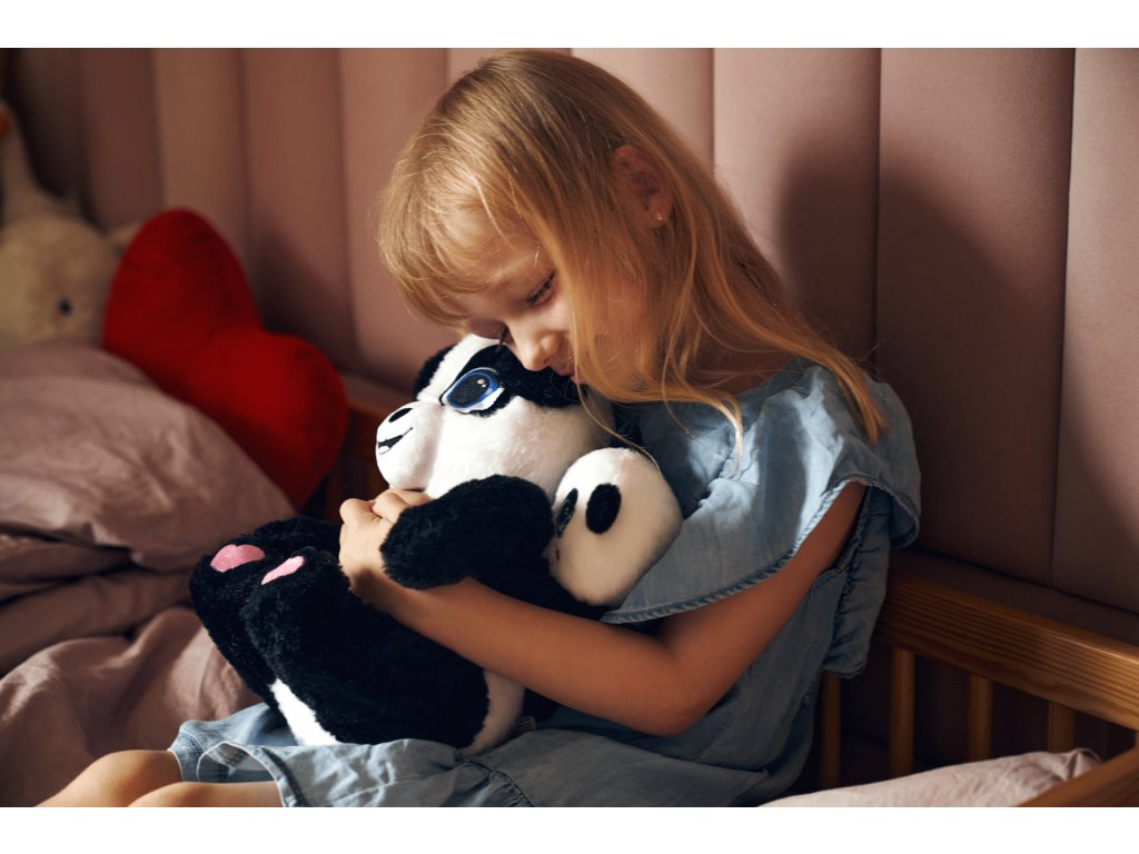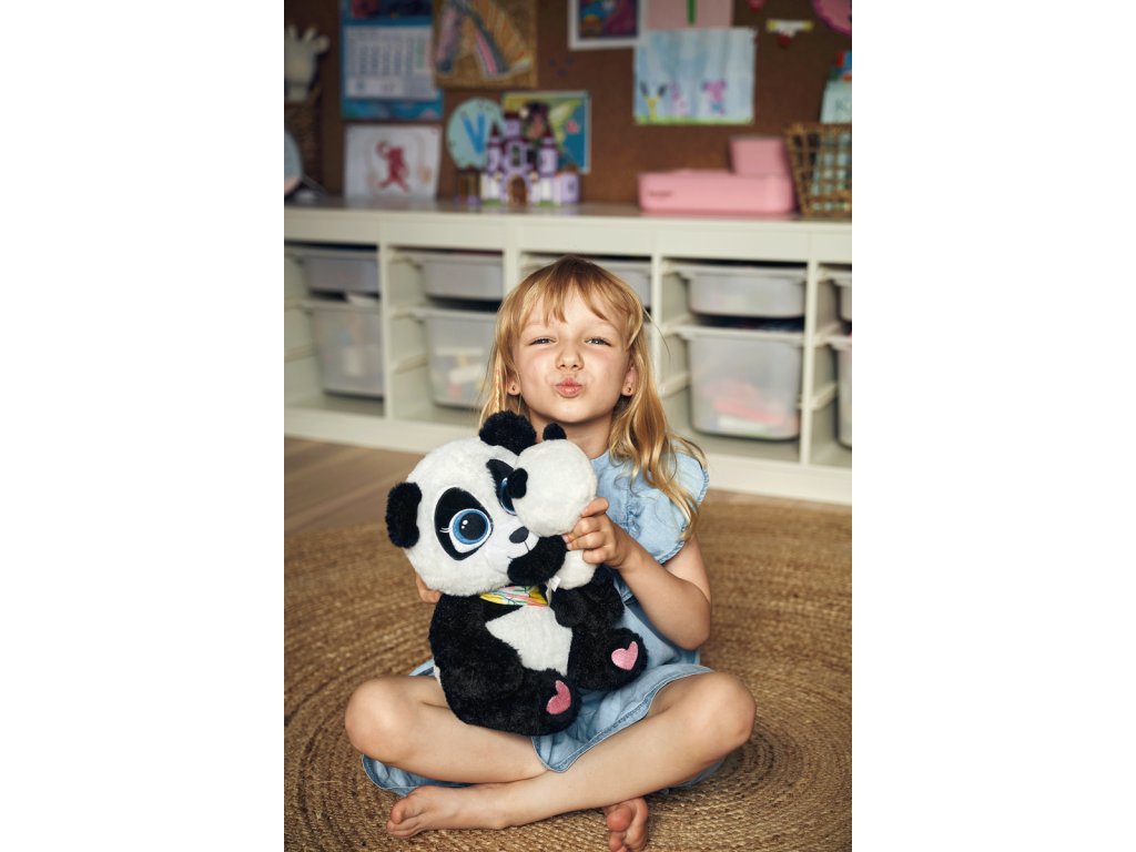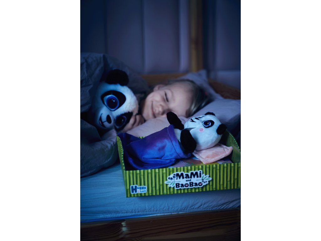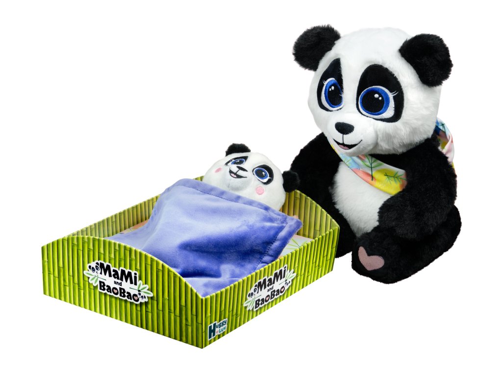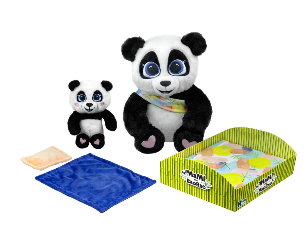 Roztomilé interaktivní pandy Mami a BaoBao. 2 plyšové hračky (maminka a miminko)se zvuky a senzory (bez pohybu) Pandy vydávají 3 různé zvuky:Když je miminko položeno na záda maminky, začne hrát ukolébavkaKdyž se miminko přiblíží k obličeji maminky – ozve se zvuk polibku Když se miminko přiblíží k jedné z rukou maminky (lechtání) - ozve se smíchSpodní část obalu je určena ke hraní - představuje postel. Balení také obsahuje dečku pro miminko.Doporučený věk: Výška: maminka 29cm, miminko 20cm