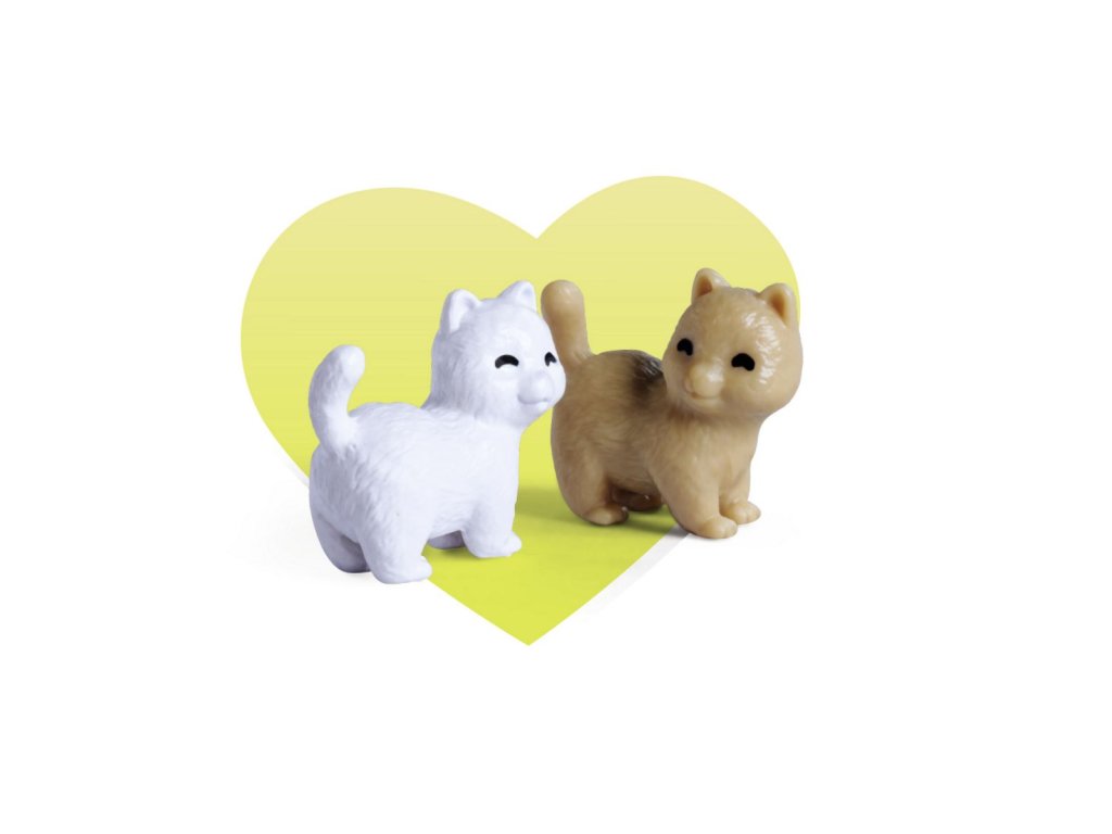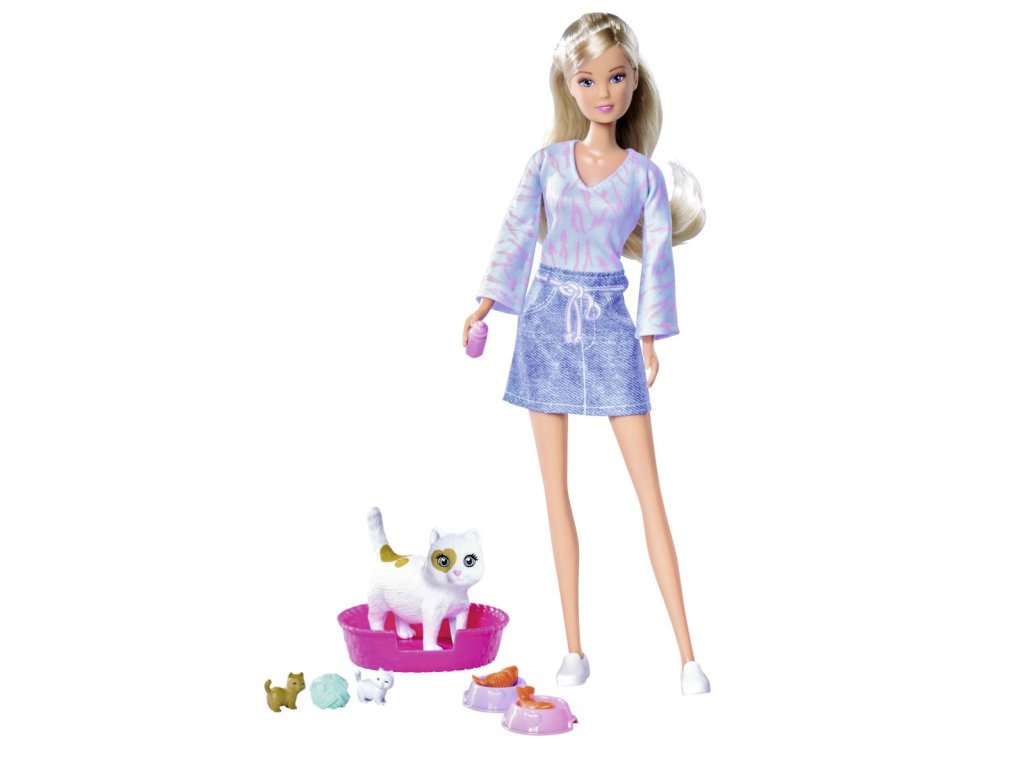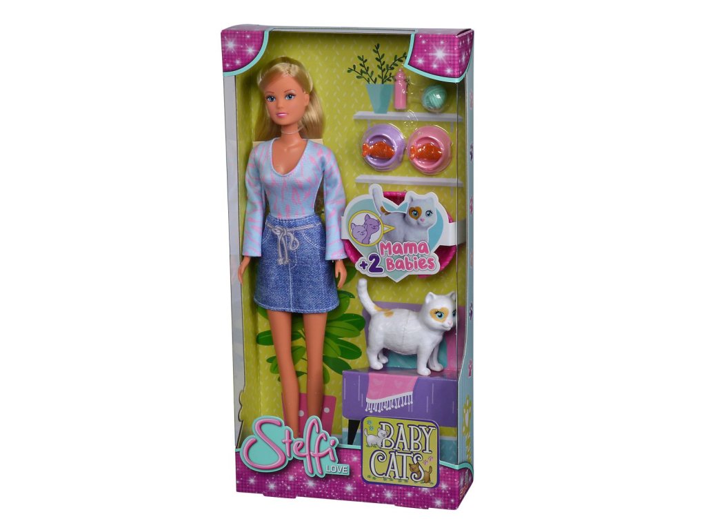 Panenka Steffi s kočičkou s dvěmi malými koťátky a příslušenství - misky, jídlo, lahvička, klubíčko, pelíšek. Velikost panenky 29 cm.