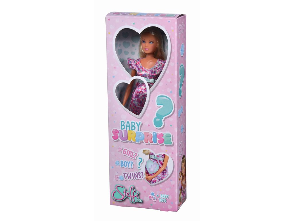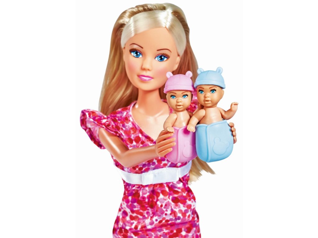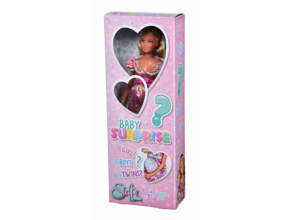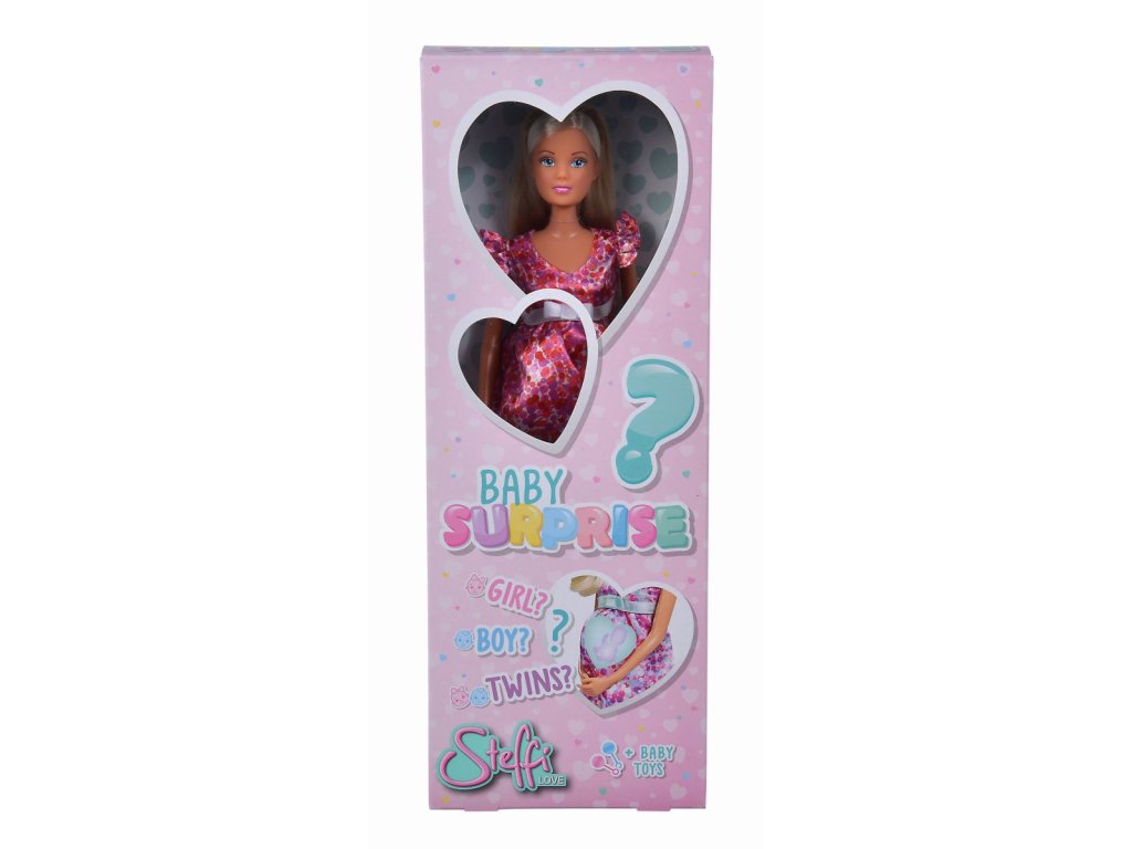 Těhotná panenka Steffi s dítětem jako překvapení a s více než 11 doplňky. Bude to chlapeček, holčička nebo dvojčátka? Velikost panenky 29 cm.