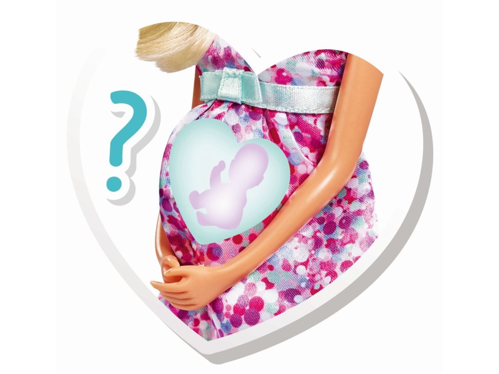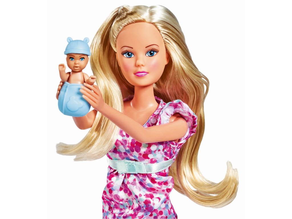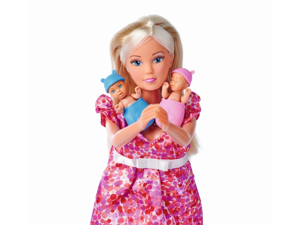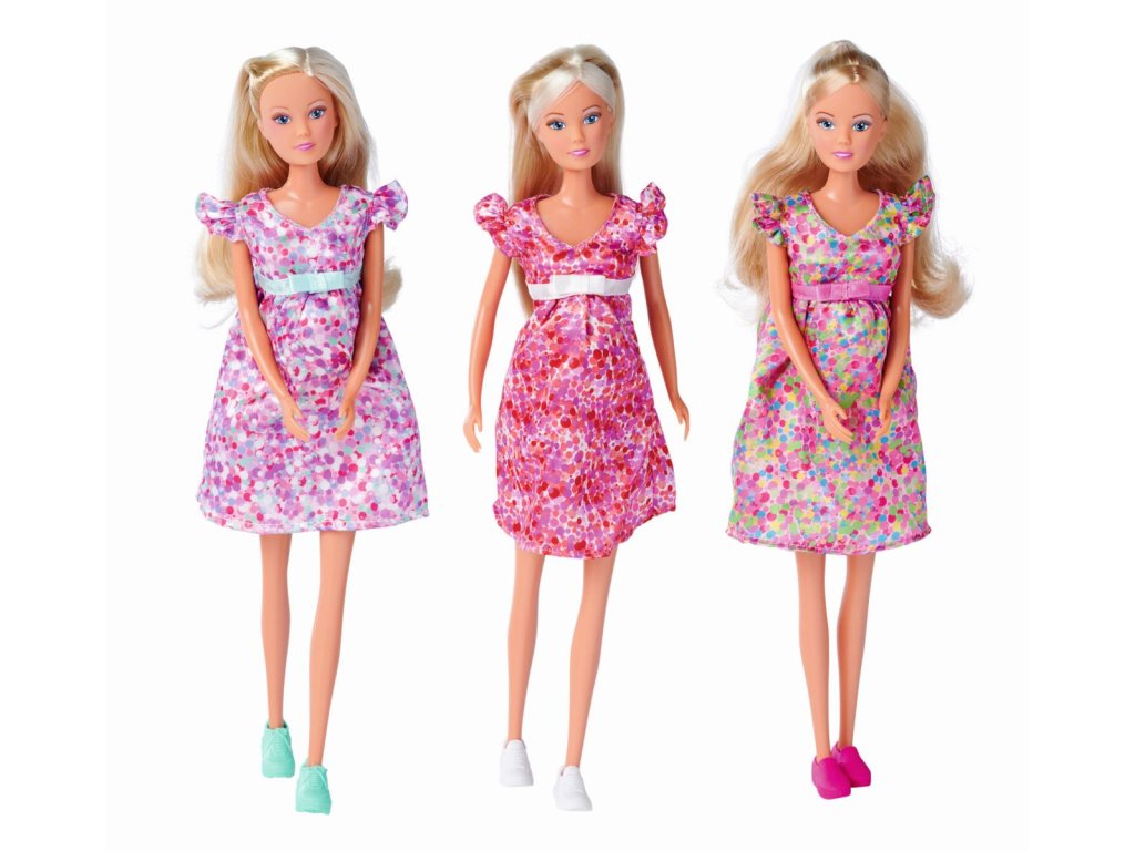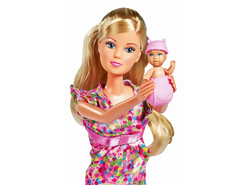 Těhotná panenka Steffi s dítětem jako překvapení a s více než 11 doplňky. Bude to chlapeček, holčička nebo dvojčátka? Velikost panenky 29 cm.