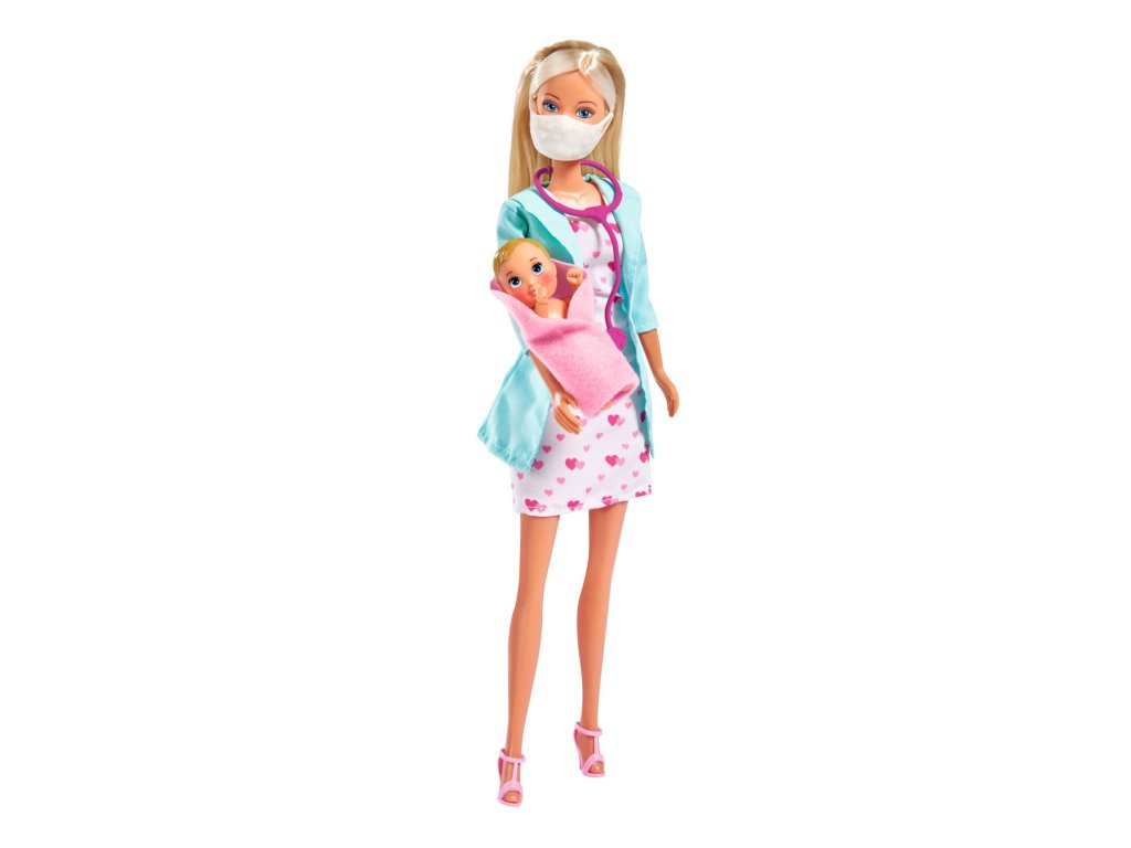 Panenka Steffi jako dětská lékařka se zdravotnickou obličejovou maskou a spoustou doplňků. Součástí miminko, kterému se při teplotě nad 31°C mění zbarvení tváří. Velikost panenky 29 cm.