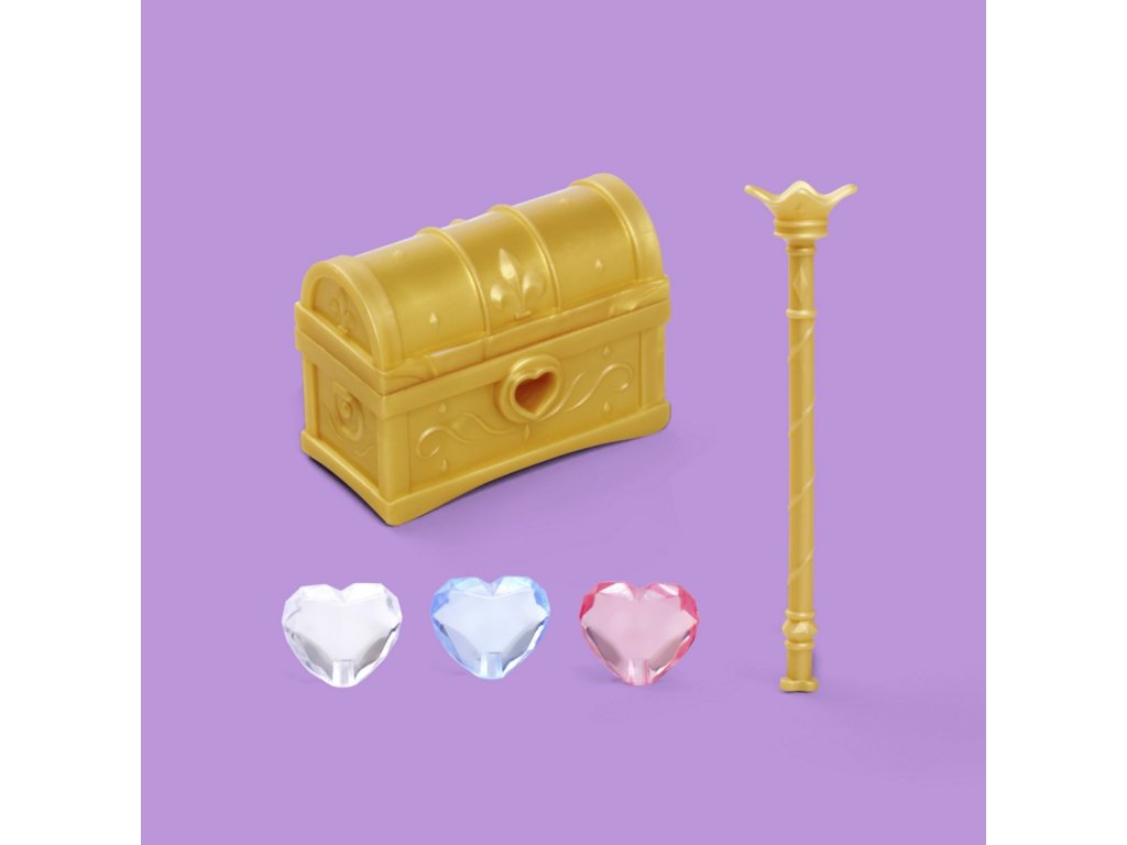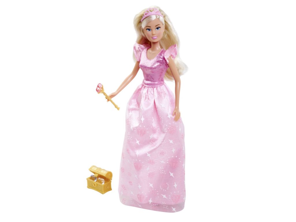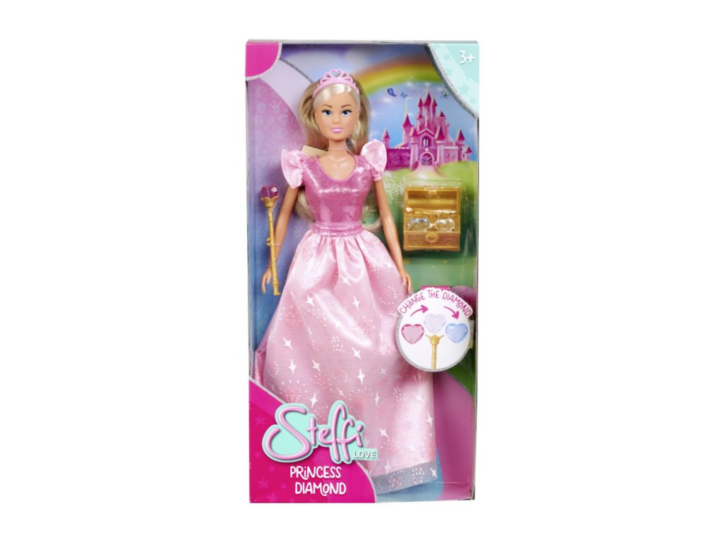Panenka Stefii jako diamantová princezna s truhlou plnou diamantů a žezlem. Výška panenky 29 cm.