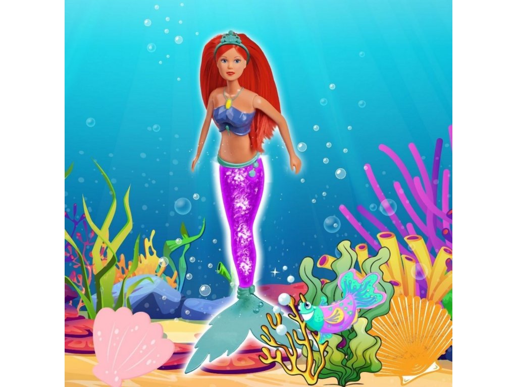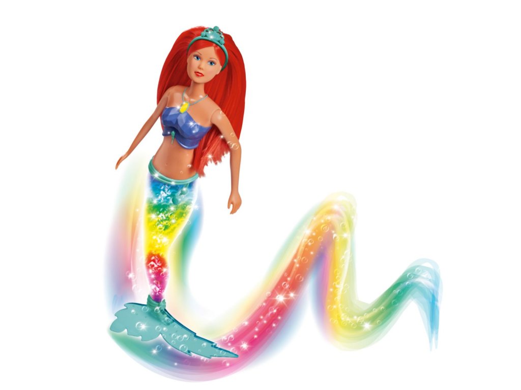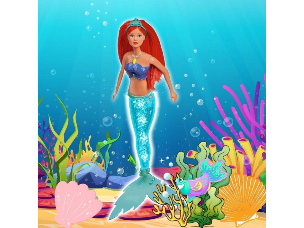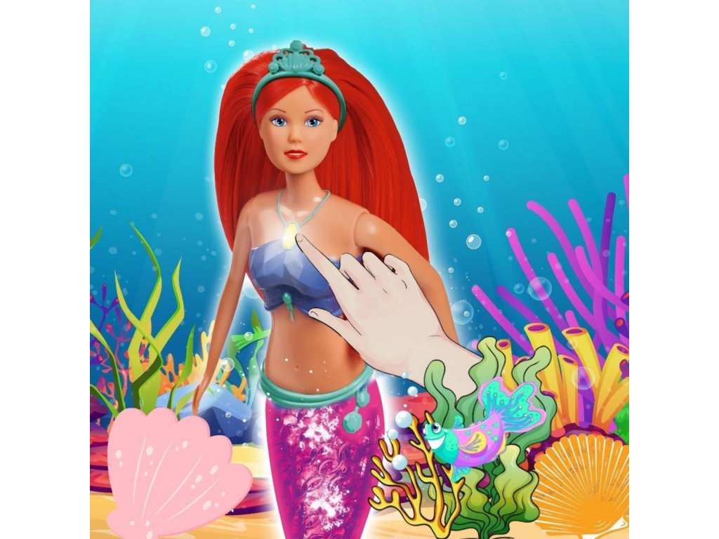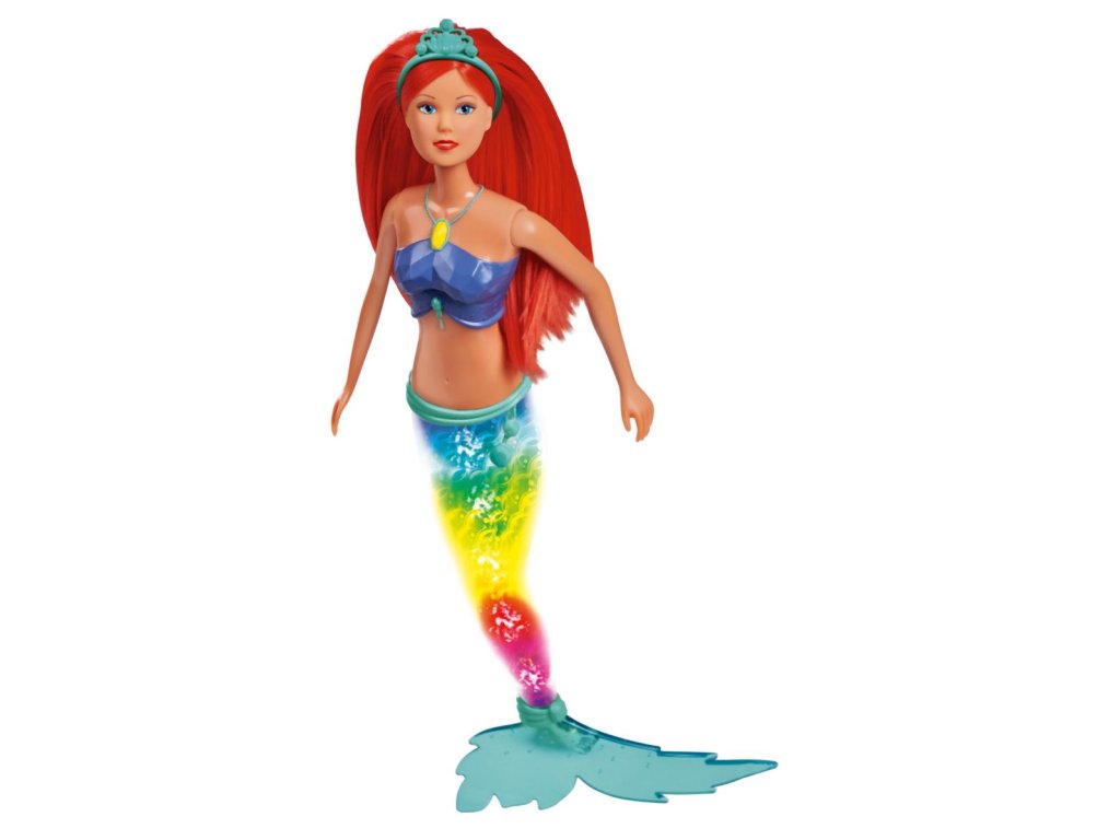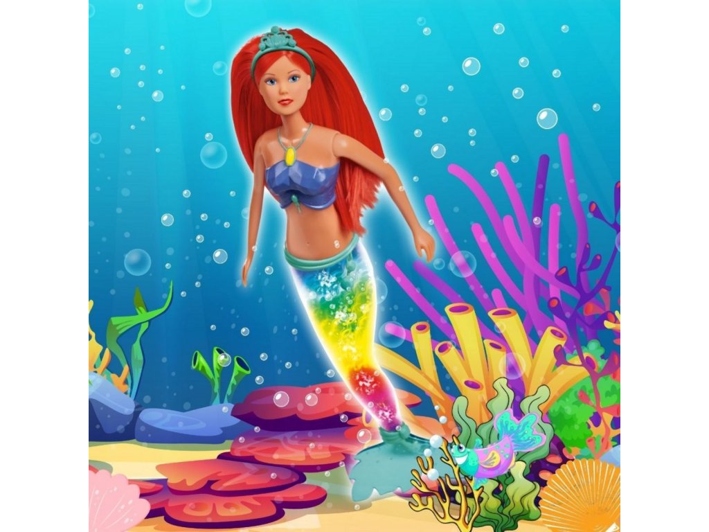 Panenka Steffi jako mořská víla s kouzelnou duhovou světelnou ploutví, voděodolná. Výška panenky 39 cm.