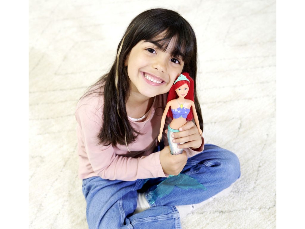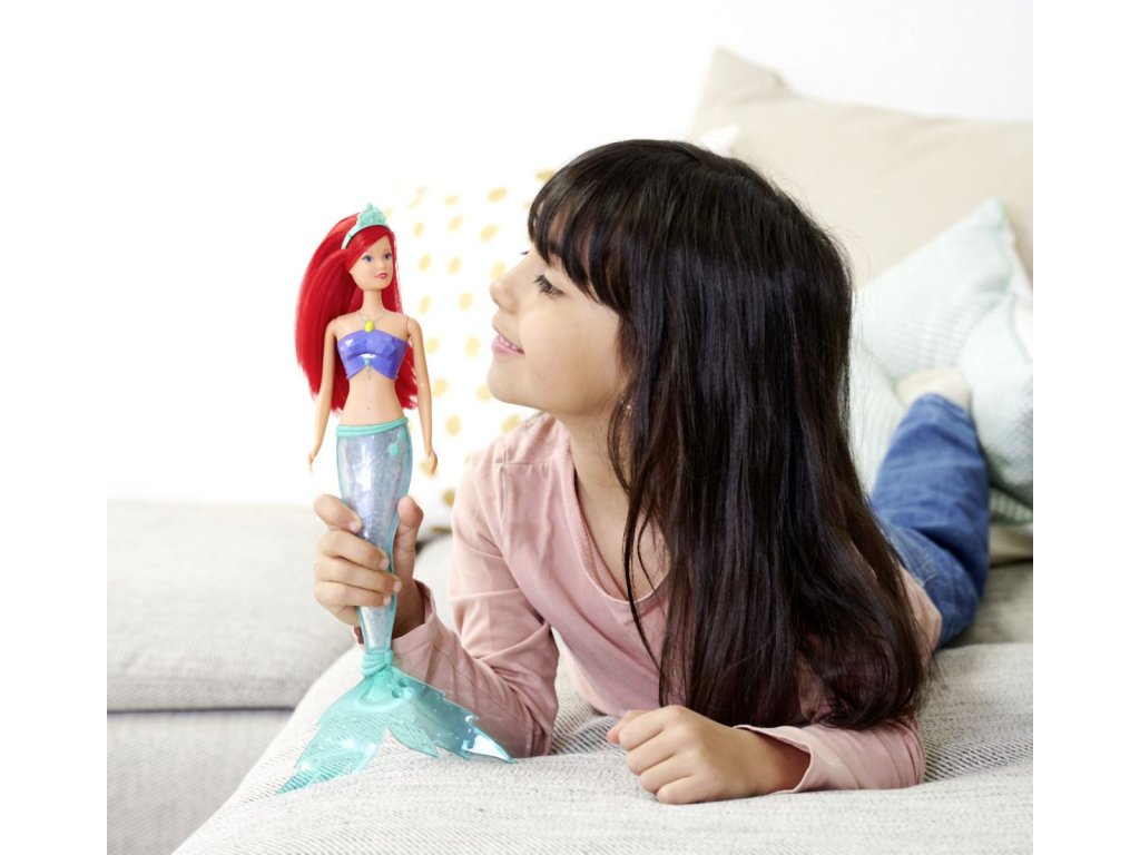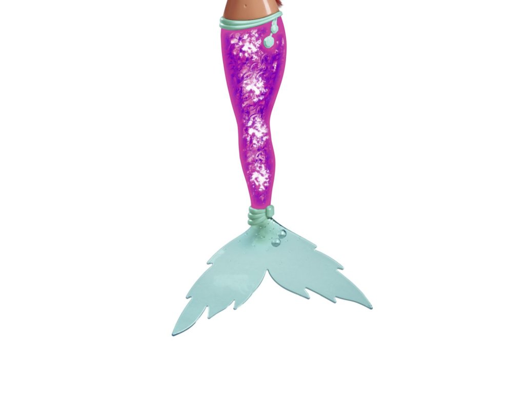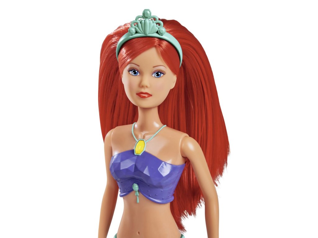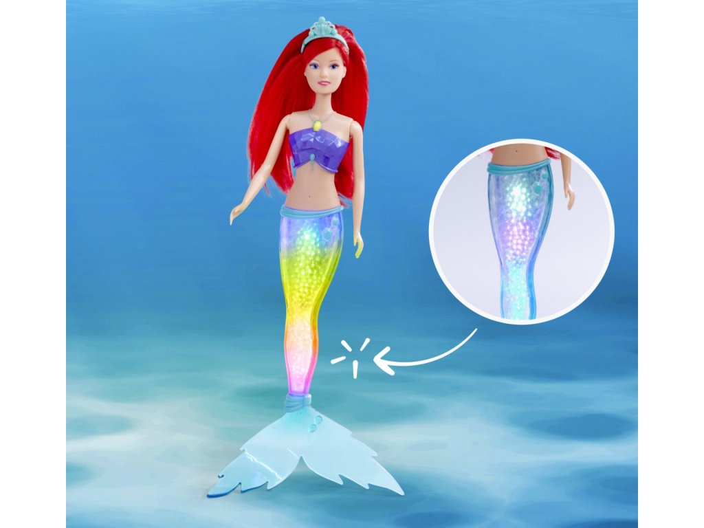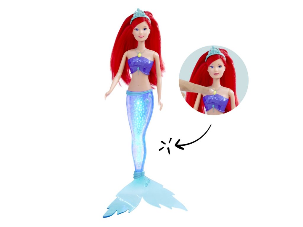 Panenka Steffi jako mořská víla s kouzelnou duhovou světelnou ploutví, voděodolná. Výška panenky 39 cm.