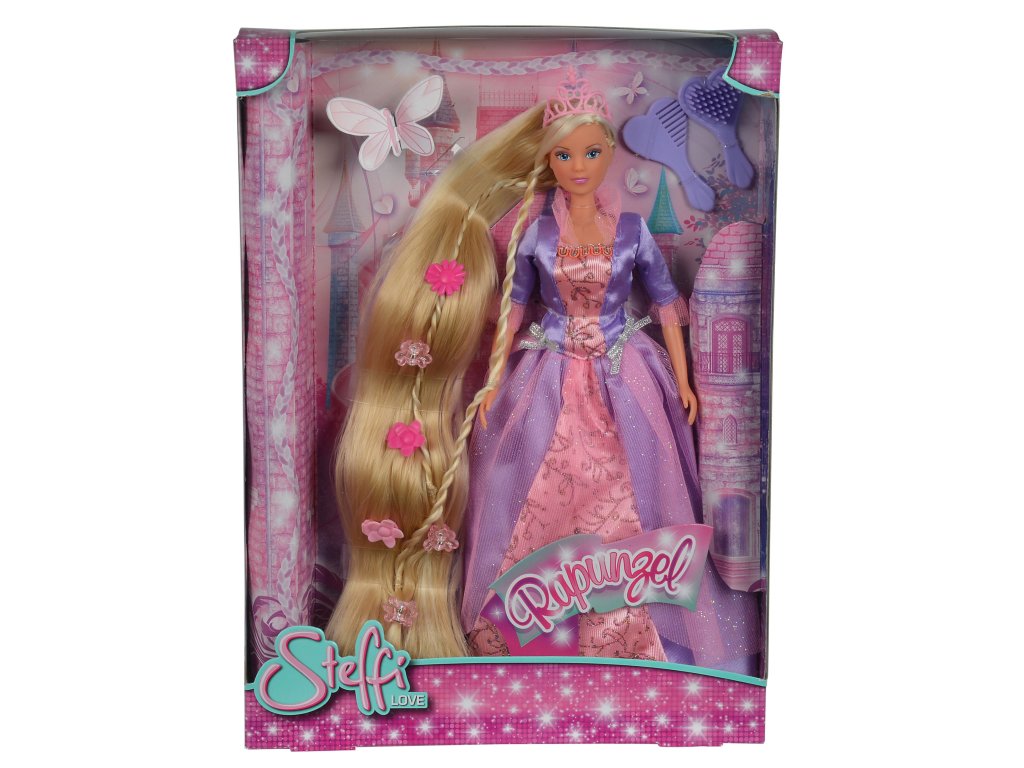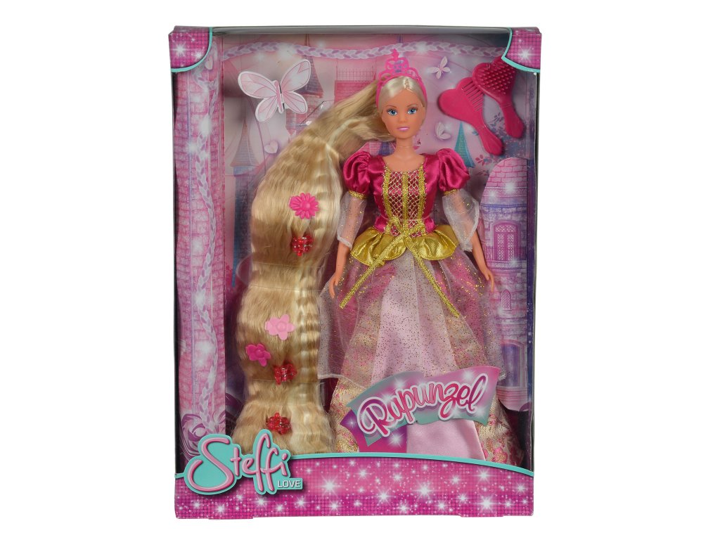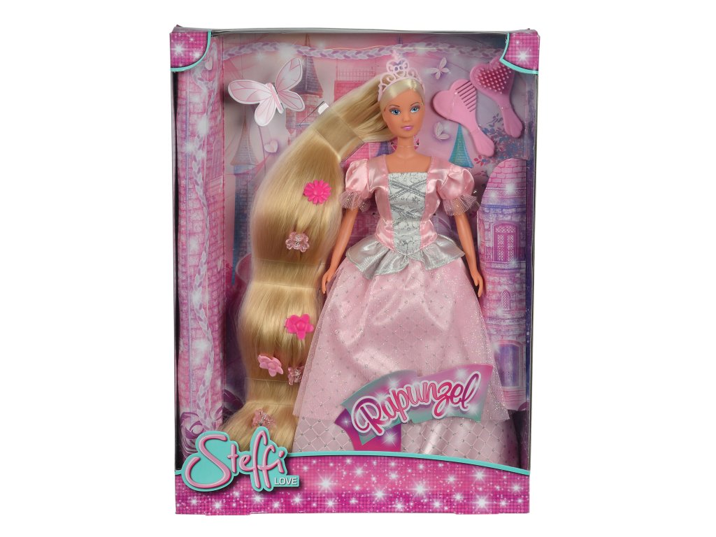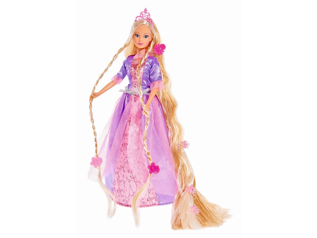 Princezna v krásných společenských šatech, s dlouhými vlasy.