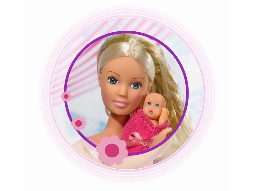 Panenka Steffi - těhotná, s miminkem v bříšku. Bříško panenky lze otevřít a vyndat malé miminko. Součástí 13 ks příslušenství pro miminko.