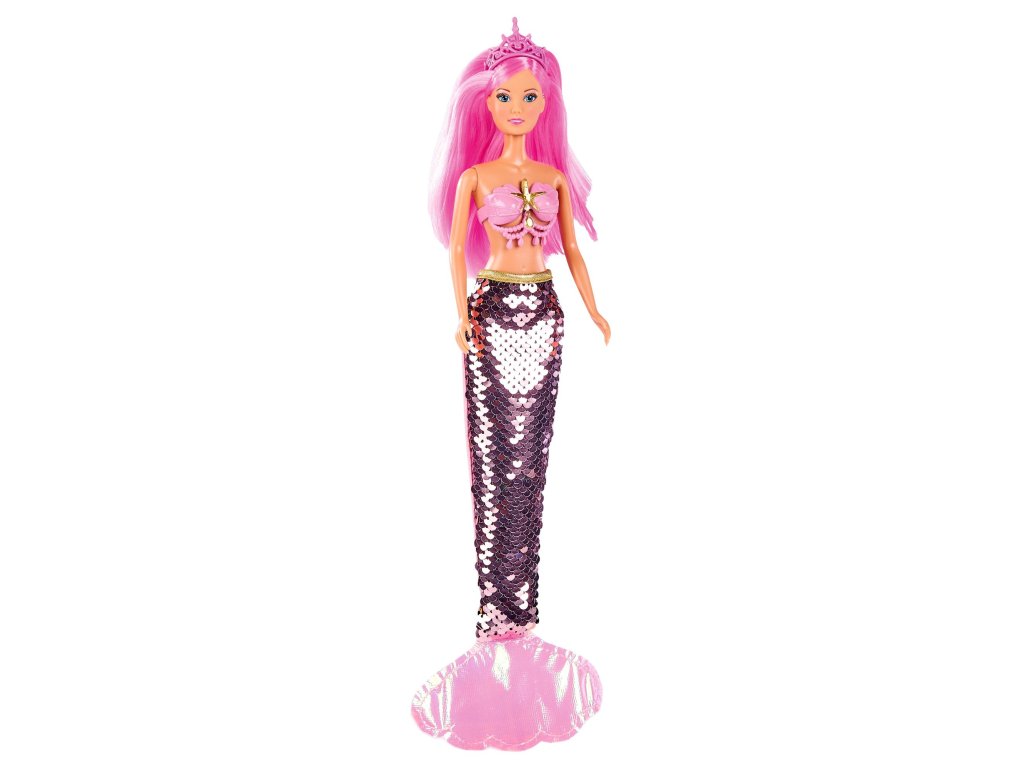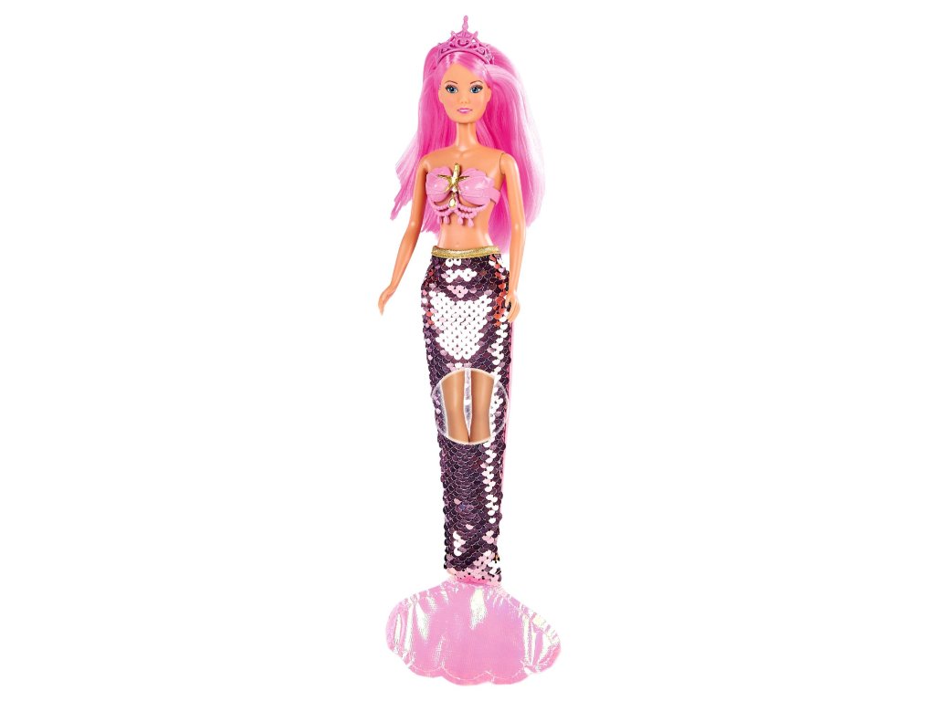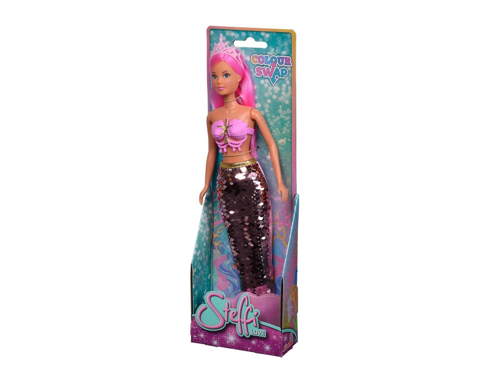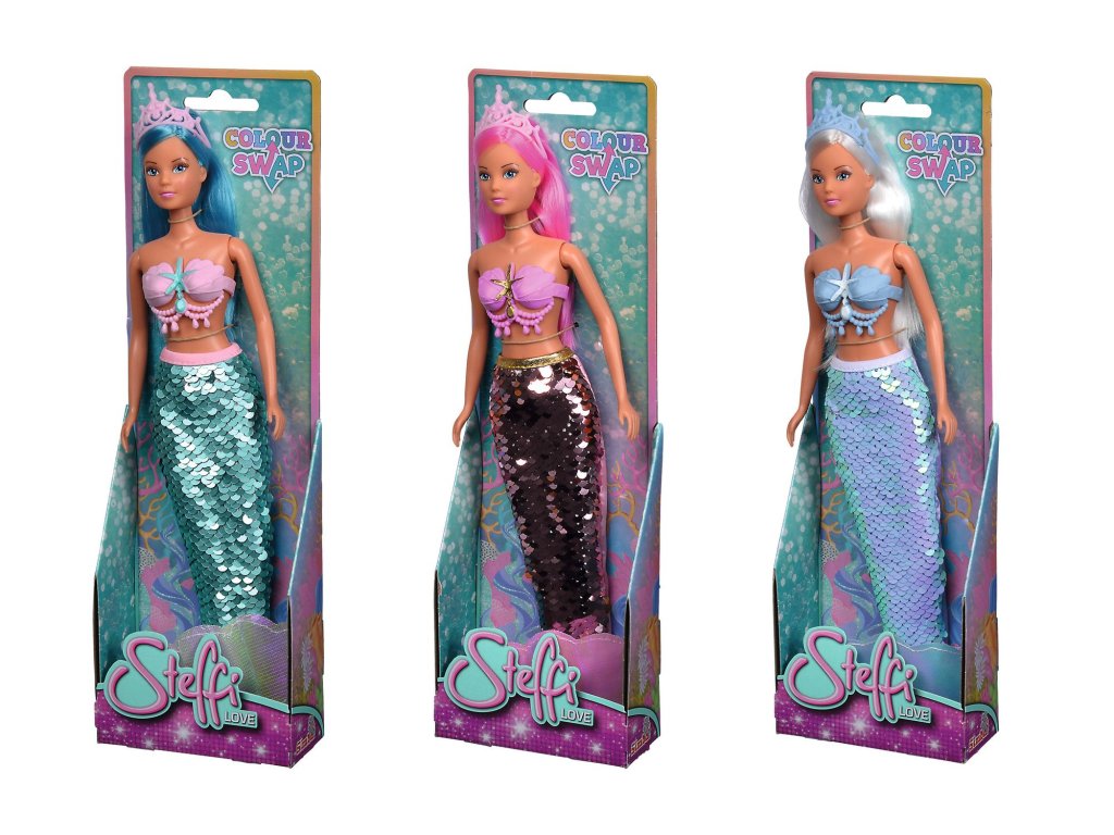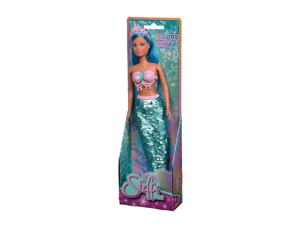 Panenka Steffi jako mořská panna s ploutví z barevných flitrů se swap efektem. Velikost panenky 29 cm.
